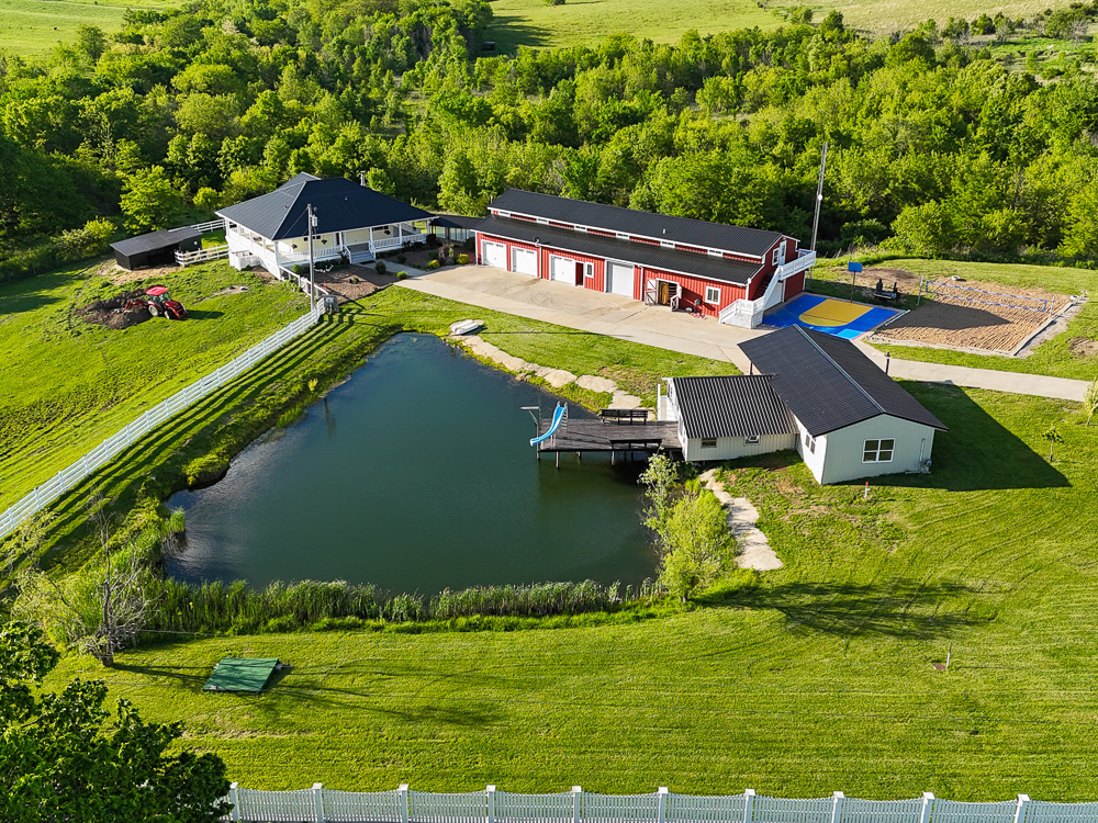 Price: $849,900 Acreage: 13.5 County: Appanoose State: IAWelcome to this truly one-of-a-kind, gated 13.5 acre retreat just minutes from Rathbun Lake Marina. The 3,200 square foot custom-built ranch home (2009) offers 4 bedrooms and 4 bathrooms with a fully finished basement and standout craftsmanship throughout, including custom cabinetry, unique crown molding, and high-end finishes. Enjoy the outdoors from the incredible 360-degree wraparound porch featuring three porch swings, or relax year-round in the swim spa. The private pond is an entertainer’s dream with a deck leading into 15 feet of depth, complete with a slide and high dive, creating a true resort-style experience right at home. This property is exceptionally well-suited for income production and short-term rental potential near one of Southern Iowa’s top recreational destinations. The 2,600 square foot barn features a nearly fully furnished 1 bed, 2 bath apartment plus a second high-efficiency open-concept apartment-style suite with a mini kitchen - ideal for Airbnb, bachelor rentals, or long-term tenants. With fiber optic internet in both the main home and barn, renters and guests stay fully connected. Located just 5 miles from Rathbun Lake Marina, 6 miles from Centerville, and less than one mile from Highway 5, this property offers the ideal balance of privacy, accessibility, and income opportunity. Outdoor enthusiasts and hunters will appreciate the timbered trails winding through mature oak and walnut trees, abundant wildlife, and a natural stream providing a consistent water source. Deer are plentiful, making this an excellent recreational and hunting property. Adding even more character and entertainment value is the custom-built cabana featuring a handcrafted bar, pool table, rare wood accents, and antique décor, along with 10-foot-tall exterior storage. The barn offers concrete floors, space for storage or livestock, and a classic hand-pump-style water feature in the cattle area. The partially fenced acreage provides flexibility for recreation, expansion, or hobby farming, all with no zoning restrictions - perfect as a luxury rural residence, private retreat, or cash-flowing investment near Rathbun Lake.