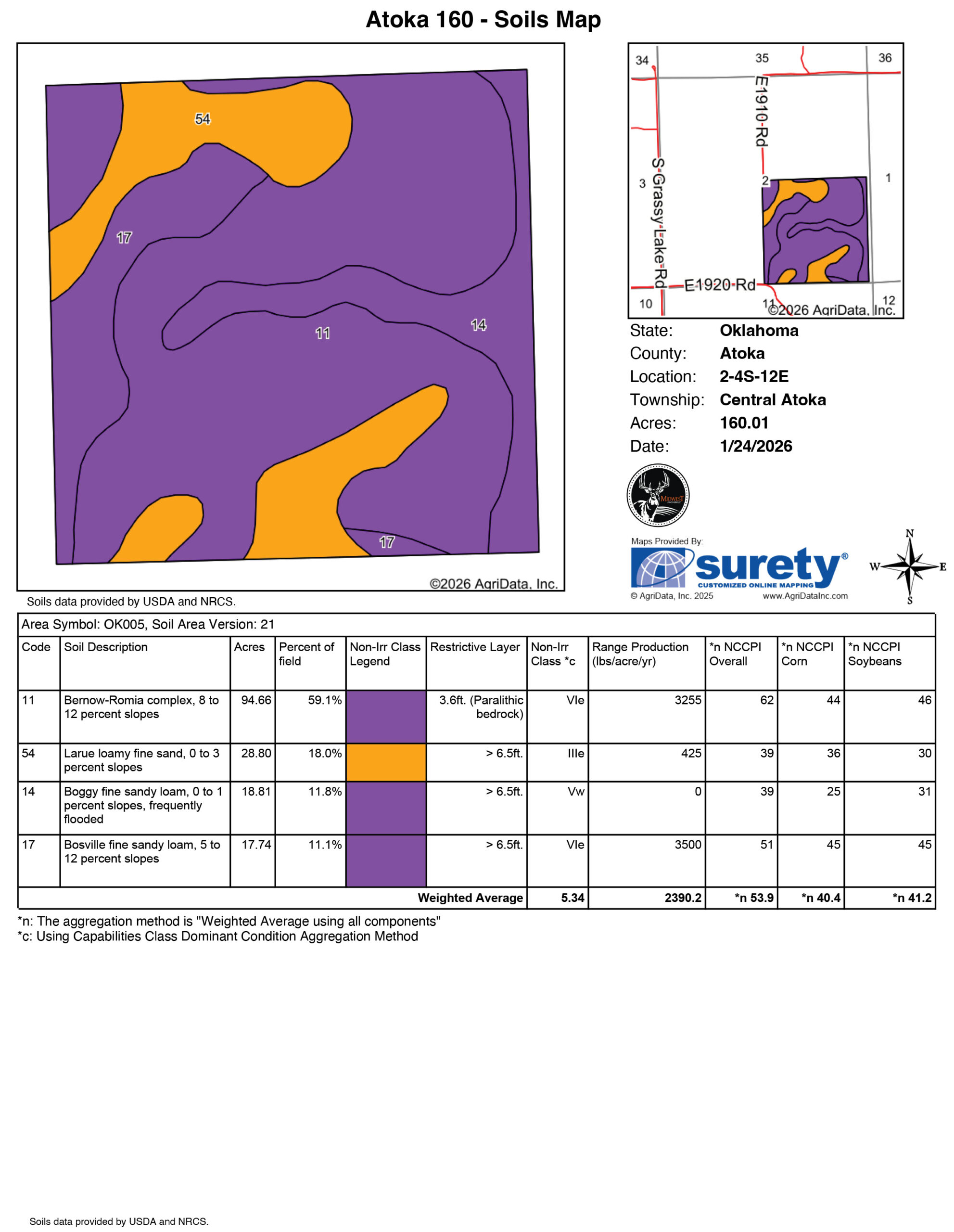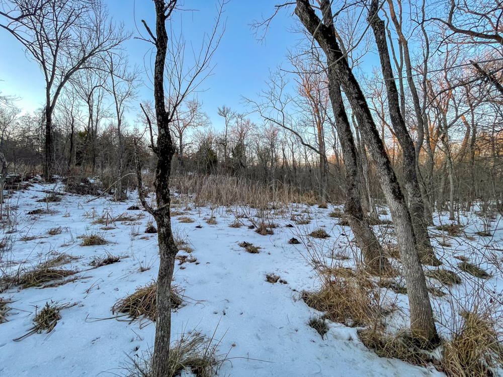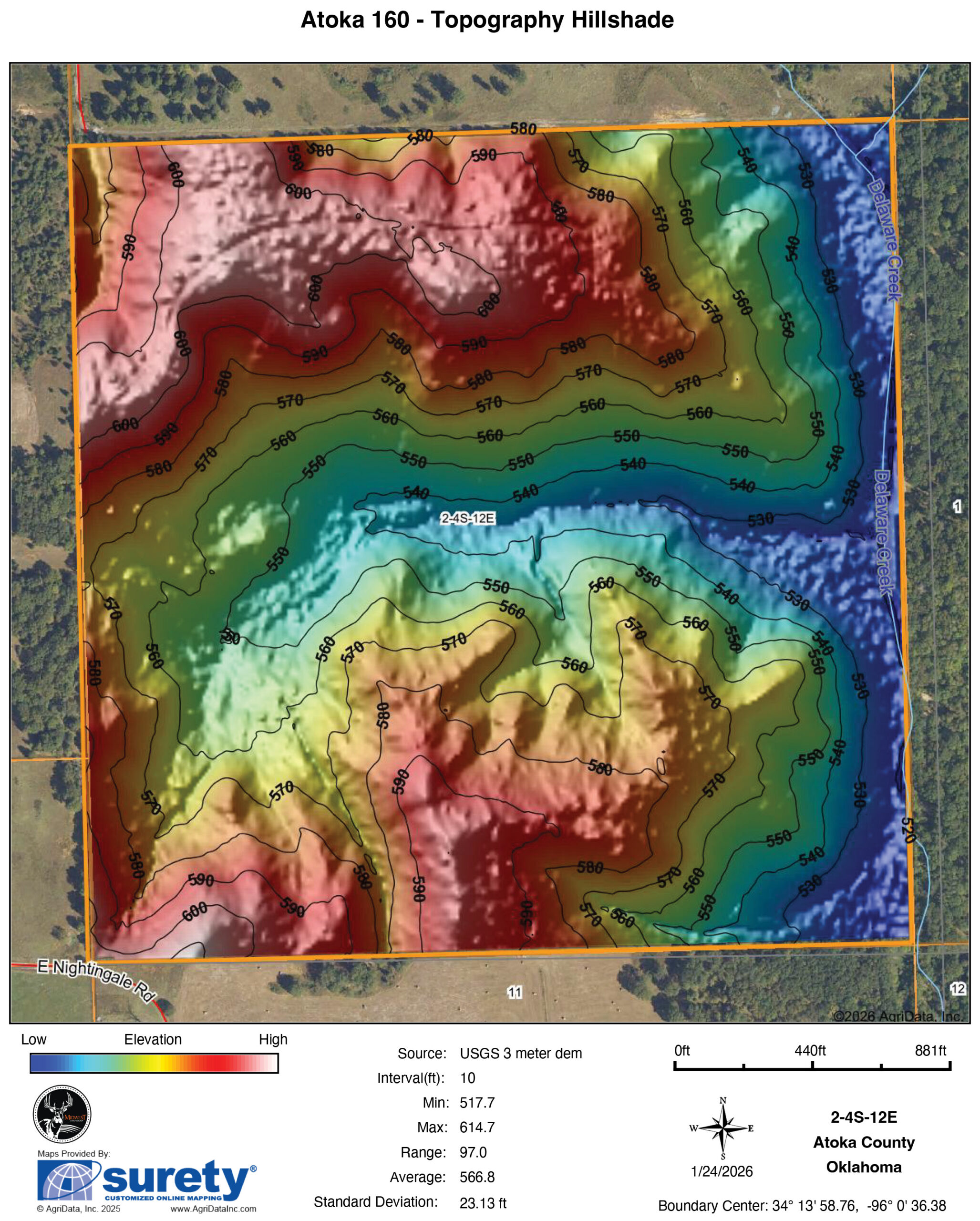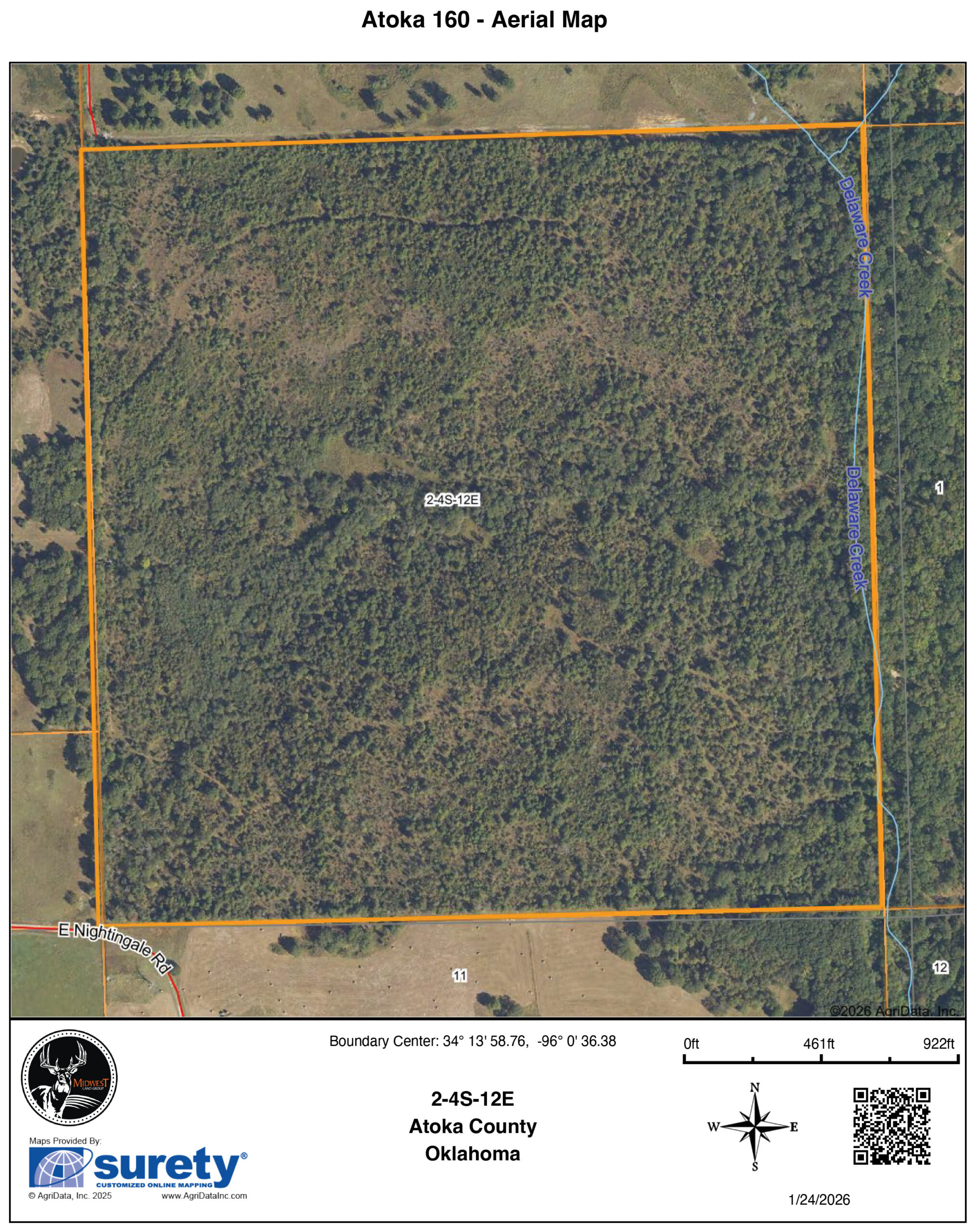 This Atoka 160 is a hunter’s property through and through — built by time, water, and intentional disturbance to grow and hold mature whitetails. Years ago, selective timber harvest created high stem-count regrowth across portions of the property, forming some of the thickest bedding cover you’ll find in this part of the county. That dense security cover, paired with towering, mature mast trees left intact along the creek bottoms, creates the kind of diversity serious deer managers look for. Heavy deer sign throughout confirms what the habitat already promises.Over 2,000 feet of live, year-round frontage on Delaware Creek anchors the property and serves as a natural travel corridor for big creek-bottom bucks. With approximately 80 feet of elevation change and 47 inches of average annual rainfall, the terrain funnels movement predictably while providing reliable water even in dry years. A centrally located drainage with a strong watershed offers an excellent pond-build site, adding future habitat and hunting value without sacrificing the low-pressure feel of the tract.