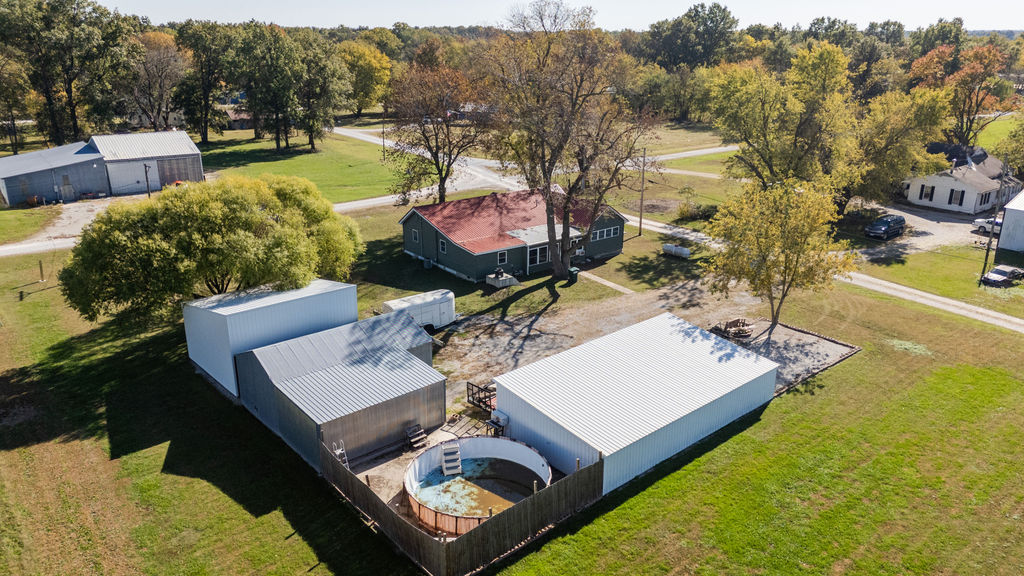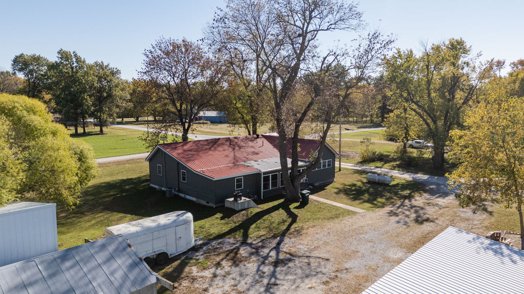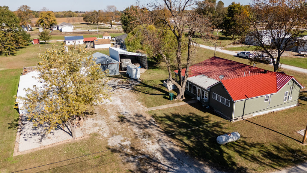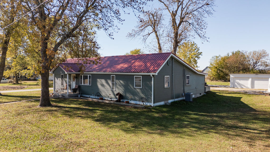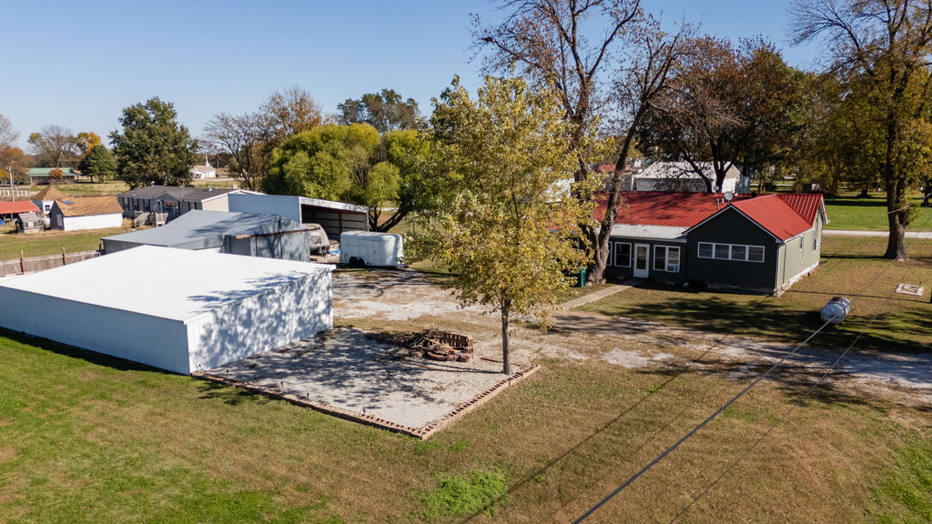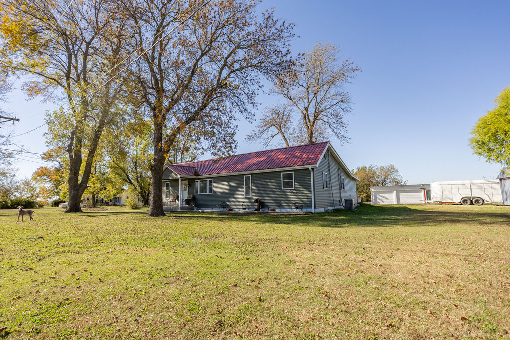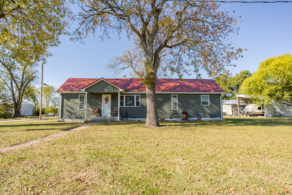 If you have been seeking a cozy home in a small town, look no further. With recent updates and renovations, it's the perfect place to retire, retreat, and relax in a small town setting. Walking in the back door, you are greeted by an enclosed porch with abundant sunshine and protection from the weather, providing year-round comfort. Once inside the house, you will find an updated kitchen with an island and plenty of room for a large dining table next to the west-facing windows. The large entry from the kitchen to the living room opens the space up for laughter between cooks and couch potatoes. A small adjoining room makes a great space for an office or a playroom for the little ones. The bathroom has been updated with a jet bathtub and shower, along with laminate wood flooring for durability. A spacious walk-in closet in the master bedroom provides ample room for large wardrobes, shoe collections, or a gun safe. Two more bedrooms with nice-sized closets are located across the hall, making this a great family home. A large laundry room makes weekly chores easier and provides a nice place to kick off muddy clothes when needed. The storm shelter next to the house is a great addition for safety when spring weather hits the Midwest.Outside, you will find a 3-bay garage that is perfect for the family with multiple drivers looking to keep their vehicles out of the elements. The newly built lean-to is a great place for a camper, tractor, mower, or boat to be stored. The 16’x30’ shop has electricity and protection from the weather, giving you the ability to accomplish projects year-round. Attached to the shop is a nice 12’x20’ insulated shed with electricity and a garage door, can someone say man cave! All of that on 1 acre still leaves room for football games, fire pits, and summer fun for the family.