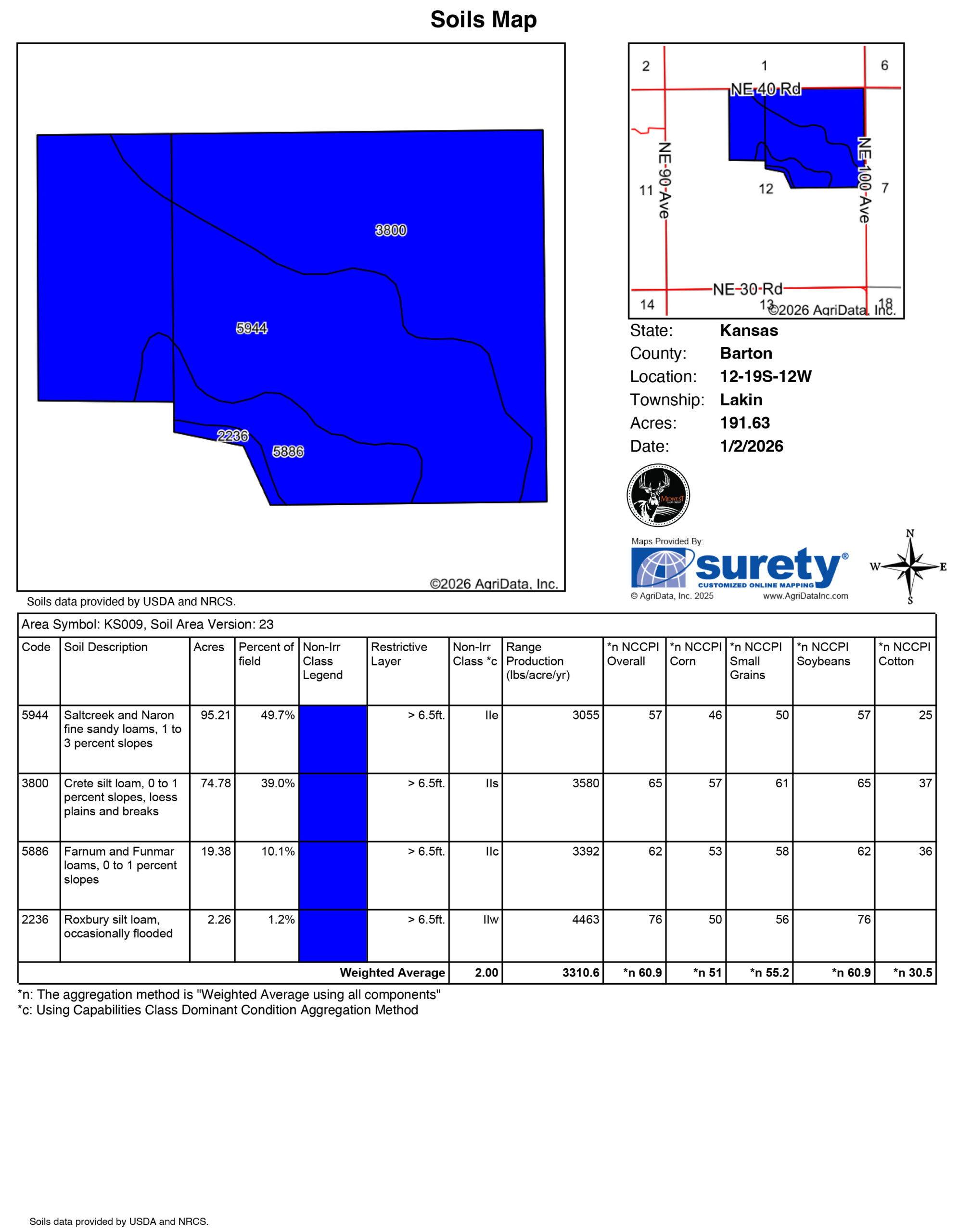 This 195 +/- acre property in Barton County offers a well-balanced combination of productive cropland, native pasture, and functional improvements. Located in the northeast quarter and part of the east half of the northwest quarter of Section 12, Township 19 South, Range 12 West, the property offers reliable production capability and diversified revenue streams attractive to both passive investors and active operators. The farm comprises of two tracts being sold together that create operational efficiency while allowing flexibility for future resale or leasing options.Tract 1 contains 40.79 +/- acres with facilities and is planted to wheat. Improvements include a 50'x51' round top shed built in 2003 and a 42'x100' pole barn built in 1973. These structures provide valuable infrastructure for equipment storage, hay storage, or rental storage potential. The presence of improvements adds functional value and reduces future capital investment needs for operators or tenants.