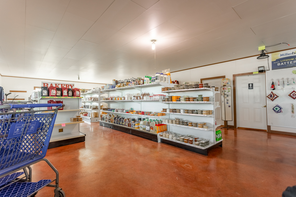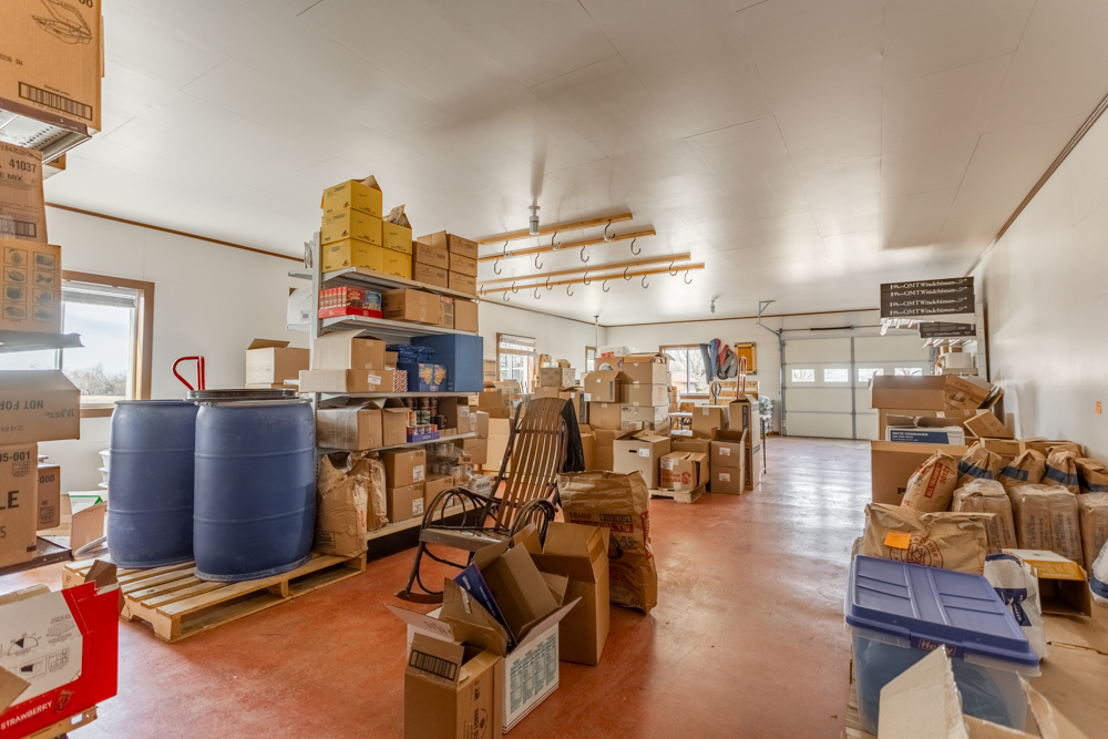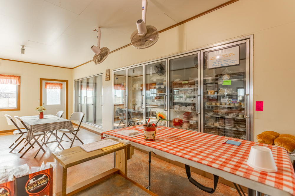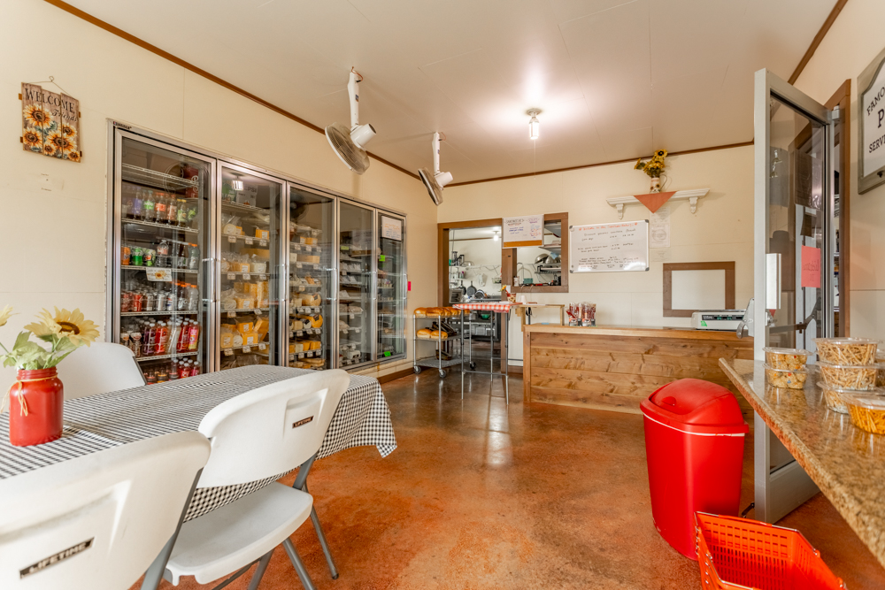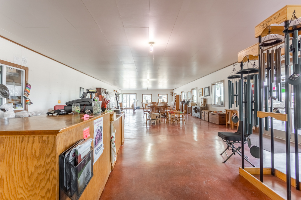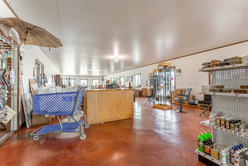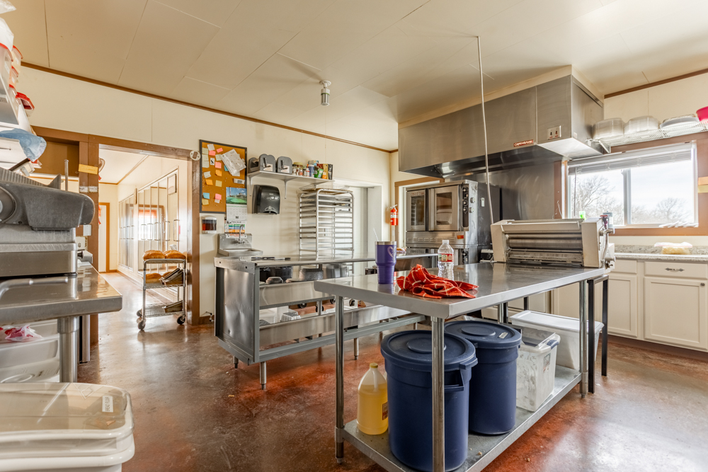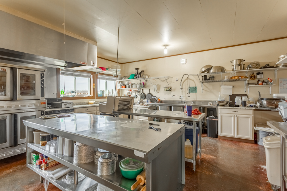 Inside is a large open floor plan with plenty of space to turn your dreams into a reality. The large back room could be used for inventory, office space, or extra seating for a restaurant. With a large overhead door on the north side, you could bring in oversize items for the showroom, bulk storage, or easy load-outs for work vehicles. There is a kitchen with a large hood vent, triple sink, grease trap, and extra space for ranges, fryers, ovens, and a prep area. Attached to the kitchen is a walk-in cooler and freezer, which double as a certified storm shelter when needed. A smaller room next to the kitchen gives current customers seating and access to a reach-in cooler space for on-the-go food and drinks. The 12’ concrete porch would be ideal for outside seating, covered storage, or a place to display outdoor furniture and equipment. The whole building is heated with radiant floors from a natural gas-powered boiler.