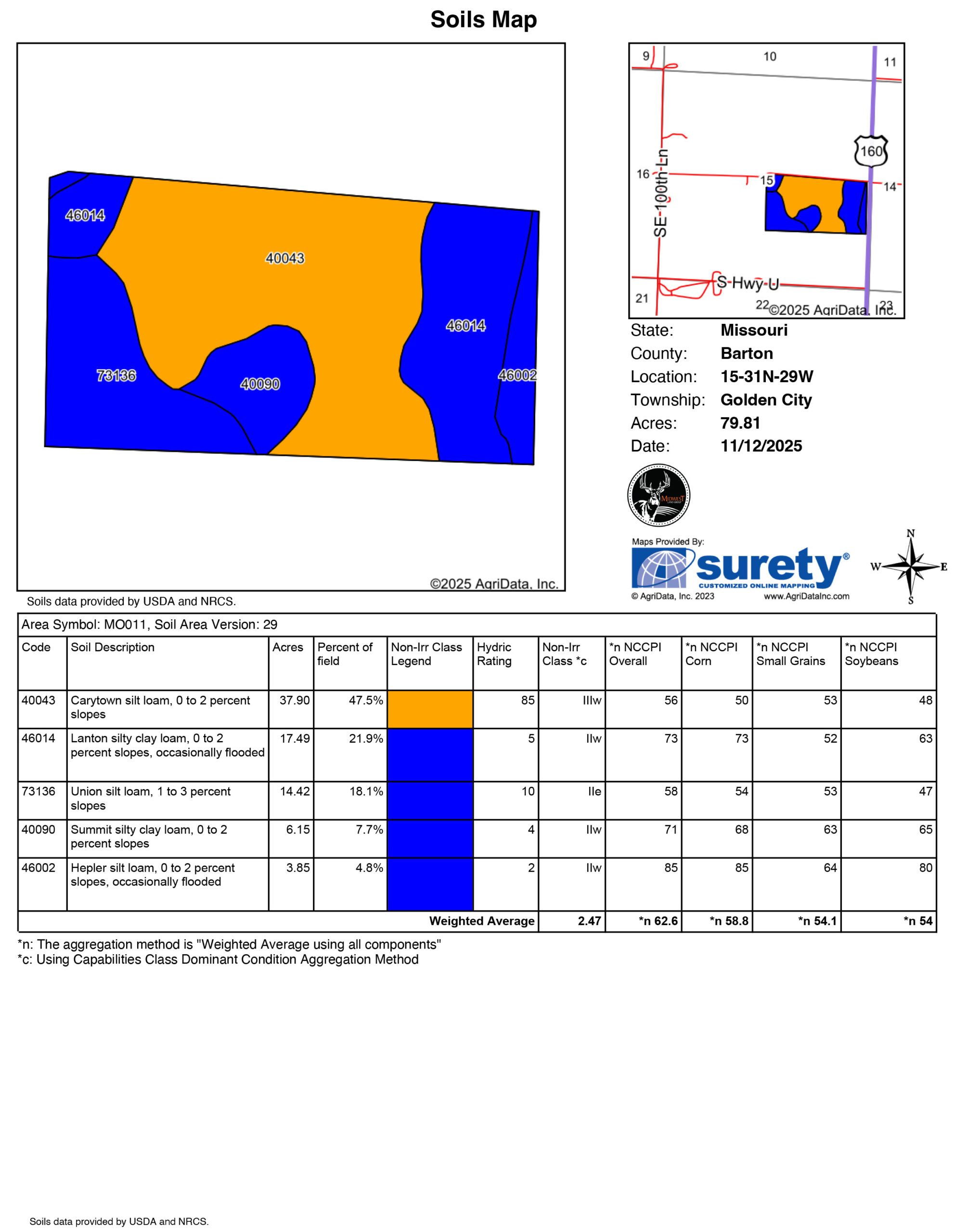 Great opportunity to own this Barton County 76.3 +/- acre farm just north of Golden City, Missouri. Consisting primarily of Class II and III soils (Union and Carytown silt loams), the farm could be used as tillable or pasture ground. Run cattle, row crop, or both! Not to mention, build that dream home. Only a short drive to Golden City and Lockwood. If you are looking for farm ground or a place to build, this is the one!Property Features