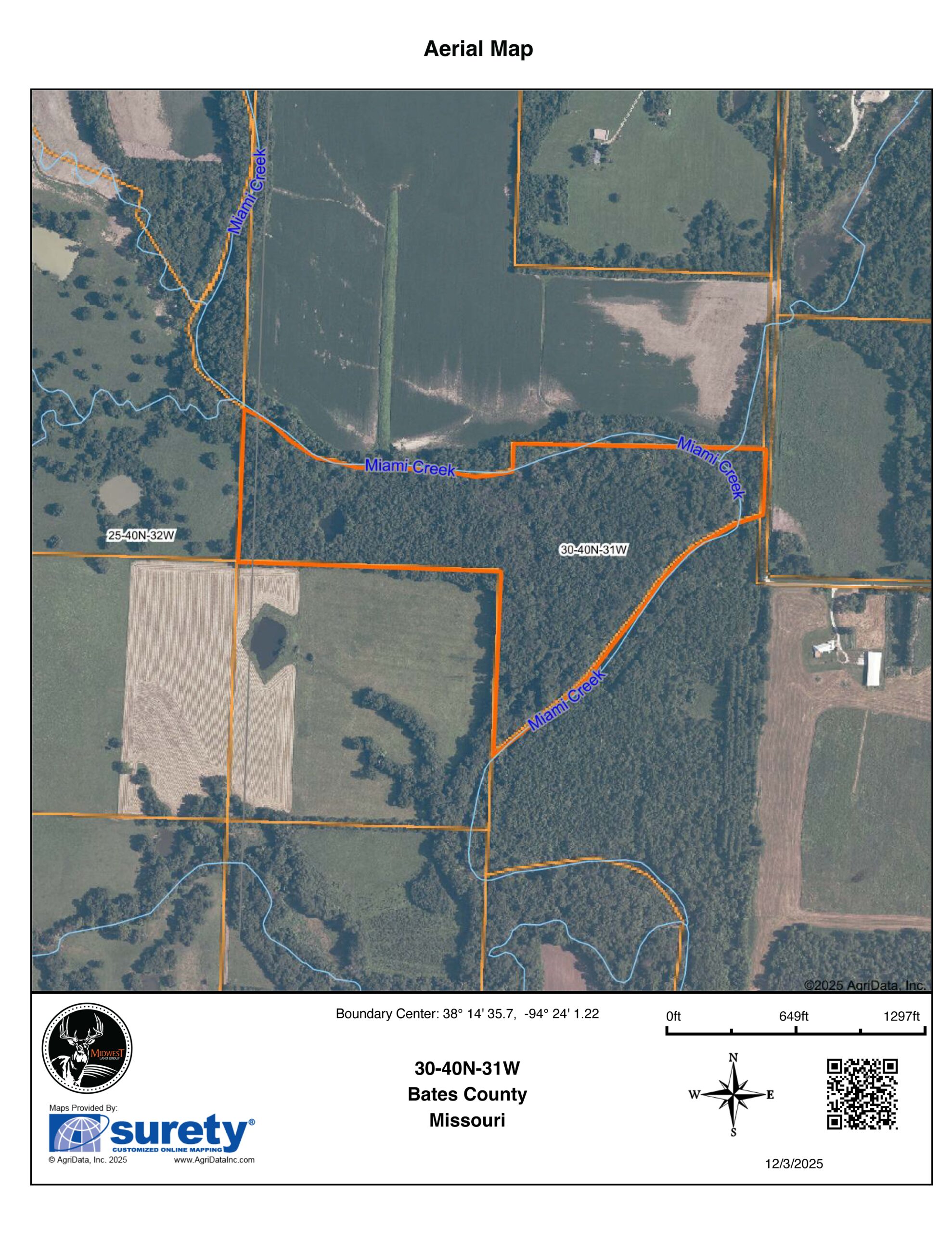 This stunning 43 +/- acre tract is the ultimate turn-key hunting property you’ve been searching for! Tucked away in big buck country, this secluded gem offers everything a serious hunter dreams of. Nearly a mile of live Miami Creek winds through and along the property, lined with massive sycamore roost trees that turkeys love. Thick stands of mature hardwood timber loaded with oaks that consistently drop heavy crops of mast. Abundant deer and turkey sign everywhere, giant rubs, well-worn trails, and scrapes in all the right places. Two textbook pinch points and natural funnels that are absolute kill zones during the rut. Diverse habitat with timber, creek bottom, thick bedding cover, and edge perfect for holding and growing mature whitetails and long beards. Utilities are already at the county road, opening the door to endless possibilities surrounded by nature. Whether you’re looking for a legacy family hunting property, a quiet getaway, or a smart land investment in one of Missouri’s best deer and turkey counties, this tract checks every box. Properties like this with live water, a big buck sign, and utilities at the road rarely hit the market. Don’t miss your chance to own one of the finest hunting tracts in Bates County! Call Land Agent Dalton Haynes today for your private showing; this one won’t last long!Property Features