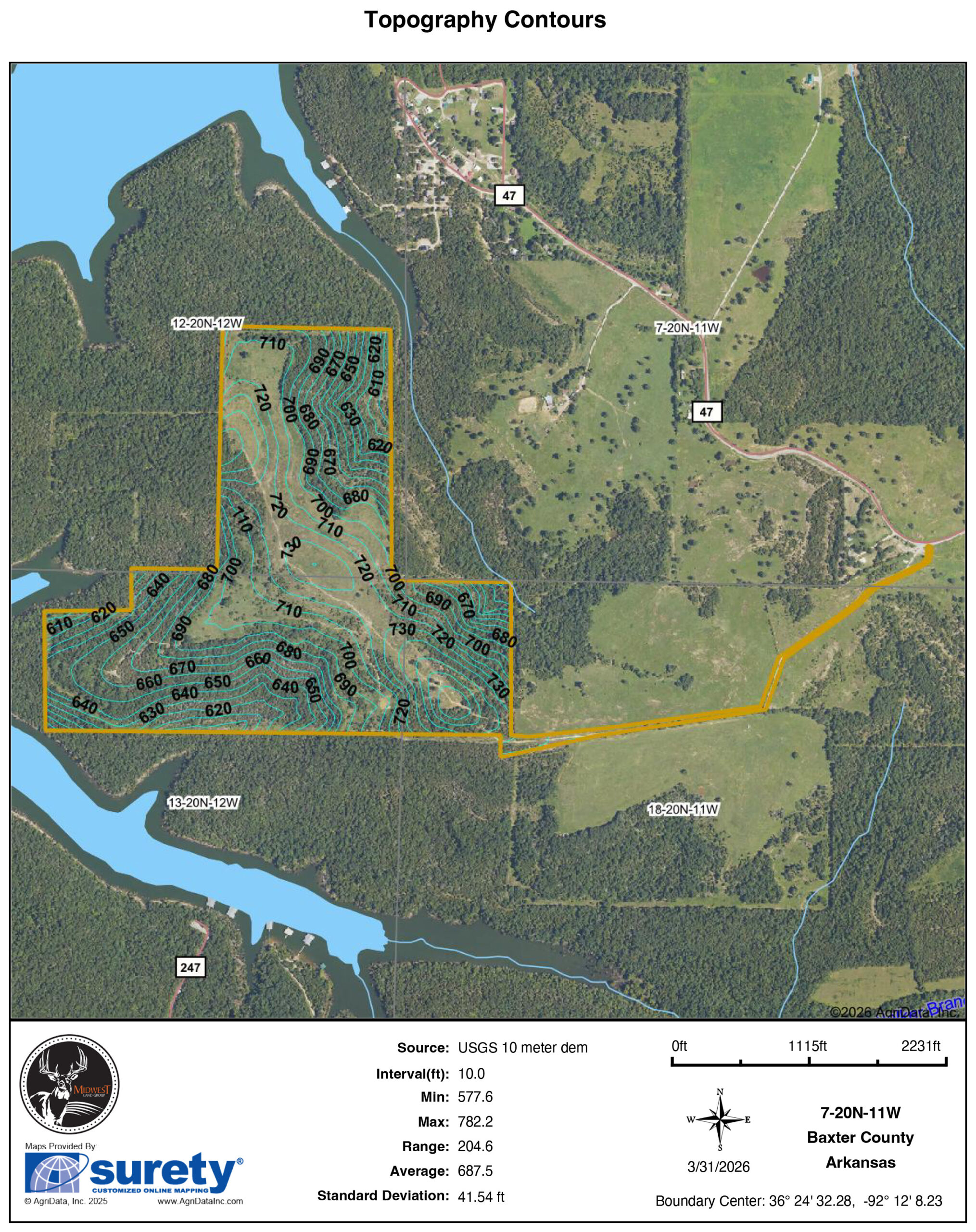 Extremely rare opportunity to own a large acreage tract overlooking the lake! This 170 +/- acre tract on Lake Norfork features an extraordinary 8,500 feet of Corps of Engineers frontage, offering a rare combination of privacy, scale, and direct connection to the water. Properties with this kind of lake frontage are exceptionally difficult to find, making this a truly standout offering in North Central Arkansas.The property is thoughtfully positioned to take full advantage of its setting, with multiple elevated build sites showcasing breathtaking panoramic views of the lake. Whether you’re planning a private estate, luxury retreat, or family getaway, these homesites provide unmatched scenery and a one-of-a-kind backdrop. Adding to its uniqueness, the tract includes rare, usable lake access in the southwest corner, allowing you to enjoy the water in a way most Corps frontage properties simply cannot offer.