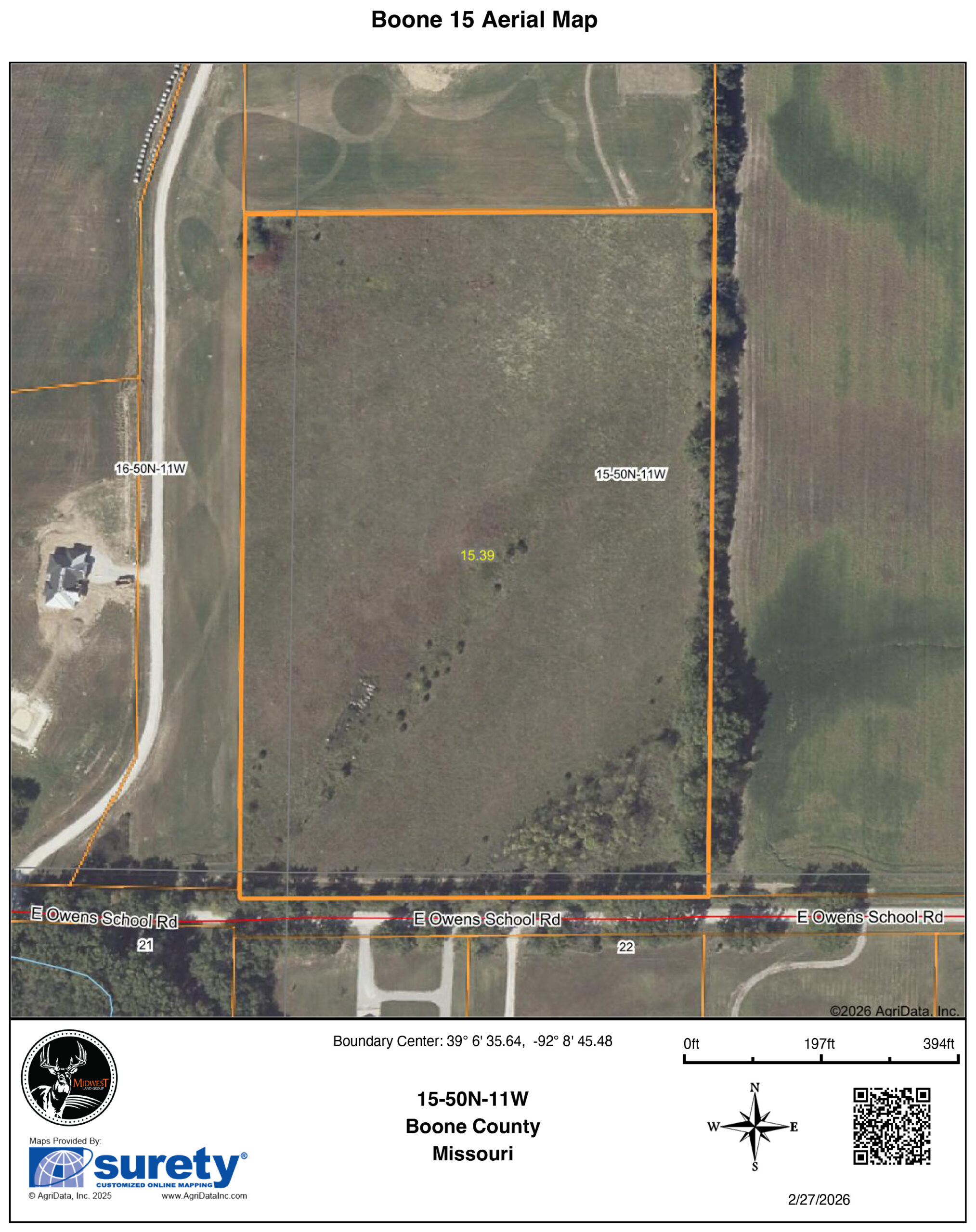 Looking for that ideal build site in northeast Boone County, Missouri? Are you desiring to be in the Hallsville R-IV School District? If either of these sparks your interest, you will be happy to know that a property fitting both of those criteria has hit the market!Just a few miles east of Hallsville, Missouri, sits a 15 +/- acre property ideal for a forever home to be built on and still plenty of room left to roam. Consisting mostly of grass, that has been used for hay baling historically, the 15 +/- acres comes on a pretty blank slate. With multiple areas set up well for build sites, the options are plentiful on how to turn this property into your dream land. With approximately 675 feet of tree-lined Owens School Road frontage, the seclusion from the road traffic will be minimal, and the access will be easy once an entrance is opened up. With the east line also being tree-lined, protection from the east and south is already in place. The west and north sides of the property are open to a recent residential development that consists of new homes on some of the 10 lots, ranging in size from 10 to 20 acres.