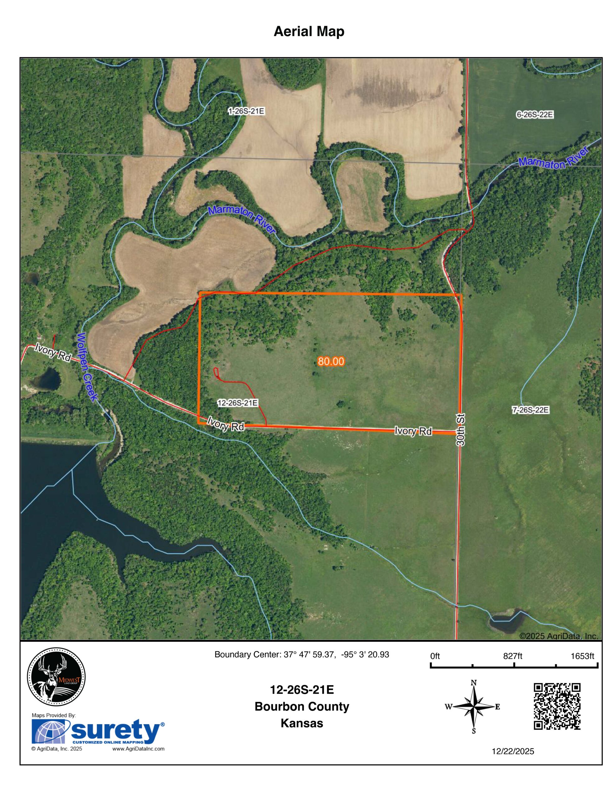 Here is an opportunity to own 80 +/- surveyed acres in southern Bourbon County with lots of potential for hunting, recreation, grazing, or even building a cabin! Sitting just above the Marmaton River with some timbered draws running down to the Ag fields on the river bottoms, you possess some incredible bedding cover for those big bucks to sneak off to during the rut. The entire top is made up of a wonderful mix of natives included big bluestem, and with a little TLC could be a fantastic native grass meadow providing incredible habitat for deer and turkeys. The property has not been hunted, but the deer sign is incredible, with deer seen every time I’ve been in there.