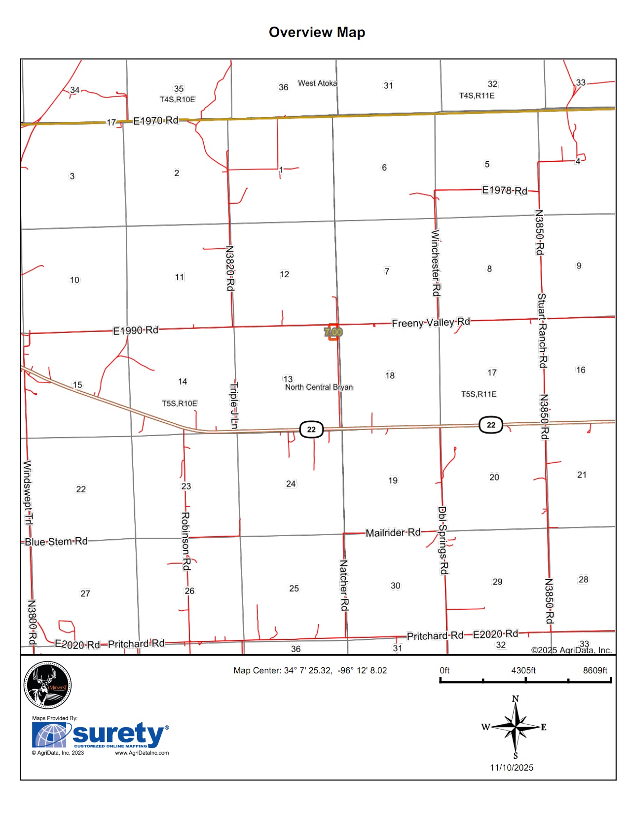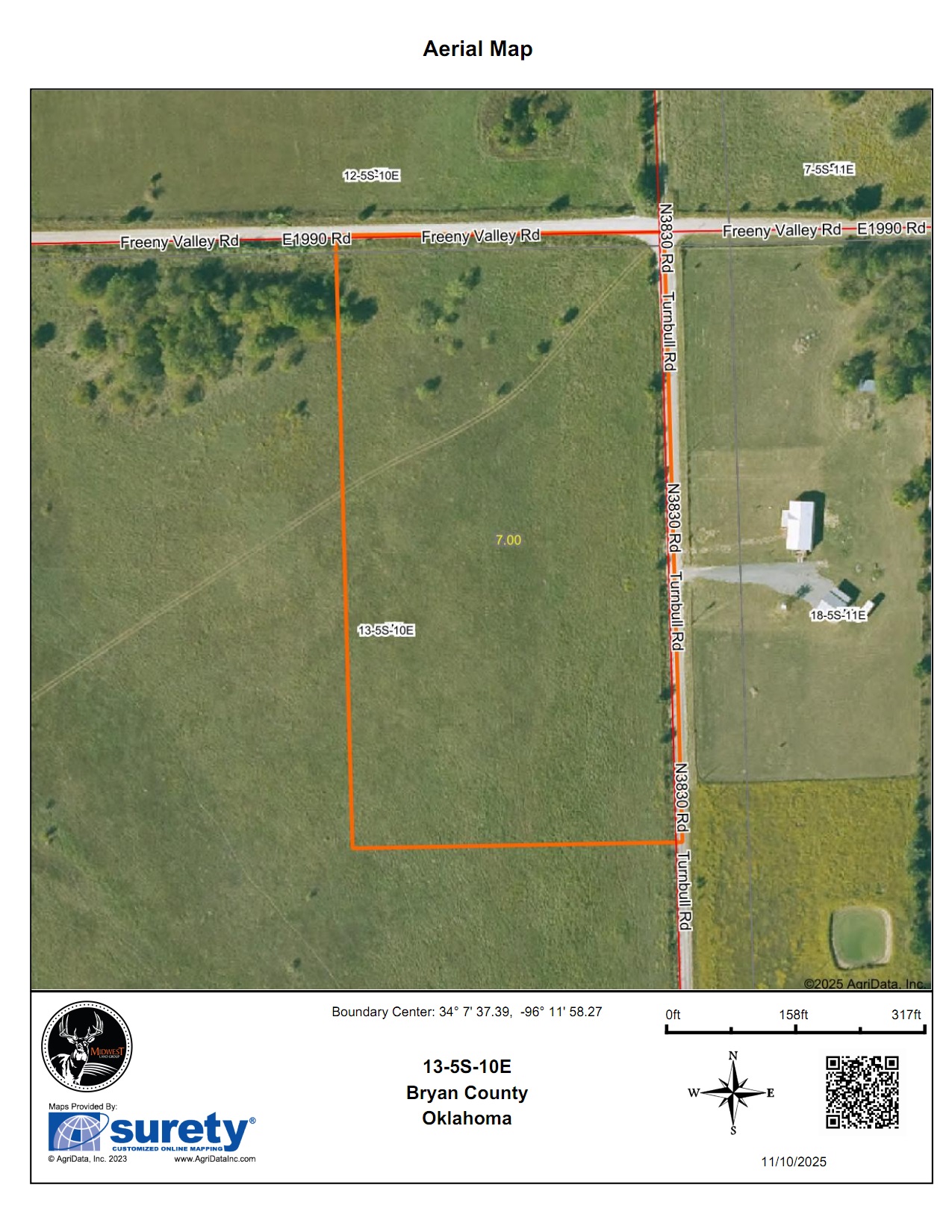 Experience the beauty and history of rural Oklahoma on this charming 7+/- acre property located at the corner of Freeny Valley Road and Turnbull Road, just outside Caddo, Oklahoma. With gently rolling pastureland and a picturesque hilltop build site, this tract provides the perfect setting for your dream home, hobby farm, or weekend getaway.Enjoy panoramic countryside views, the serenity of open space, and the convenience of electric and rural water utilities available nearby. The property offers gravel road frontage and easy access to US Highway 75, only six miles away—putting you within 1.5 hours of Dallas while still enjoying peaceful country living.
