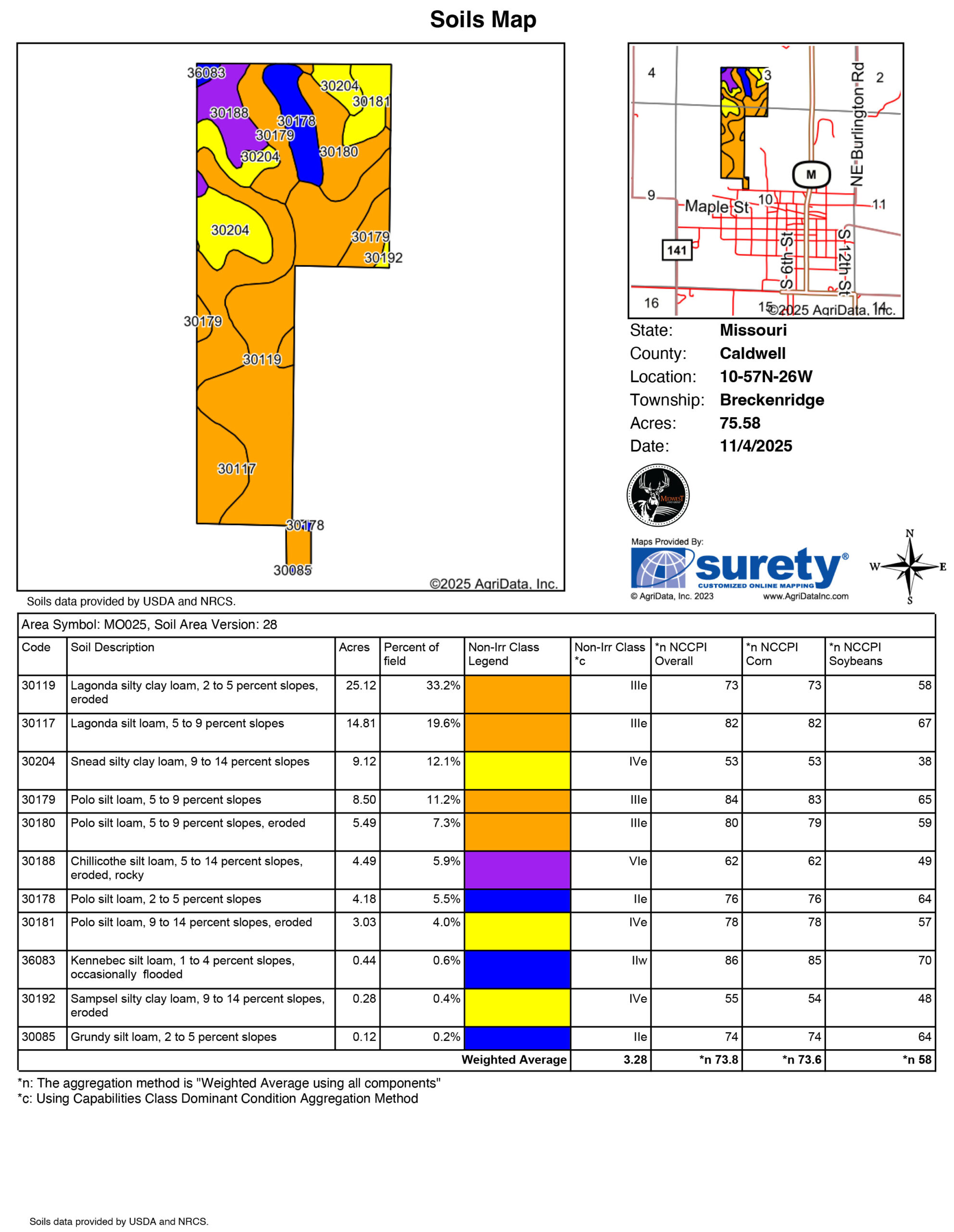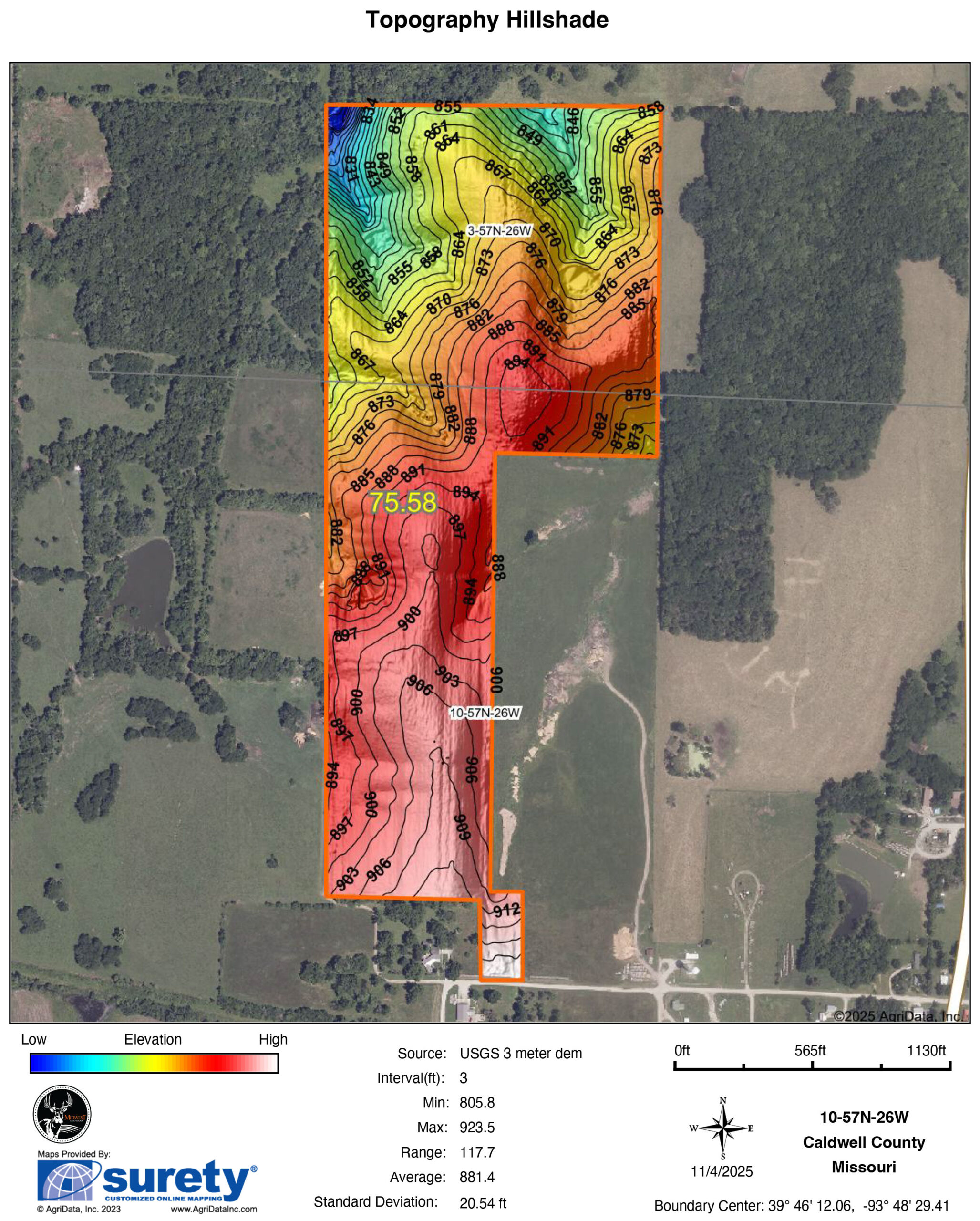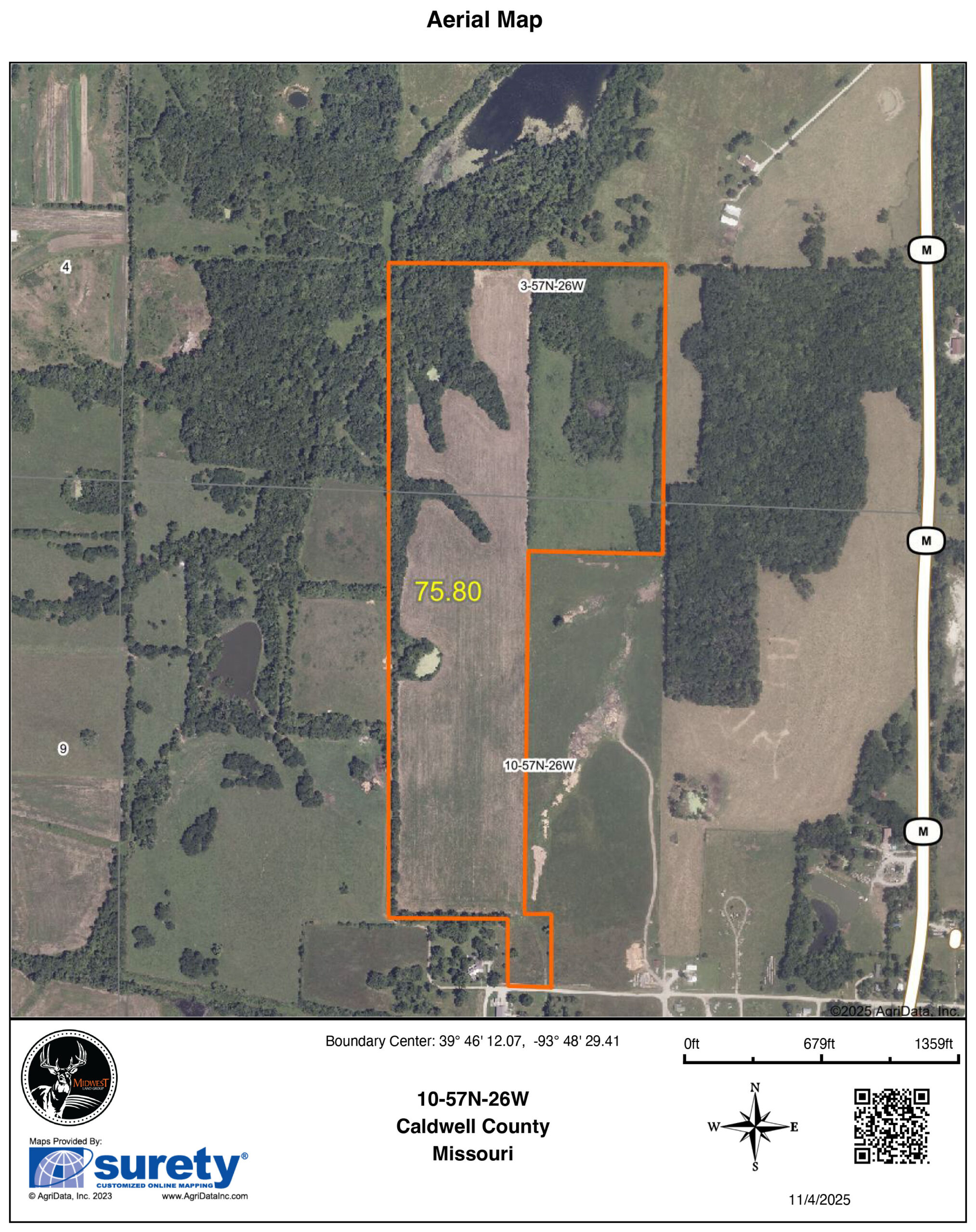 Welcome to a rare opportunity in Caldwell County, 71 +/- acres of thoughtfully improved farmland with a strong recreational backbone. Approximately 39 +/- acres are currently in production and actively farmed, while another 12 +/- acres of expired CRP hold potential for additional tillable ground. The land is tiled and terraced, presenting a well-maintained, highly functional row crop layout for immediate use.The natural features of this farm make it a standout. Three ponds are situated on the property, flanked by native grasses that offer ideal habitat for whitetail deer, turkeys, and quail. Whether your passion is whitetail, upland hunting, or simply exploring the outdoors, this farm offers an immersive experience all year round.