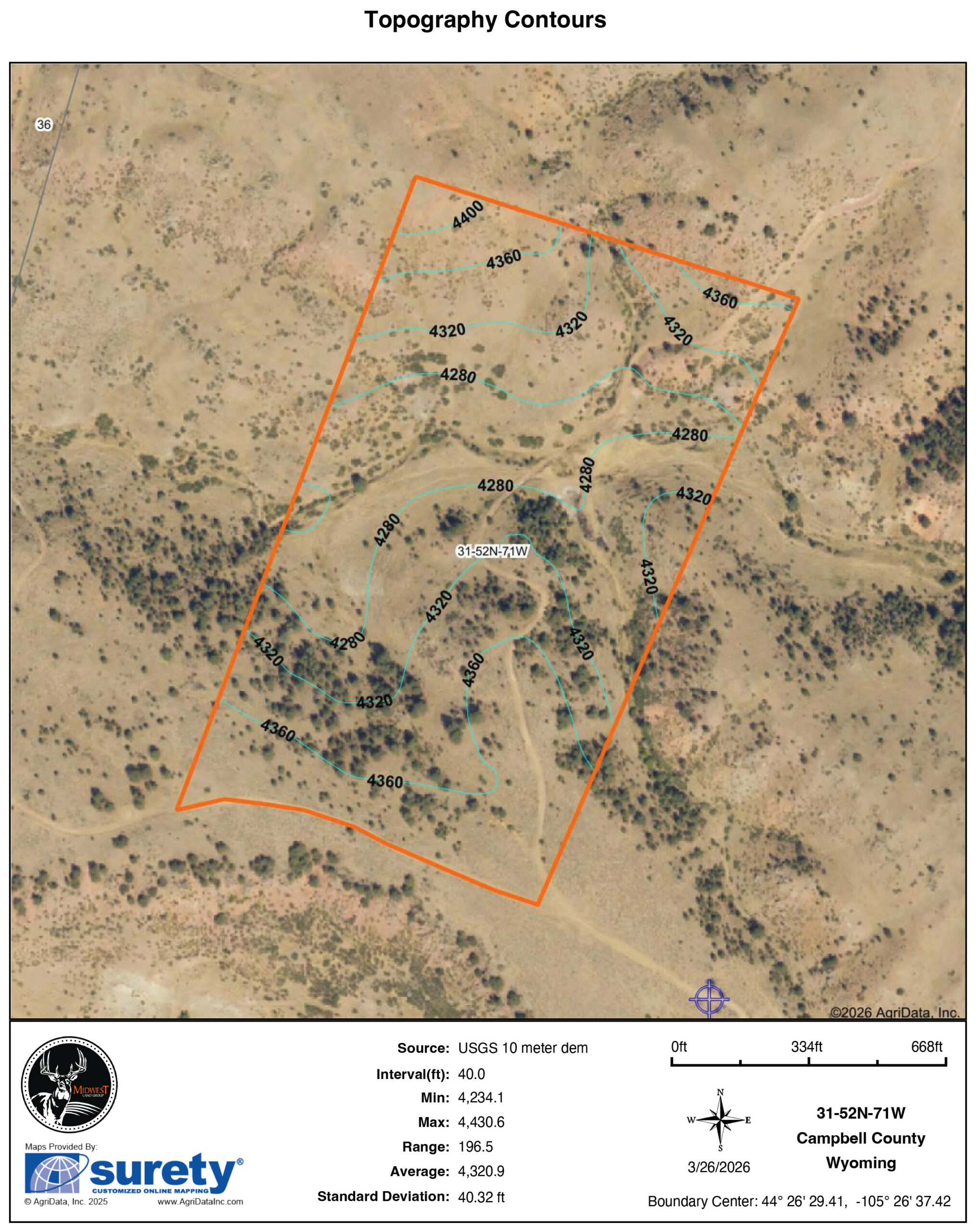 Located just 12 miles north of Gillette, this 35-acre tract offers a strong blend of timber, open ground, and live water—making it a well-rounded piece for both recreation and future build plans. With year-round access and a location that keeps you within easy reach of town while still feeling a world away, this is the kind of acreage that offers both practicality and that elbow room Wyoming is known for.A natural spring runs on the property, adding both character and function. It serves as a reliable water source and naturally draws in a substantial number of mule deer, making it a strong setup for those interested in hunting or simply enjoying the wildlife. Plans are in place for overhead electric service, which is planned to be ran along the entire southern boundary of Tract C4 (providing option and flexibility on build-site options). The mix of terrain gives you several solid options for a homesite, whether you’re looking to tuck into the trees or sit out front and take in the country.