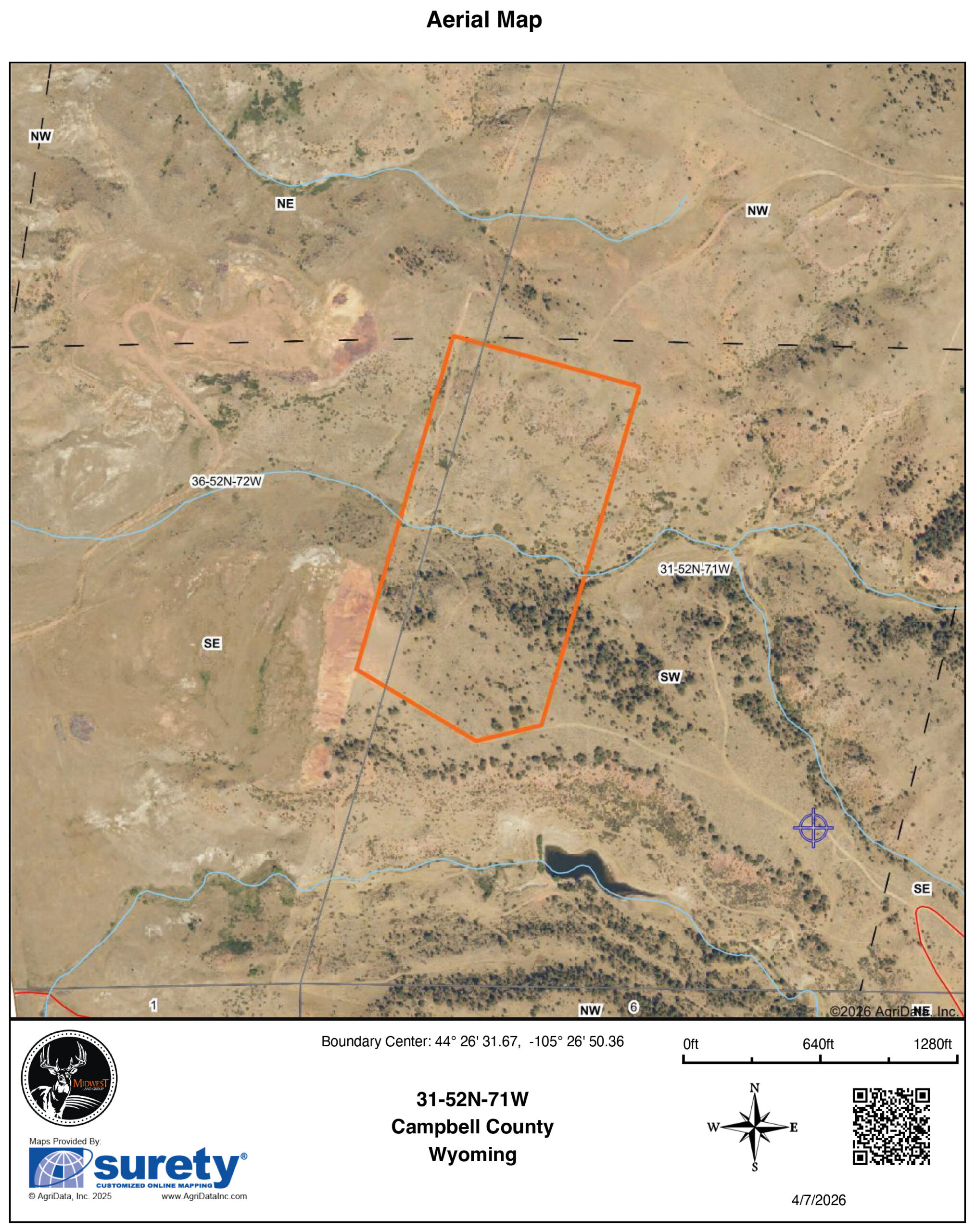 Located 12 miles north of Gillette, this 35-acre tract is a straightforward piece of ground with a good mix of timber and open grass. Mature pines are scattered throughout, balanced by usable open areas that don’t feel overgrown or limiting. It’s the kind of layout that works equally well for a future homesite and recreational ground.From both the north and south ends, the land works inward and gradually descends into a grassy bottom, with pockets of pine trees scattered throughout. This layout gives the property a natural flow while keeping it easy to navigate and use, and it creates a few different options when it comes to picking a build site, depending on how much cover or openness is preferred.