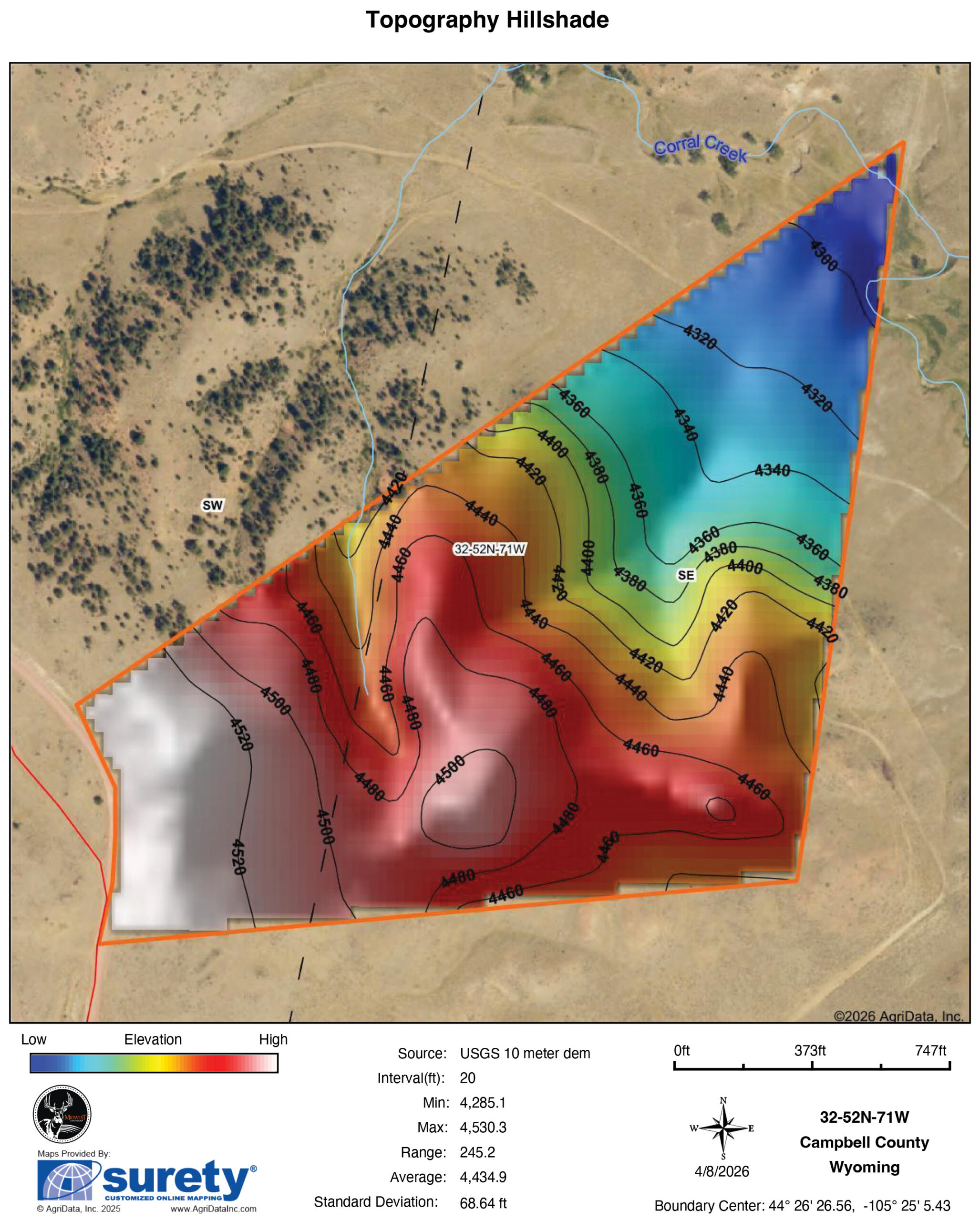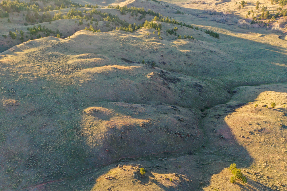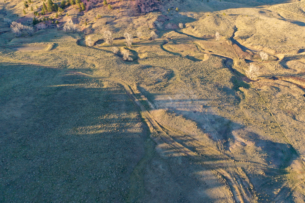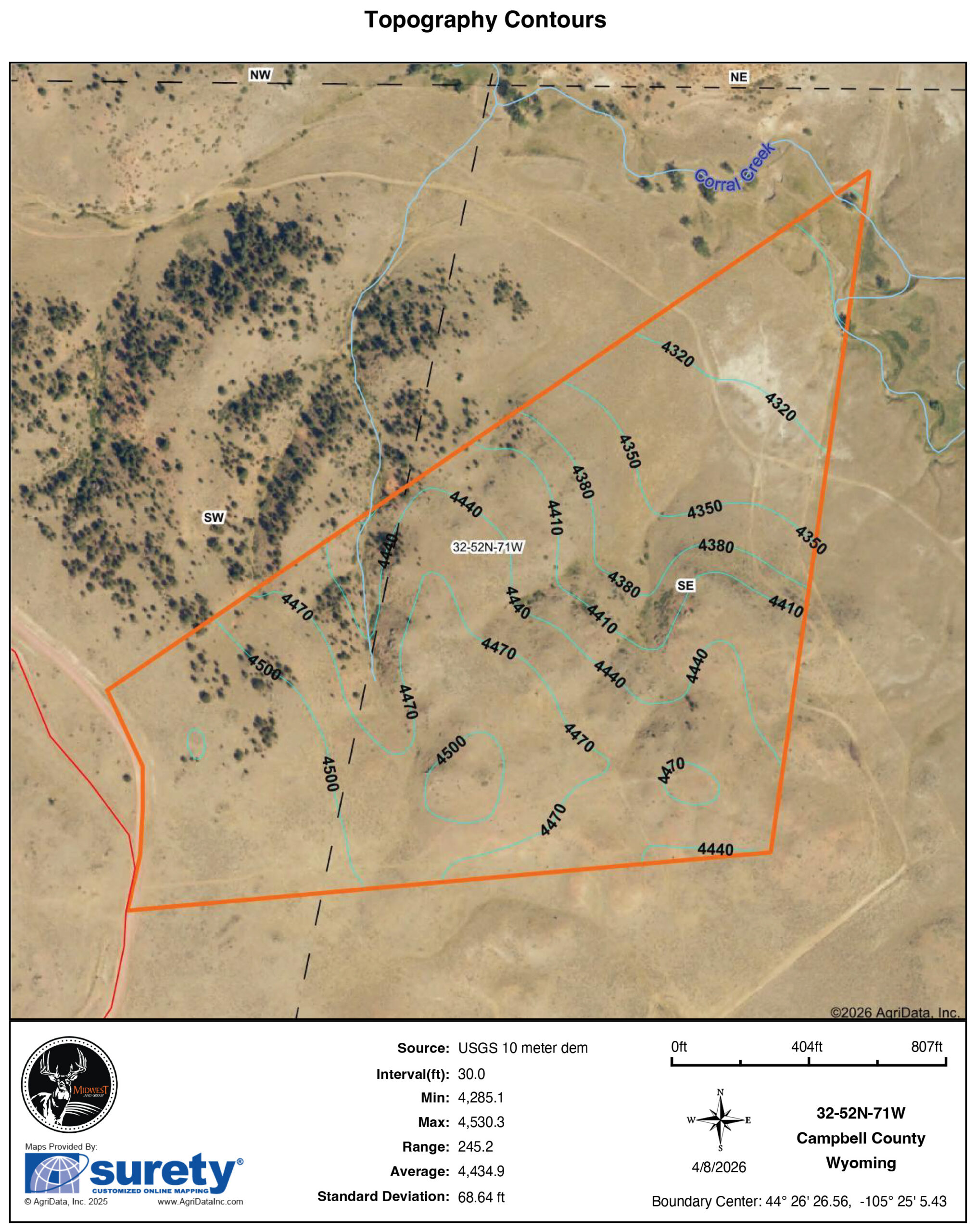 This 58-acre tract offers a clean, usable layout with a touch of character throughout. Scattered pines and native sagebrush define the higher ground, giving the property a classic Wyoming feel while still maintaining wide-open usability. The terrain rolls gently from a sagebrush-covered plateau down into a flat, grassy bottom lined with cottonwoods— creating a natural transition.Located just 12 miles north of Gillette, the property is easily accessed by a year-round maintained dirt road, with an established two-track running the full span of the land for added convenience. Several rock outcroppings are scattered across the property, adding texture and a bit of rugged character to the otherwise smooth, rolling landscape.