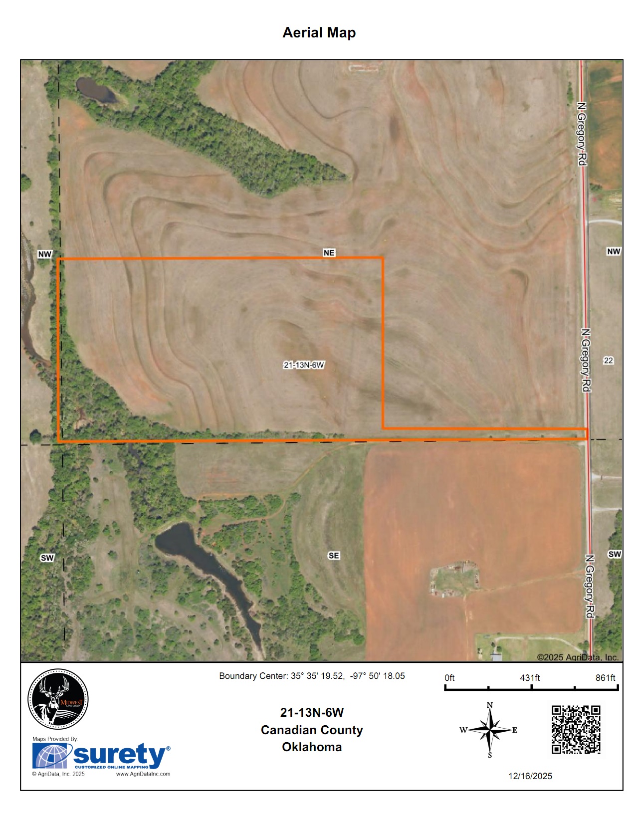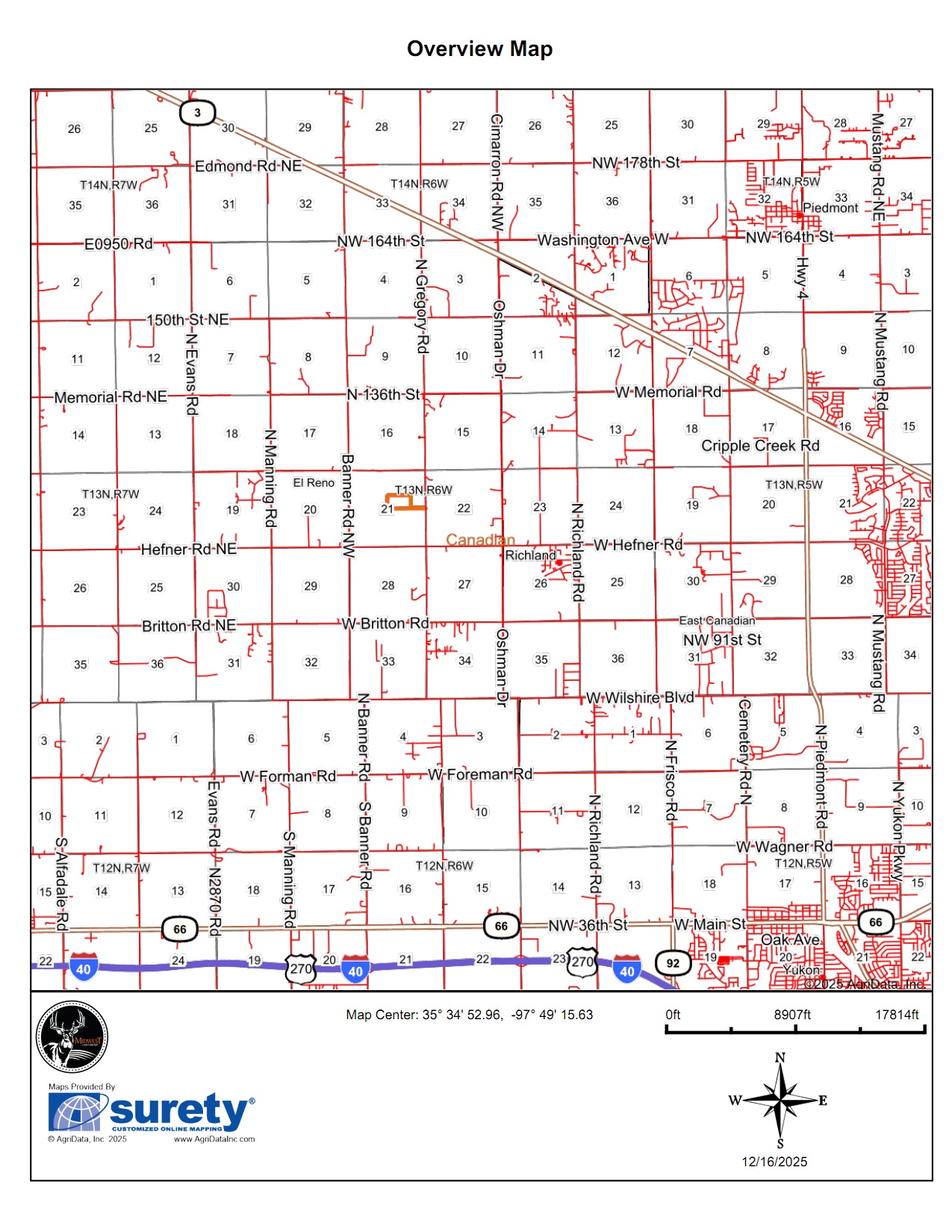 This 35 +/- acre ranchette on the edge of Yukon, Oklahoma City, and El Reno combines country living with unbeatable convenience. Located just 3.5 miles from the Northwest Expressway/Highway 3 and under 10 miles to I-40, it’s perfectly positioned for easy access to surrounding cities. Fifty feet of blacktop road frontage and power along Gregory Road make this property ready for development, whether you're planning a homestead, hobby farm, or recreational retreat. With a blend of open and wooded land, it offers privacy while still close to city amenities.
