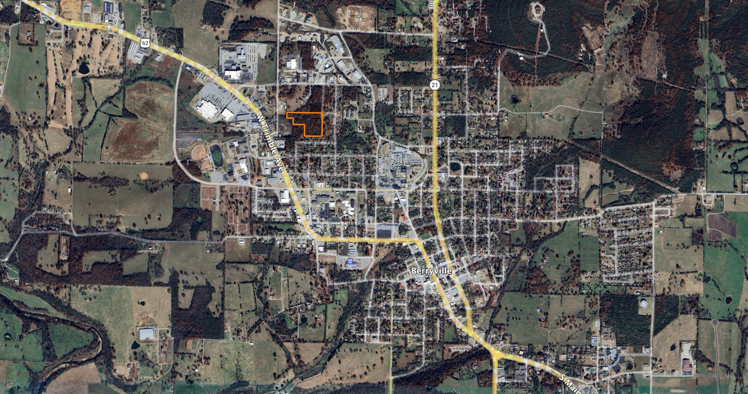 It’s all about location and usability—and this exceptional 9 +/- acre tract delivers both. Situated inside the city limits of Berryville, this is one of the last remaining large vacant parcels available, offering an incredible opportunity for development or investment. Positioned in a commercial and residential district, the property is just approximately a quarter mile from Walmart and features convenient access just off Highway 62 Spur, providing excellent visibility and accessibility.