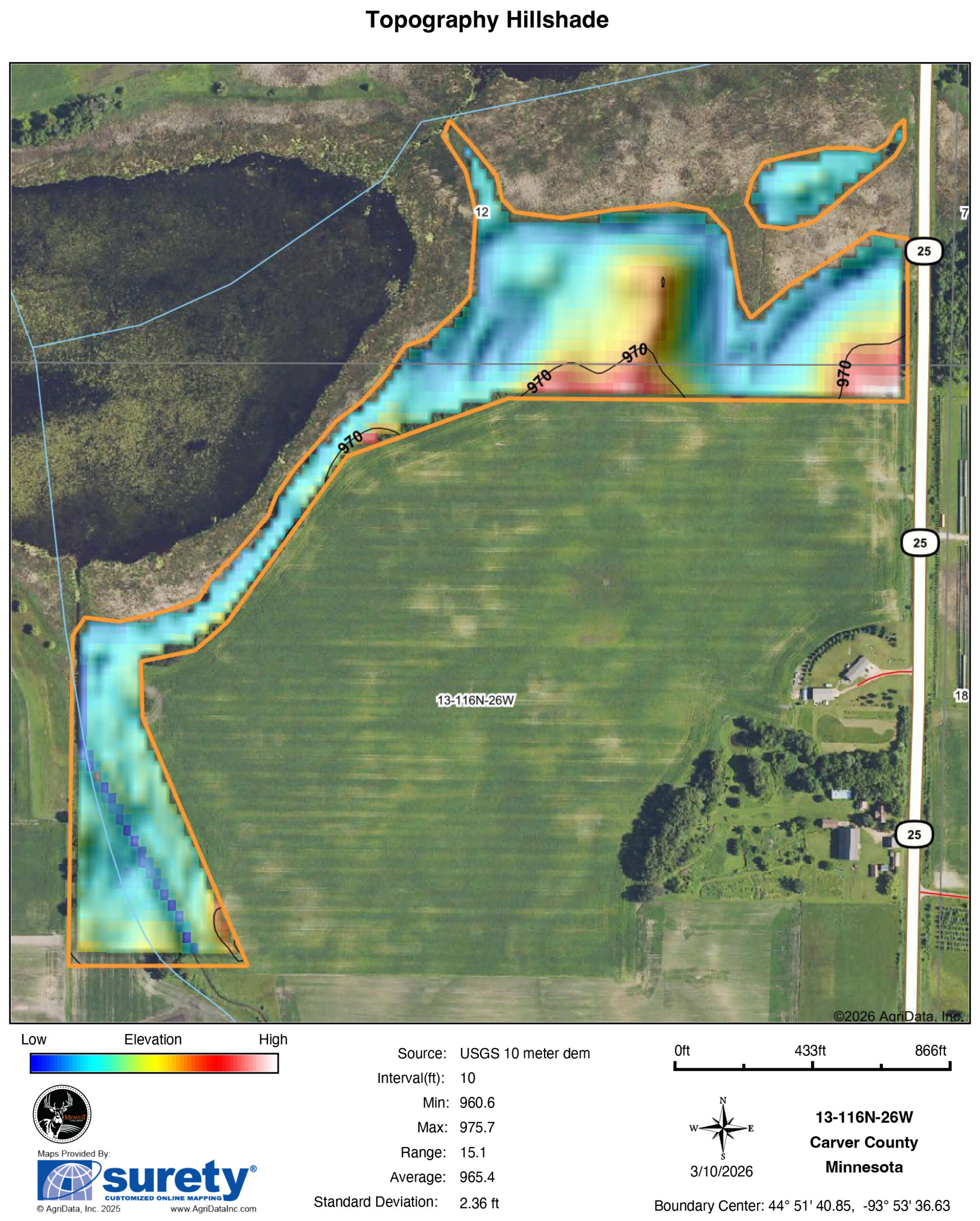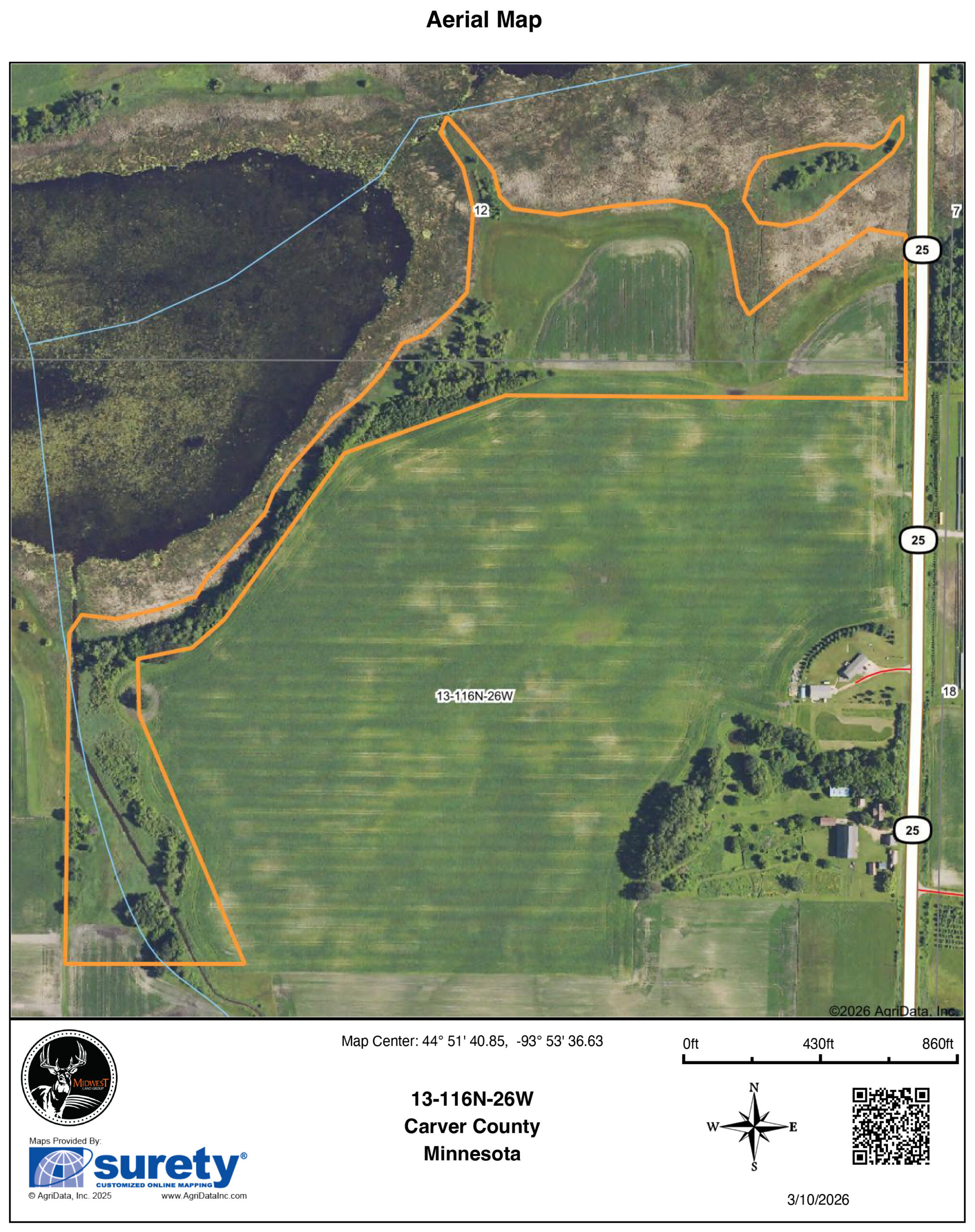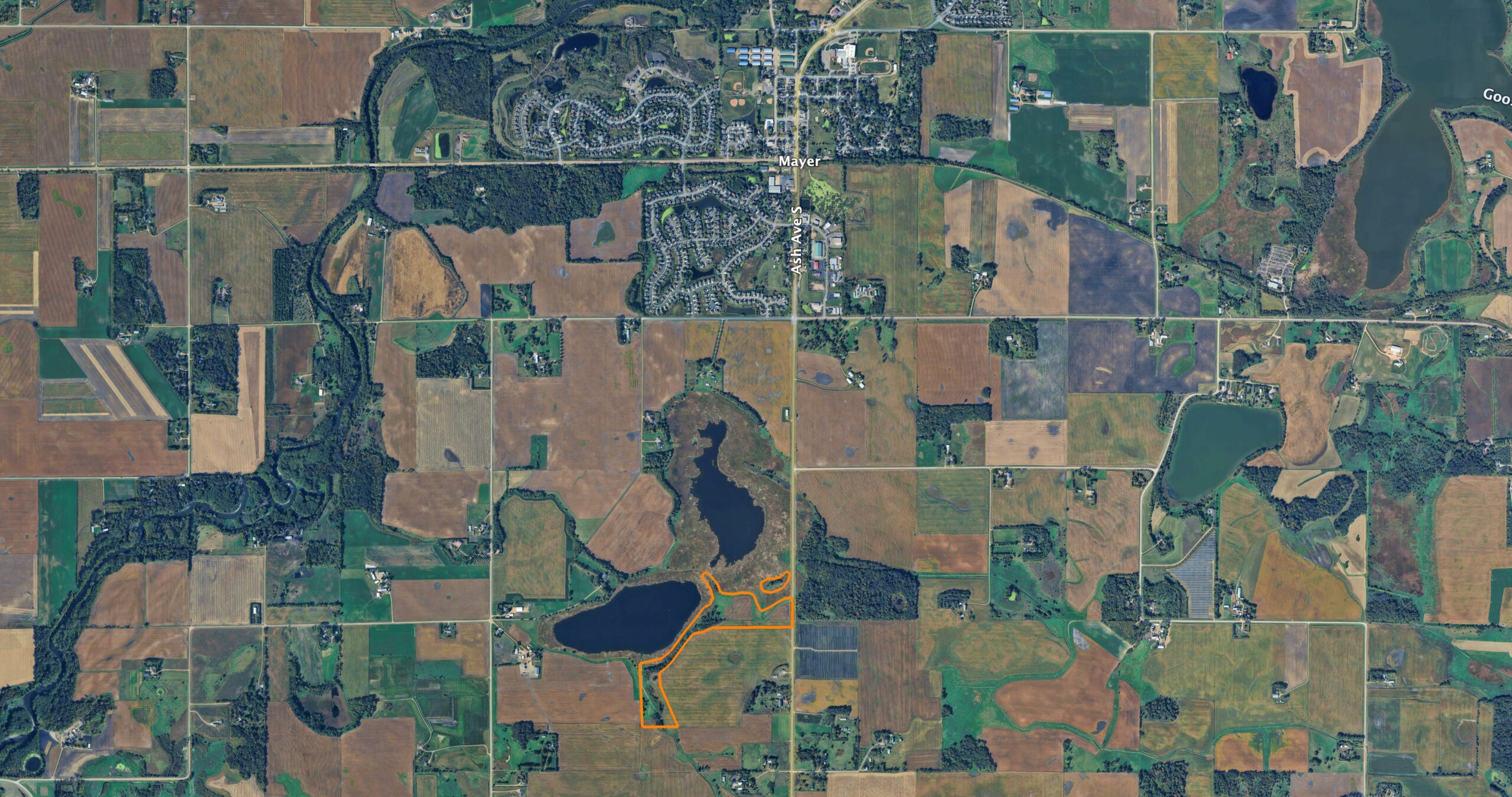 Located 1.5 miles south of Mayer, Minnesota, and on the west edge of the Twin Cities area, sits this stunning 38 +/- acre property with endless possibilities. With building eligibility and multiple potential sites, this property is the perfect spot to build your dream home. Conveniently located off of Highway 25, you can choose how far off the road you’d like to be. This ground offers a great mix of tillable ground, wetland, and woods. To the north of the property is a marsh and an isolated lake offering tremendous privacy.To the west of the build sites is the crown jewel of the property, over 2,200 feet of shoreline on beautiful Berliner Lake. At 71 acres and with only a few properties bordering it, the opportunities for private paddling, enjoying nature, and hunting all manner of waterfowl are incredible. There is a staggering number of birds that call this lake and area home, including Trumpeter swans, sandhill cranes, and other shorebirds. The property offers great opportunities for deer, turkey, and pheasant hunting as well.