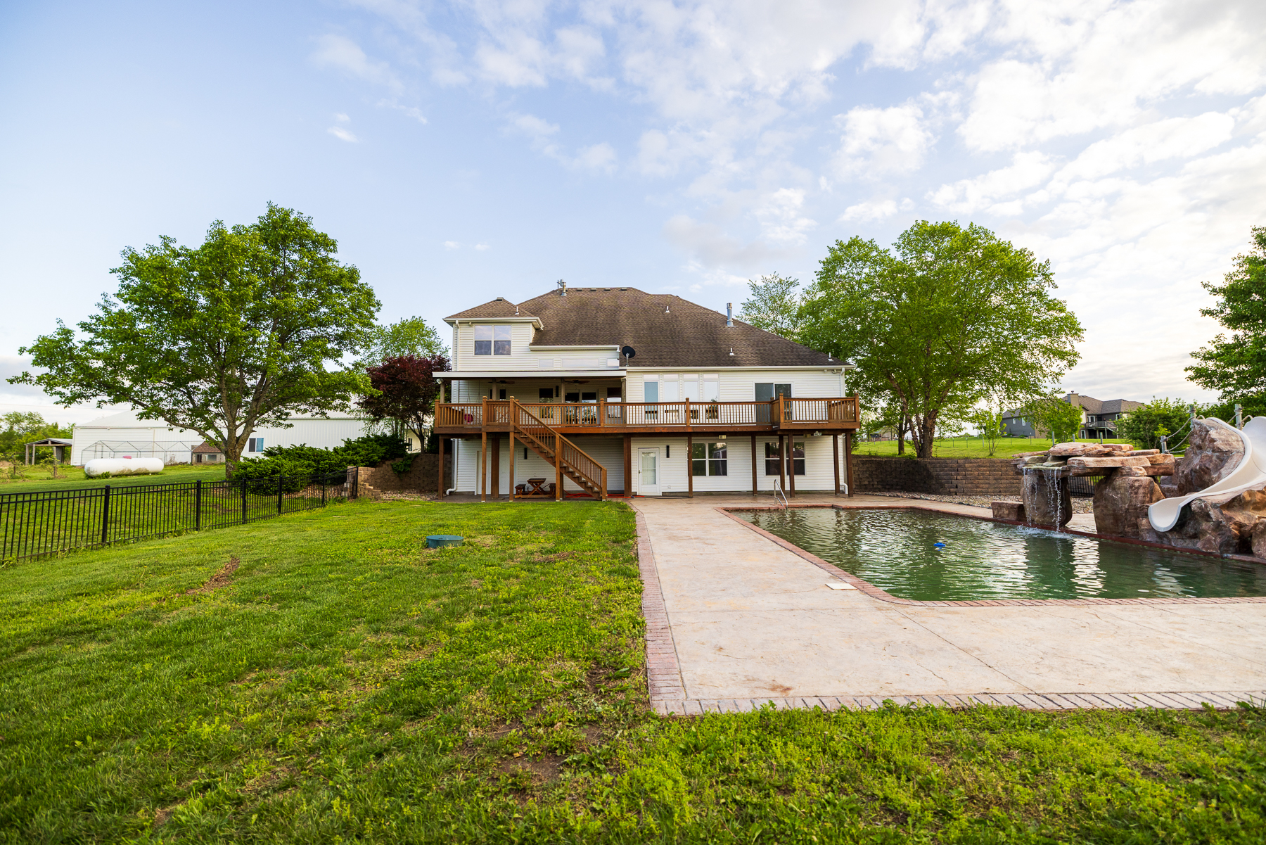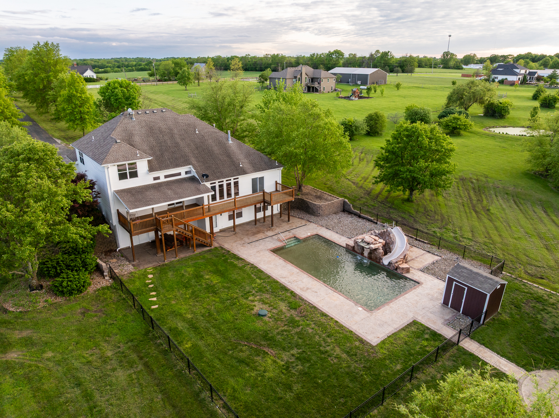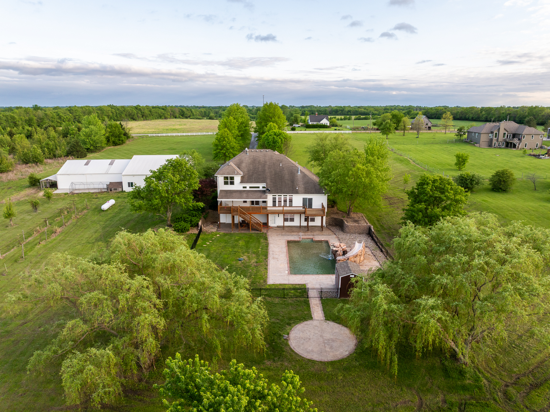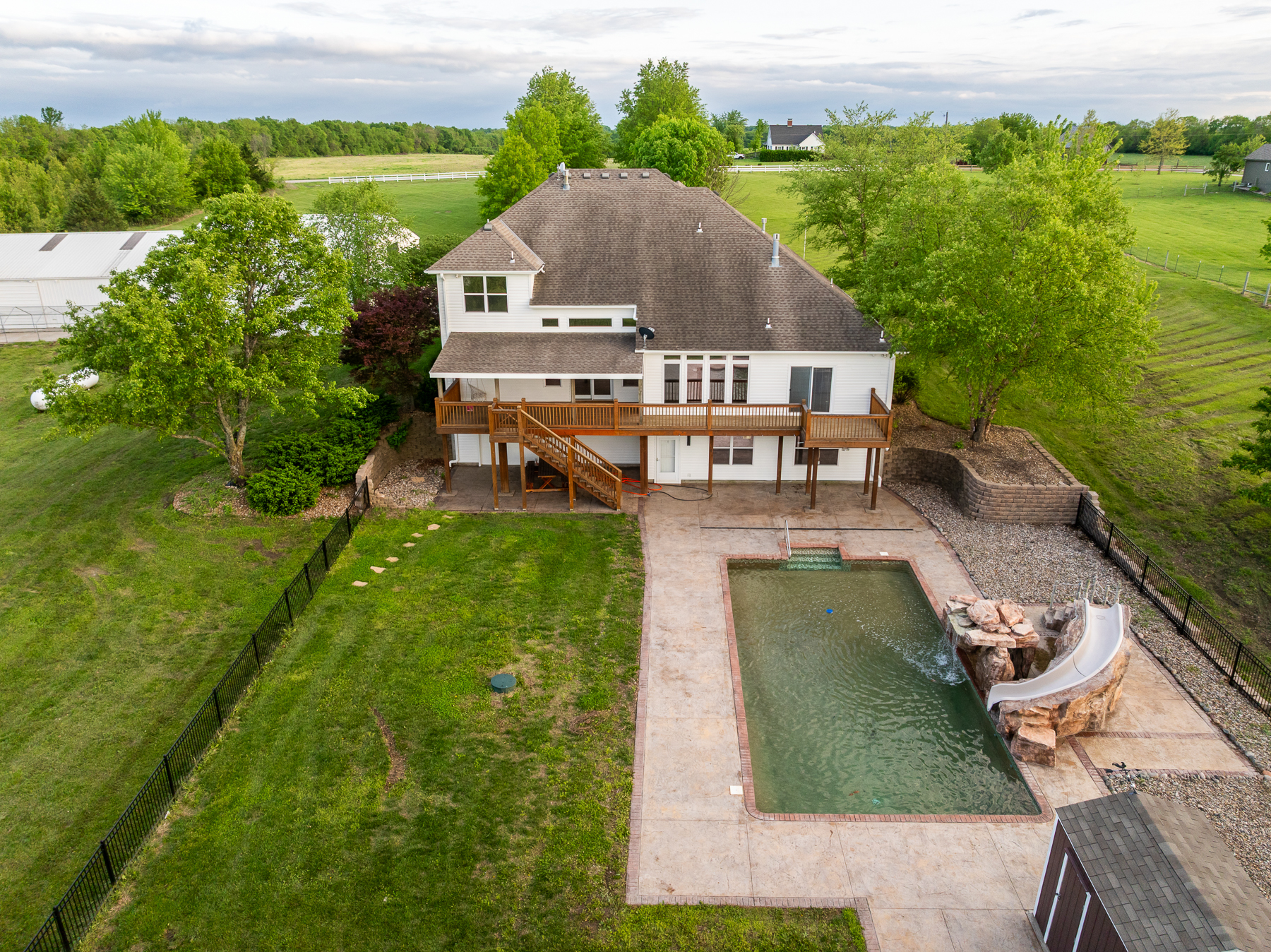 Here’s your chance to live and roam on 10 +/- acres just across the Jackson County line in Cass County, Missouri. This amazing home on acreage is located just 20 minutes south of Lee’s Summit along a blacktop road and only a half mile off Highway 291. Talk about a prime location! You will fall in love with the 300+ foot paved driveway access to the house that sits perfectly overlooking the property. Enjoy the sunrise and sunset views from the front porch or back deck. Most of the property consists of open pasture ground that offers a blank canvas with so many possibilities. The driveway is lined with mature oak trees and several nice shade trees, along with landscaping surrounding the house. Also, there is a gardening area complete with established fruit trees, grape vines, and a chicken coop.The 4 bedroom (plus 1 non-conforming), 4.5 bathroom house was built in 1999 and offers plenty of space for the family and entertainment. It’s a must-see! The main level features a living room with a fireplace, vaulted ceilings, an oversized eat-in kitchen, an office, and a massive master suite. The upstairs includes 3 spacious bedrooms, 2 bathrooms, and a large play area. The finished walkout basement is complete with a full kitchen, large living area, bathroom, non-conforming bedroom, safe room, washer/dryer hookups, and plenty of storage space. Don’t forget about the incredible deck off the main level with amazing views and a covered patio underneath. It gets even better with the resort-style swimming pool with a slide and waterfall. This is the perfect setup to relax or entertain!
