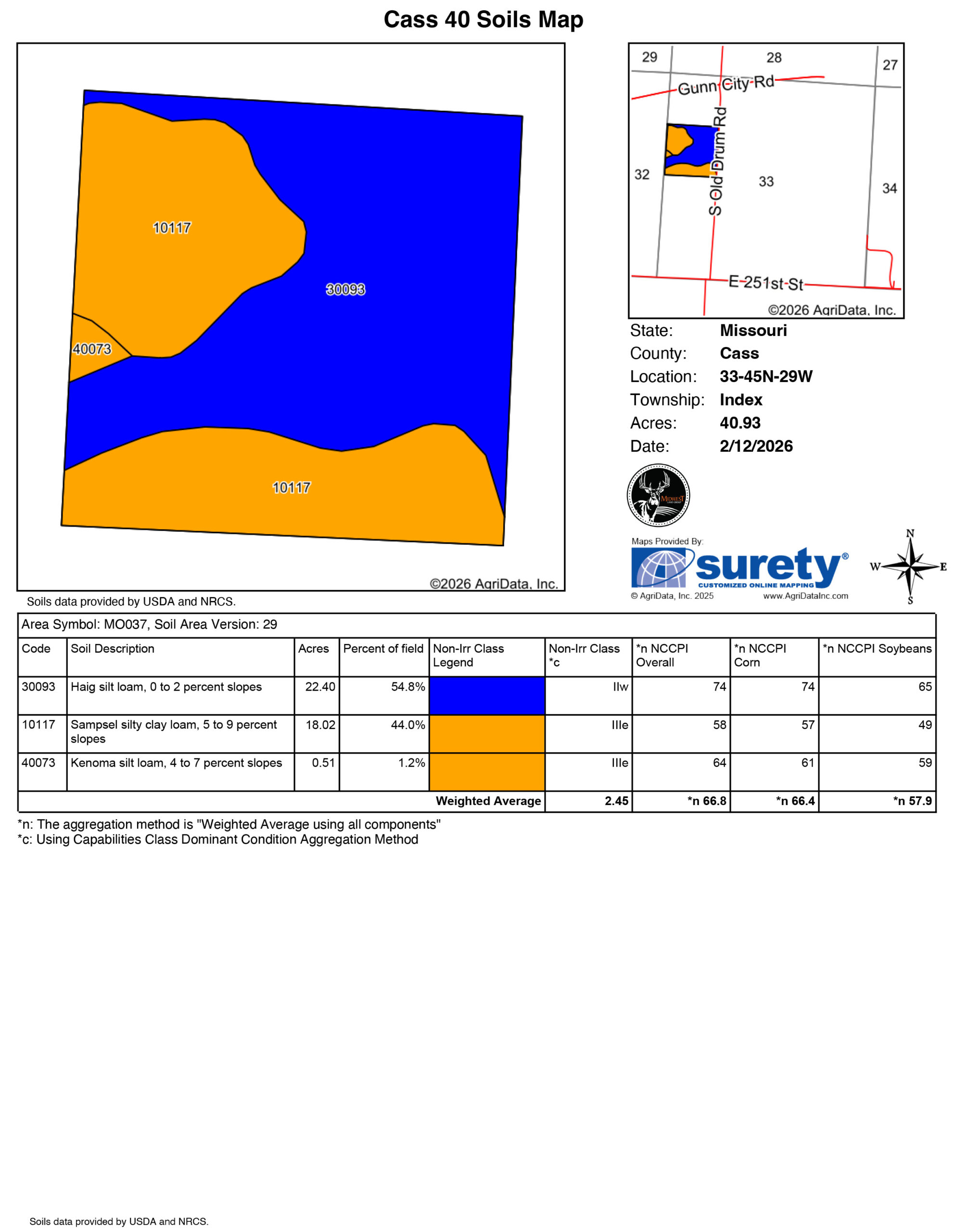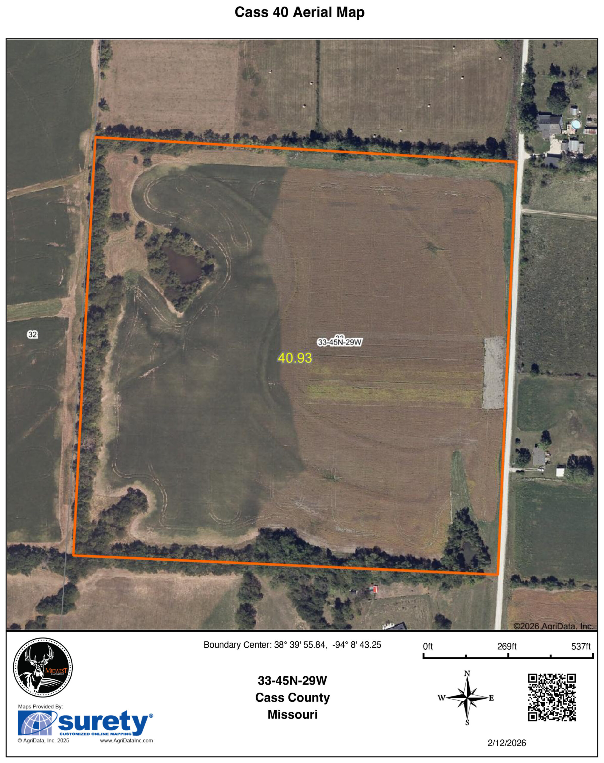 Beautiful 40 +/- acre farm sitting just east of Gunn City with close access to Highway 2 in eastern Cass County. This diverse 40 +/- acres has approximately 32 +/- acres currently in tillable production, 2 ponds, and is terraced with tile outlets. The farm is currently planted in triticale and rye cover crops and has recently been fertilized. This farm has been well cared for, including yearly grid sampling for fertilizer applications and limed every 5 years. The owner would be willing to rent the farm back for the 2026 crop year if you are looking for additional income. Water, electricity, and fiber internet are all located at the road. With trees on 3 sides and utilities available, this would make a great build site. Whether you are looking for a quality tillable farm or a great build site, don’t miss out. Call Paul Lowry to schedule your private tour today at (816) 500-2513.Property Features
