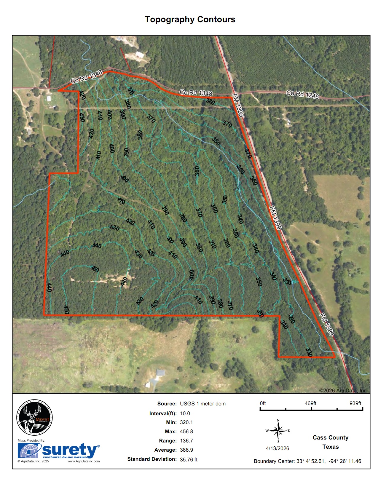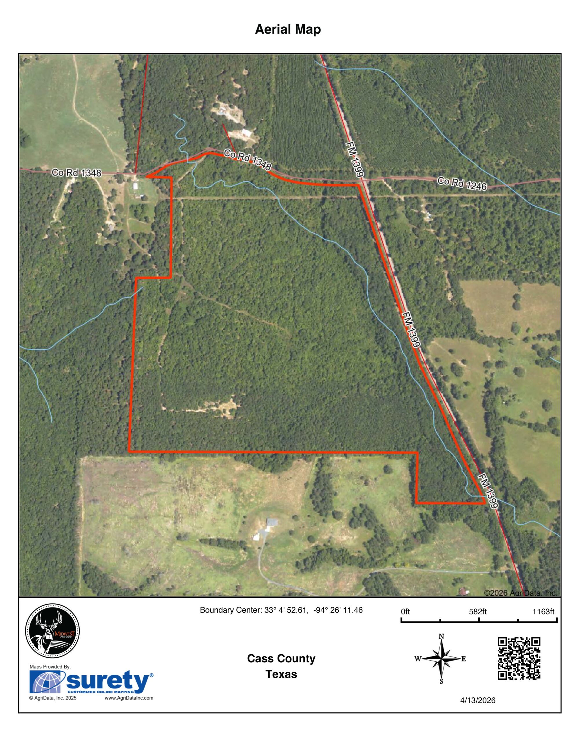 With electricity already on the property, rural water available just across the highway, and fiber optic internet, you get an excellent combination of seclusion and modern connectivity. Extensive road frontage includes approximately 0.5 miles along FM 1399 and 0.3 miles along County Road 1348, offering excellent access and flexibility for future use.