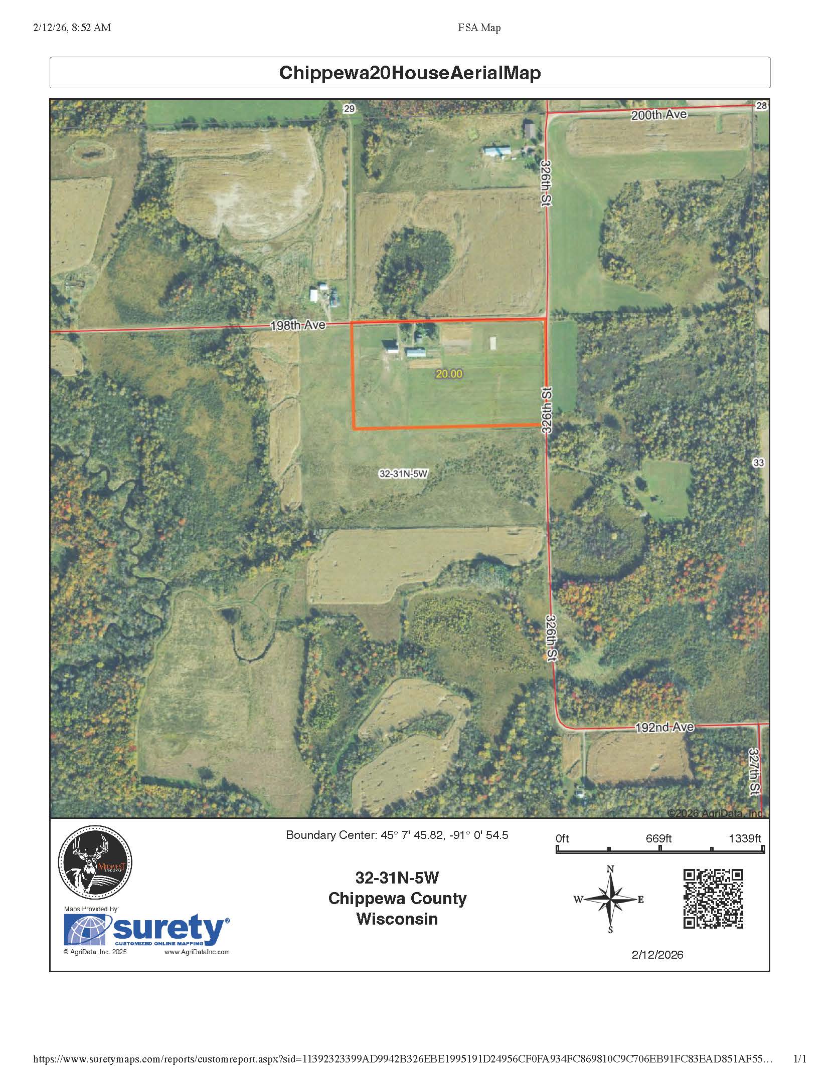 The property is not part of any government program and currently offers low taxes. This parcel can be combined with an additional 10, 20, or 30 acres. The Chippewa 20, home, and barns are being offered in as-is condition.
