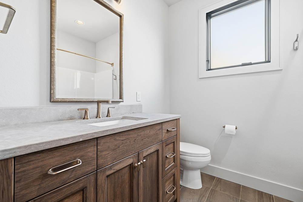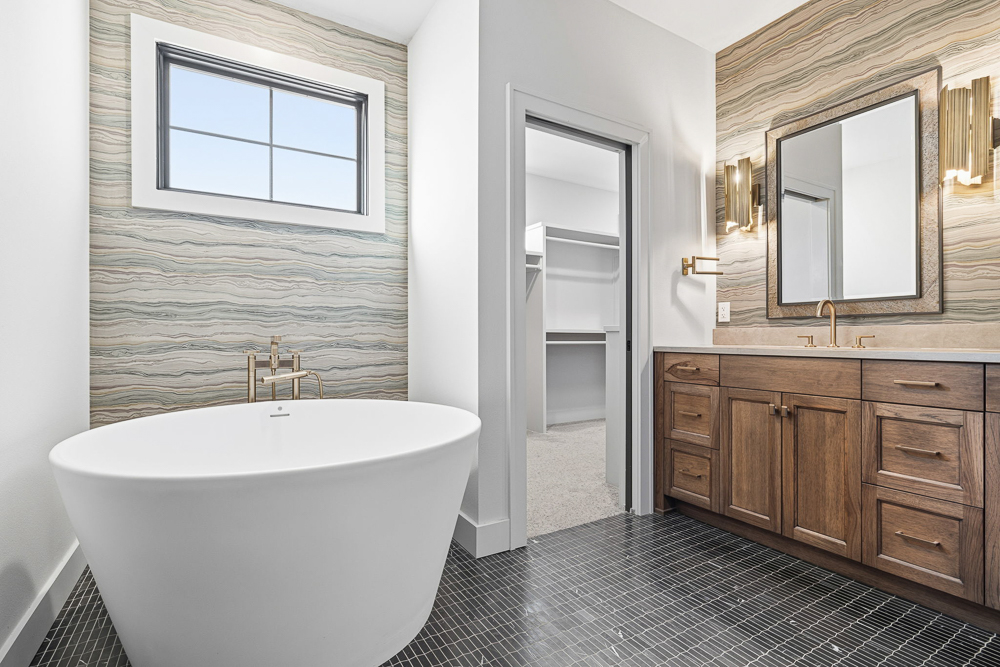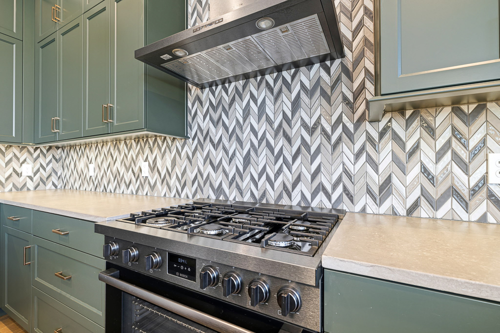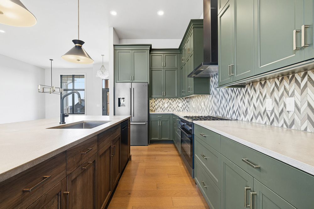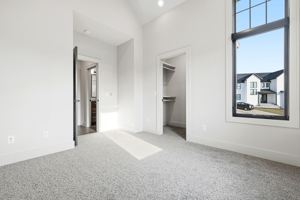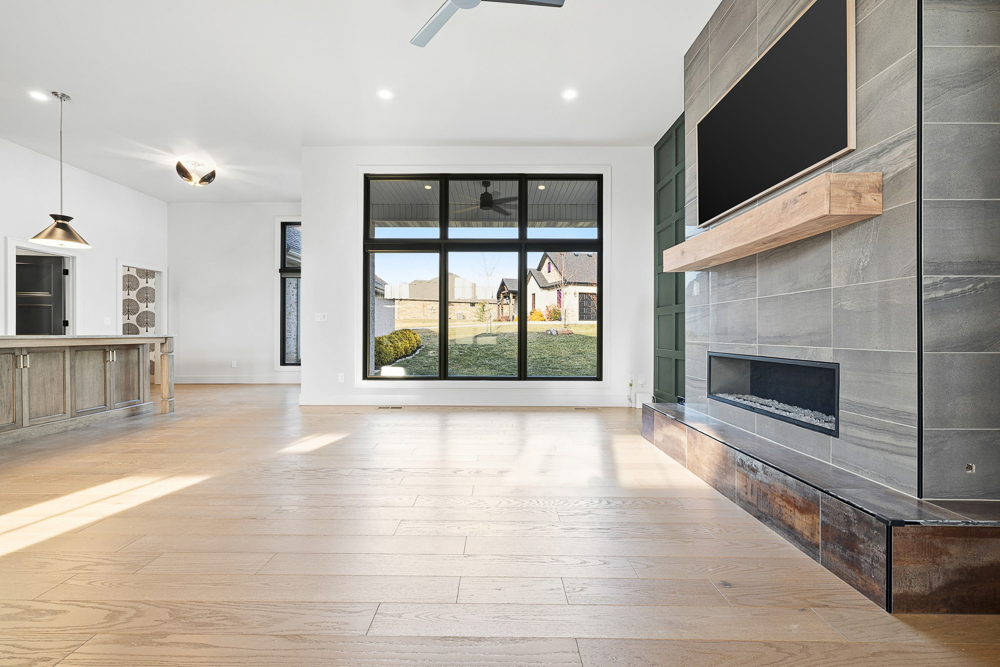 Inside, custom cabinetry and designer finishes carry throughout the home. The living room is anchored by a stunning fireplace accent wall featuring a custom walnut mantel, a true focal point that adds warmth and character. The primary suite is a retreat of its own, showcasing a vaulted ceiling, formal sitting area, and spa-inspired comfort. Enjoy mornings at your private coffee bar, complete with a built-in Bosch coffee machine.