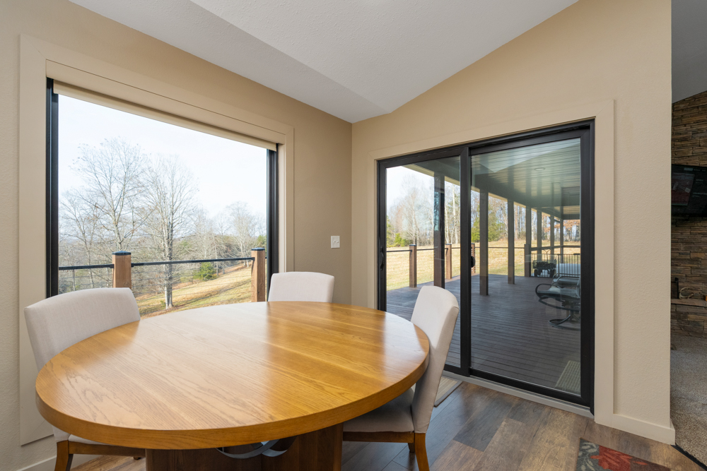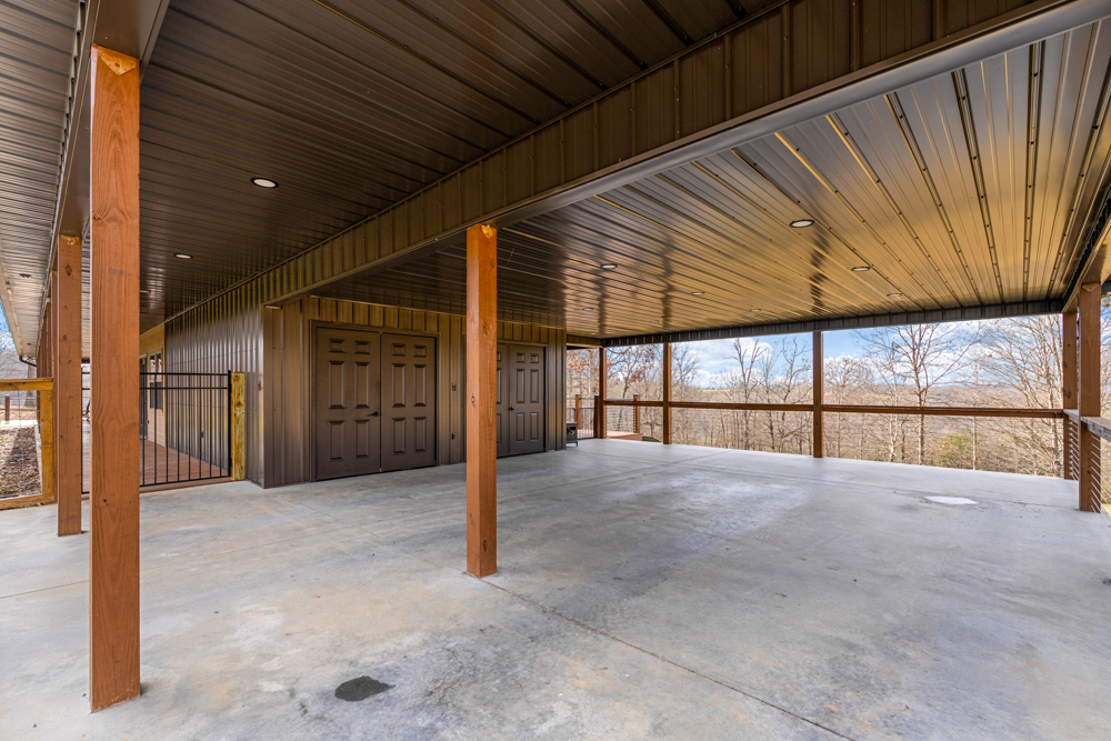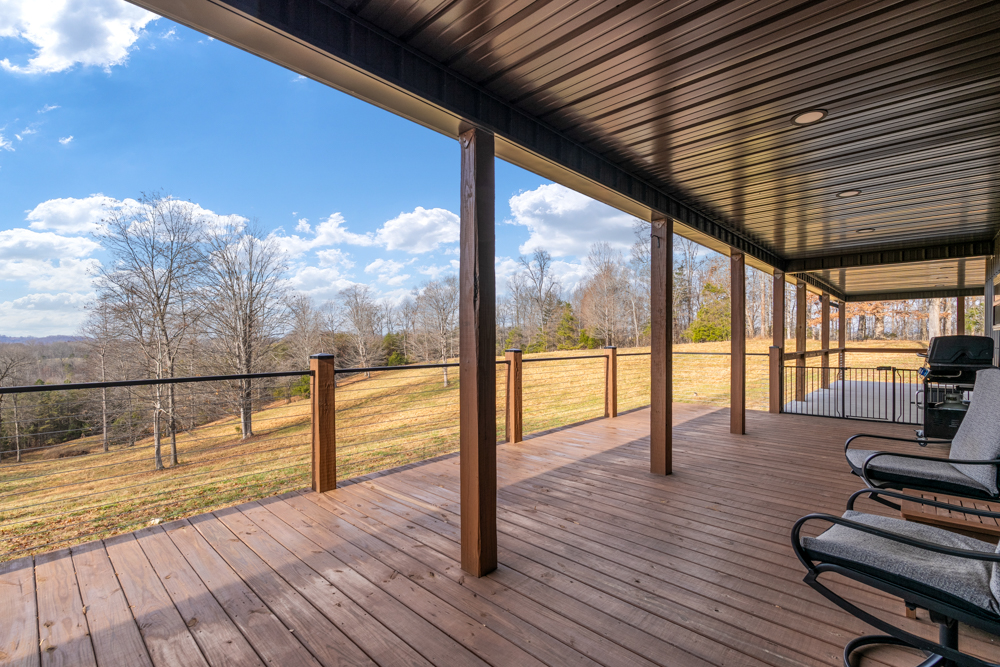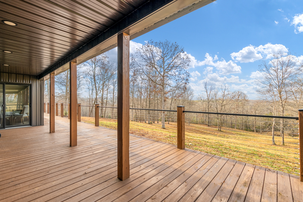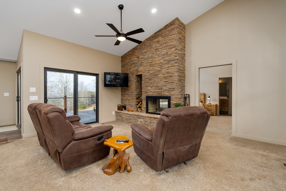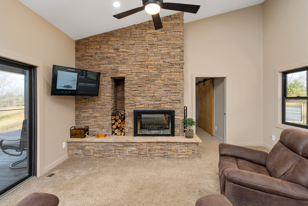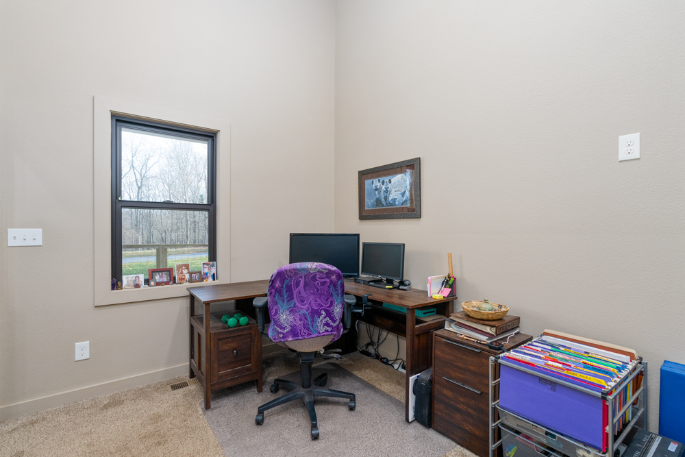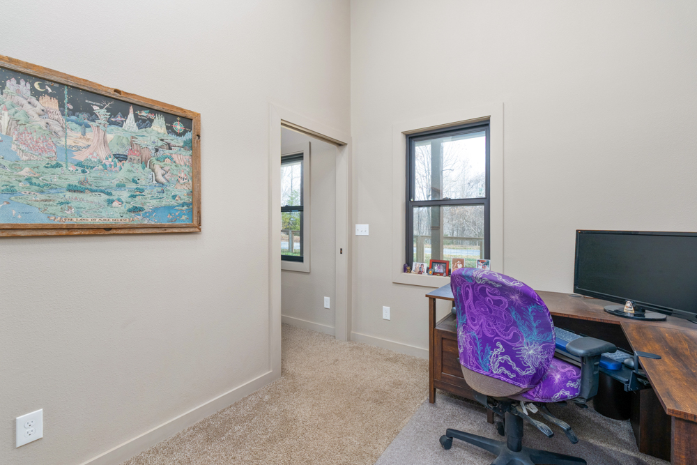 The main living area features a passthrough wood-burning fireplace, rich finishes, and large sliding glass doors for breathtaking views. Just off the kitchen and living room sits a dedicated office, perfect for remote work or creative pursuits. Walk-in closets, durable metal roofing and siding, and a full-length back porch overlooking the hills make this home as practical as it is inviting.