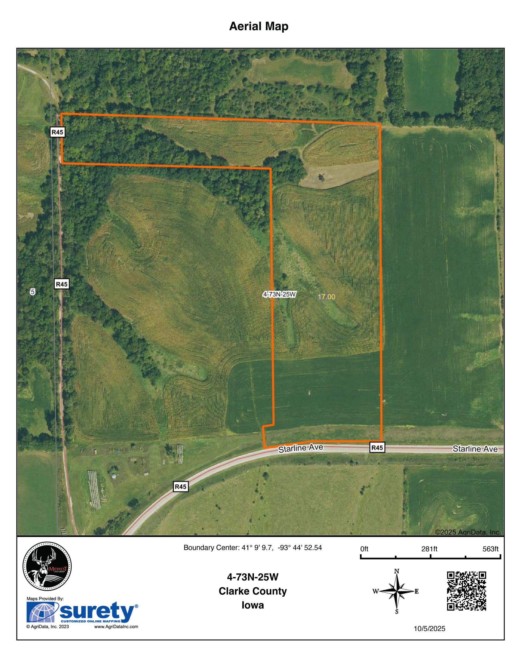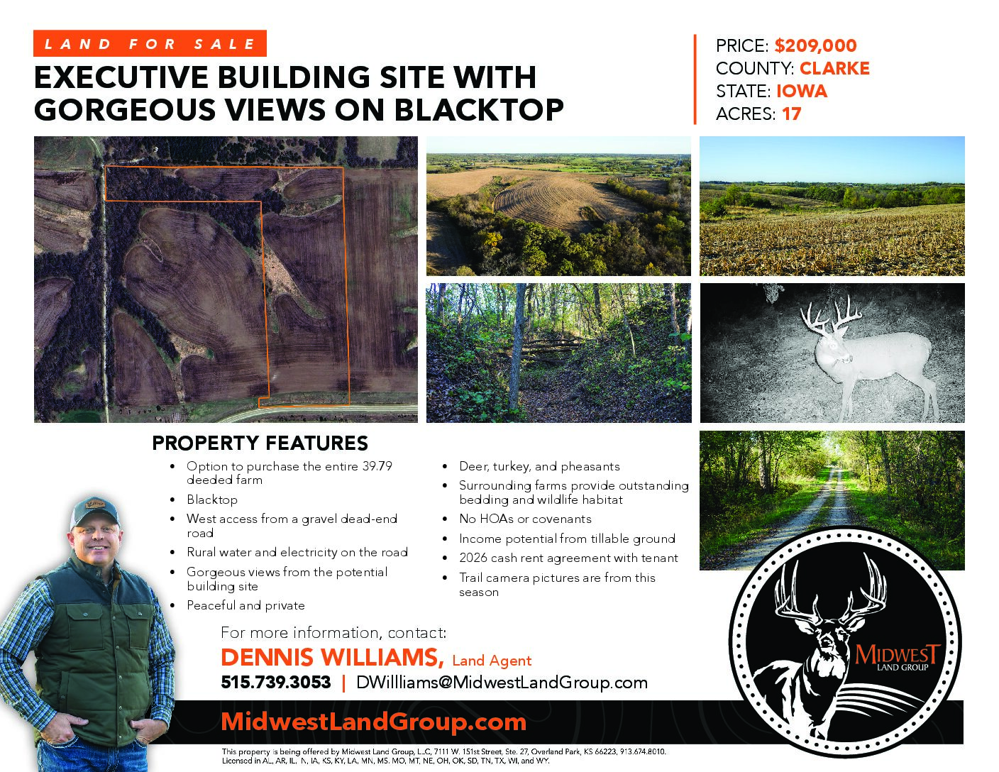 Midwest Land Group is pleased to present this hard-to-find executive building site with gorgeous views and blacktop frontage just 35 miles south of West Des Moines and 2 miles south of New Virginia. Approximately 17 +/- acres (subject to survey). Rural water and electricity available at the road.Enjoy peaceful, private country living with income potential from tillable acres and a 2026 cash rent agreement with the current tenant. Excellent trophy deer, turkey, and pheasant hunting with proven genetics and trail camera photos from this season. Surrounding farms provide outstanding bedding cover and wildlife habitat.