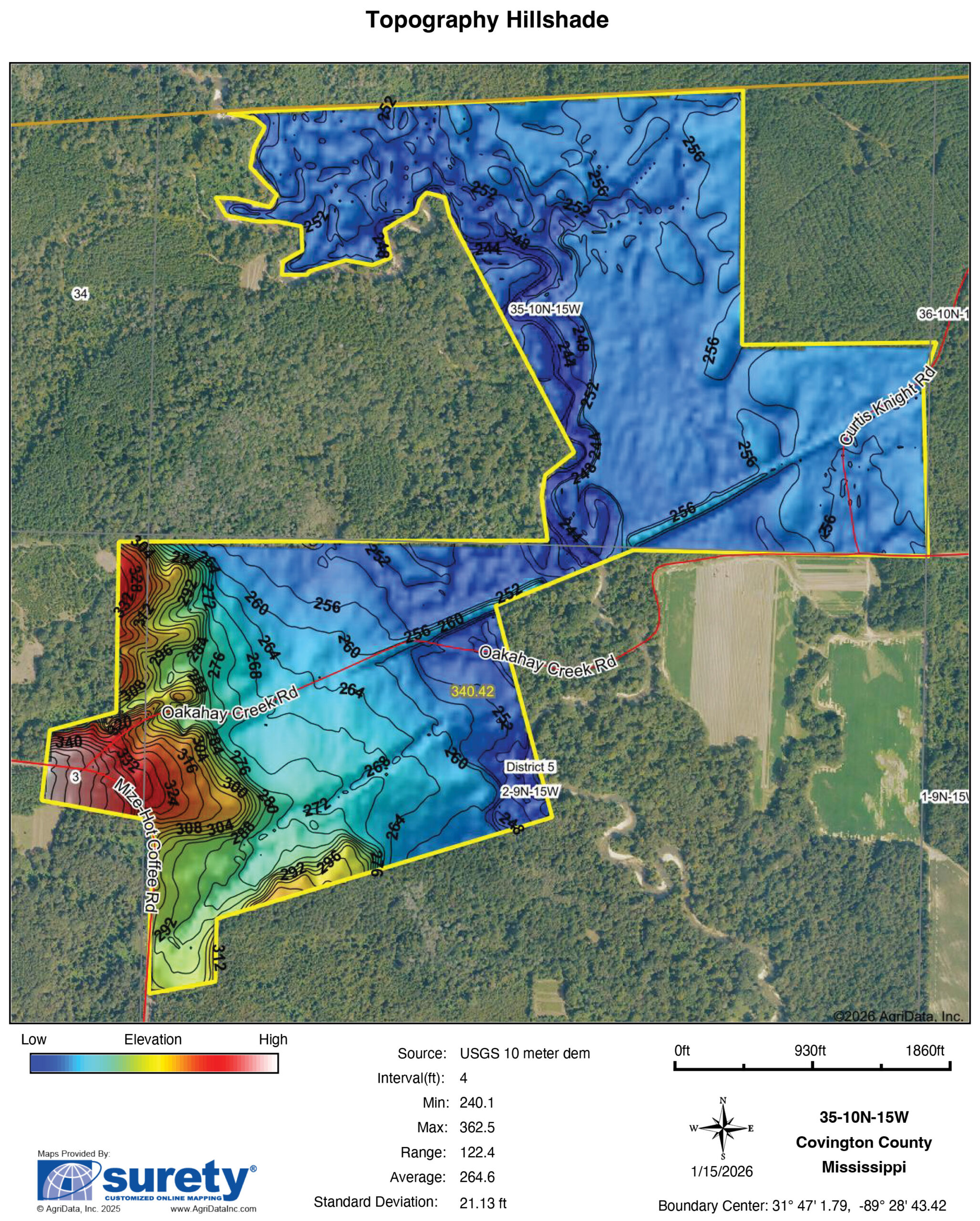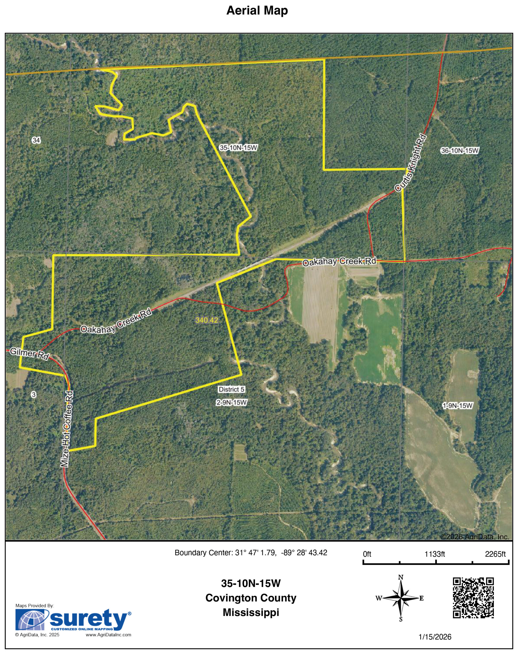 Located just south of Taylorsville on Oakahay Creek Road, this exceptional 354-acre tract is a premier timber and recreational property in the heart of Covington County. The land features a highly desirable and diverse timber profile, including over 180 acres of well-managed 32-year-old Loblolly Pines, approximately 100 acres of 15-year-old pine plantation, and more than 65 acres of mature hardwoods lining scenic Oakahay Creek, which flows directly through the property.With over 1.5 miles of paved county road frontage, access is excellent, and both power and community water are available. Oakahay Creek and its numerous sloughs create outstanding wildlife habitat, particularly for waterfowl, making this a strong duck hunting property. The land also offers excellent whitetail deer hunting, with abundant deer sign observed throughout, and includes one established food plot already in place.