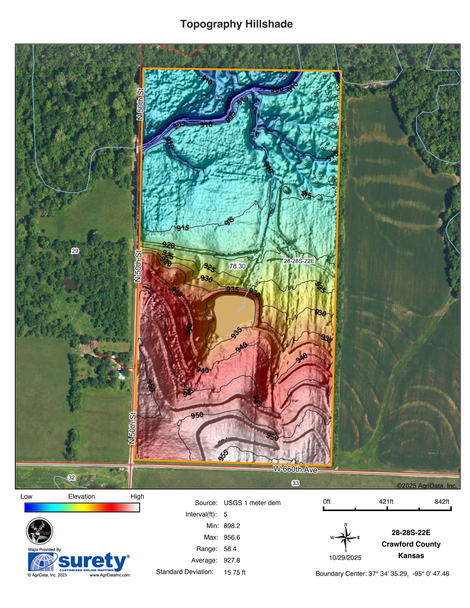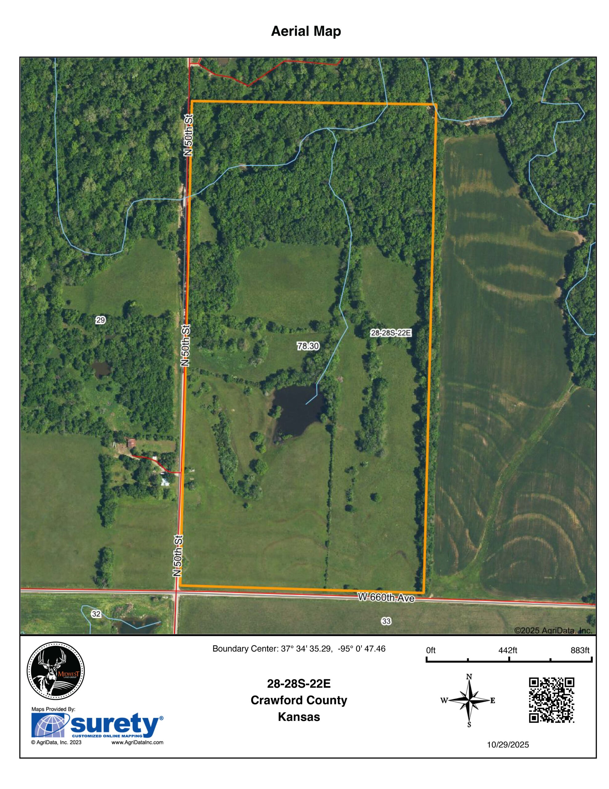 This 78 +/- acre property is located in Crawford County, just southeast of Walnut, Kansas. The property offers exceptional diversity with tillable acres, warm-season native grass, mature hardwood timber, a live creek, and a large fishing pond. There are approximately 30 +/- tillable acres currently in production, consisting primarily of Class II silt loam soils with 1–7% slopes and an overall NCCPI weighted average of 78. The cropland includes well-maintained terraces, waterways, and field edges.The remaining 48 +/- acres feature native grass edges, mature timber, and a live creek that provides year-round water and a natural travel corridor for wildlife. The warm-season native grass edges offer excellent nesting and bedding cover, while the hardwood timber—mixed with oak, hickory, and sycamore—adds a beautiful timber bottom. The large pond adds additional recreation and fishing opportunities. The property offers excellent whitetail deer, turkey, and upland bird habitat and is located in Kansas Deer Management Unit 11.