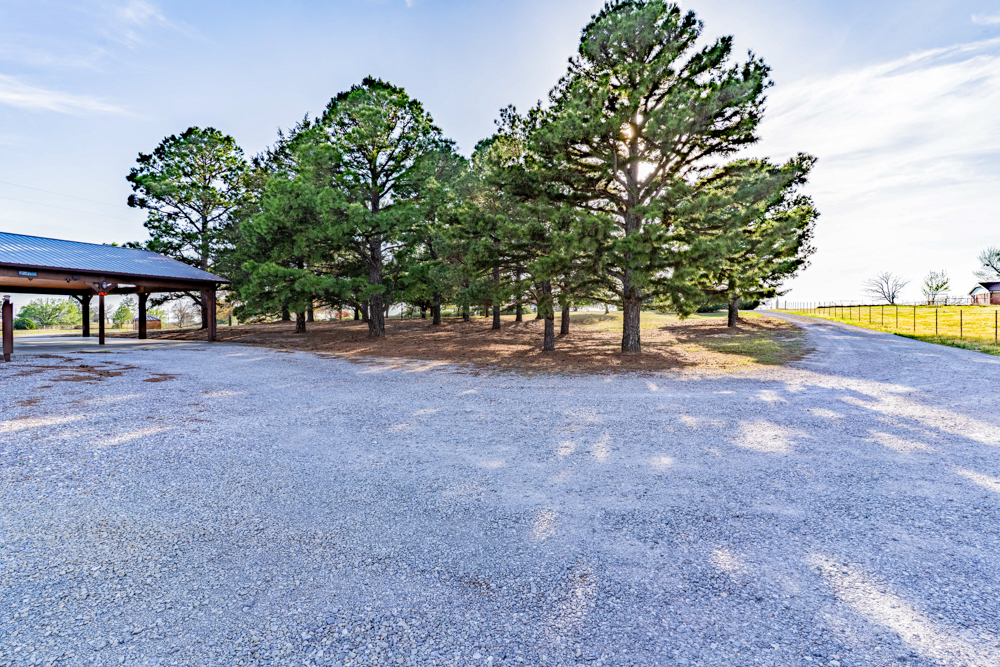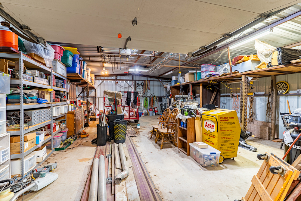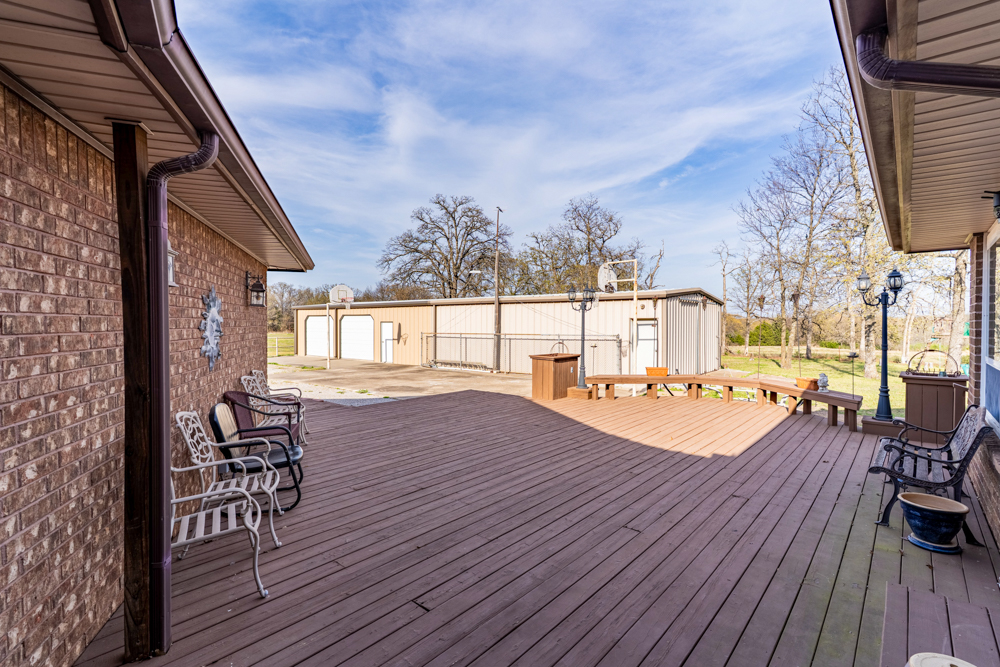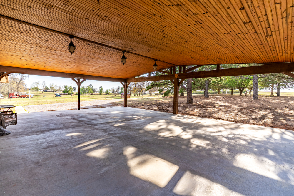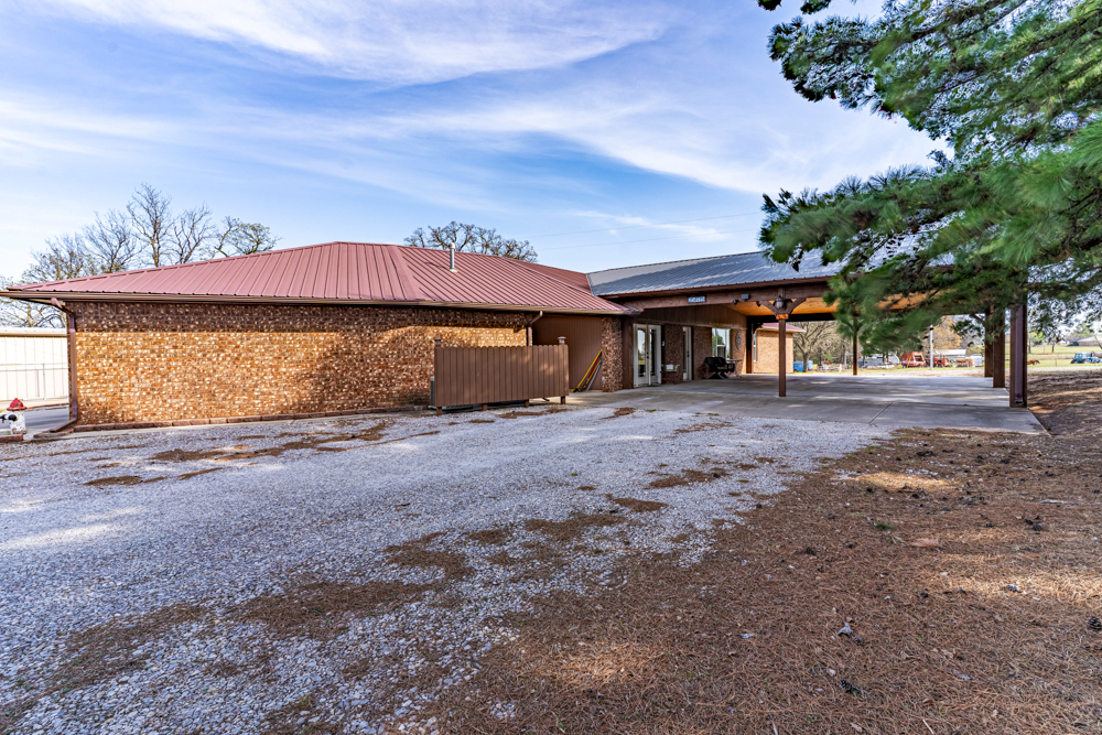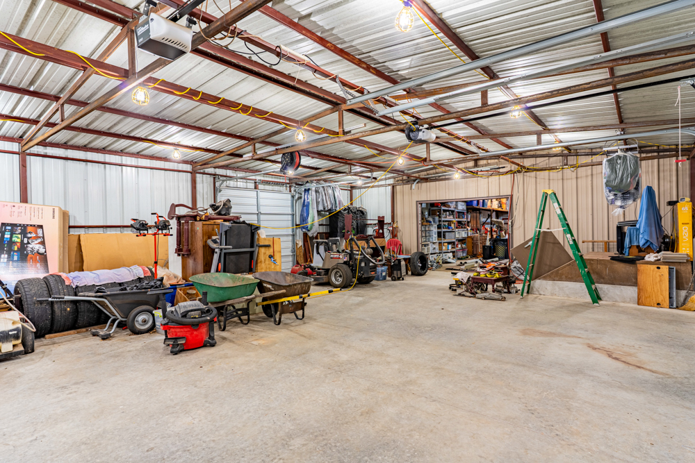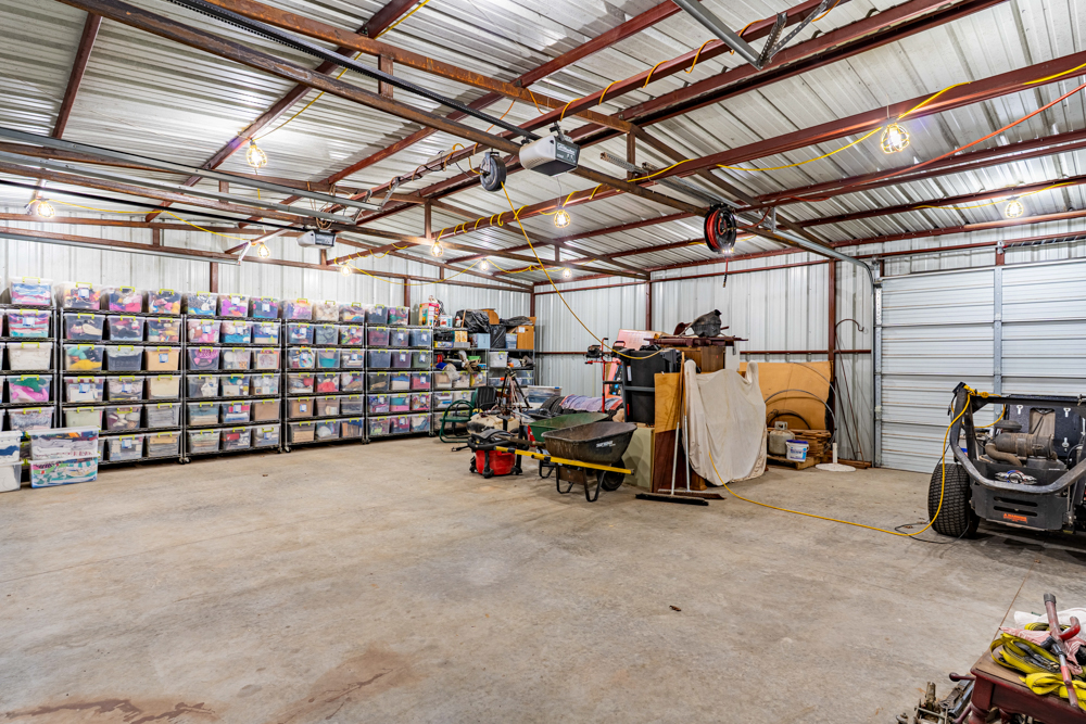 The exterior is designed for both convenience and versatility, featuring a drive-through porte-cochere, connecting breezeway, oversized attached garage, metal roof, multiple outdoor living spaces with two decks, and a 54’x76’ shop that includes a built-in storm shelter.