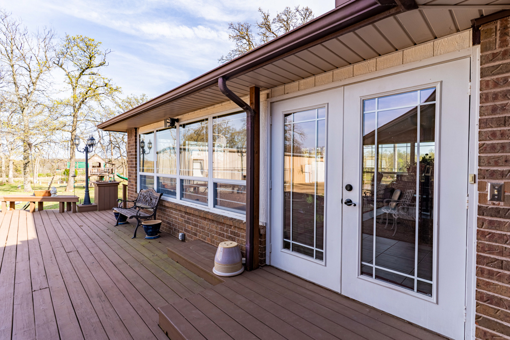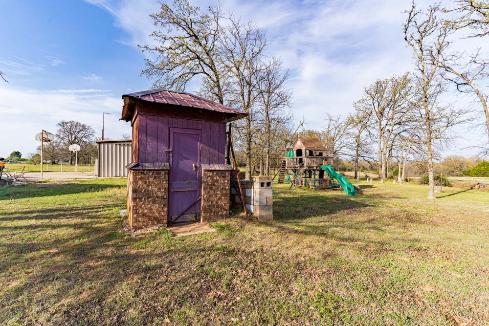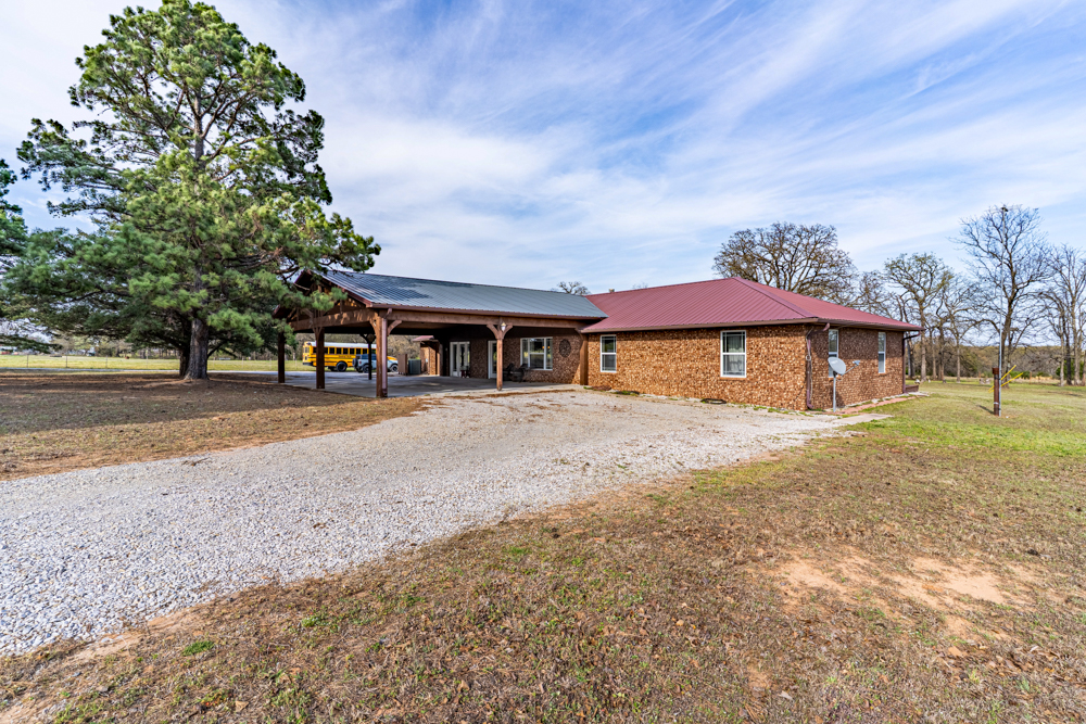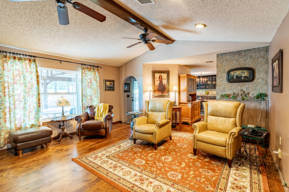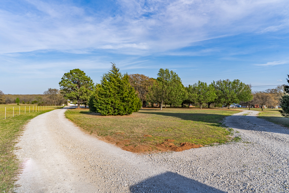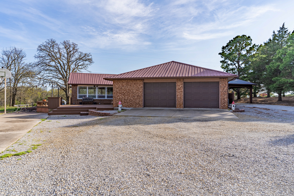 The exterior is designed for both convenience and versatility, featuring a drive-through porte-cochere, connecting breezeway, oversized attached garage, metal roof, multiple outdoor living spaces with two decks, and a 54’x76’ shop that includes a built-in storm shelter.