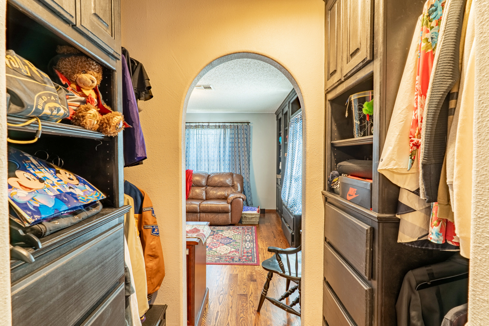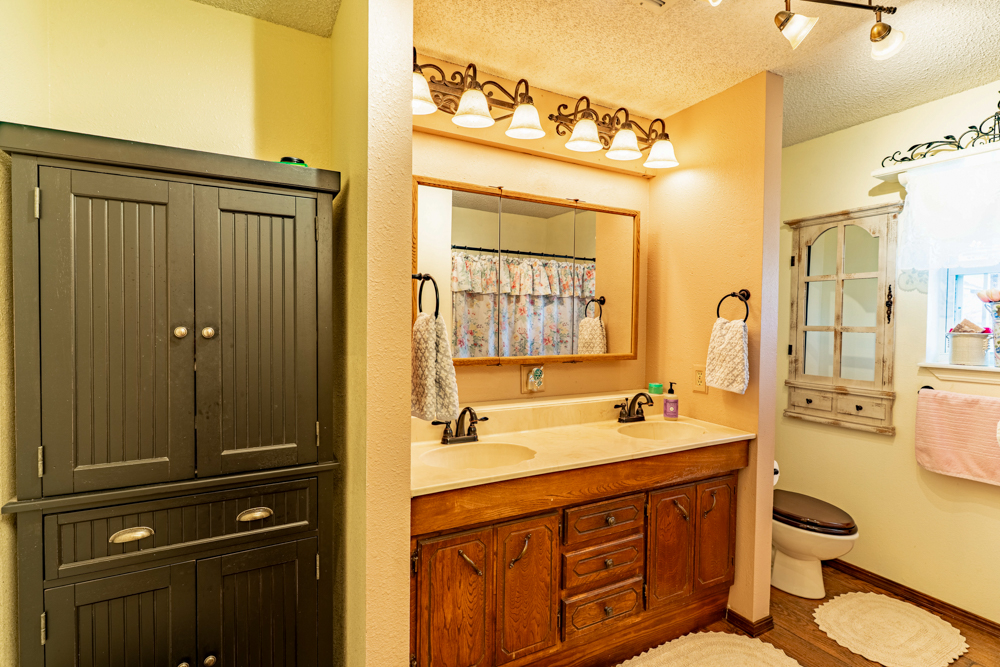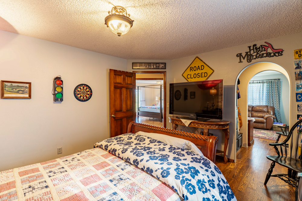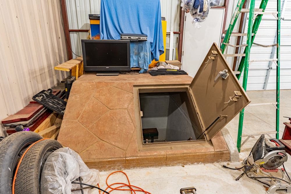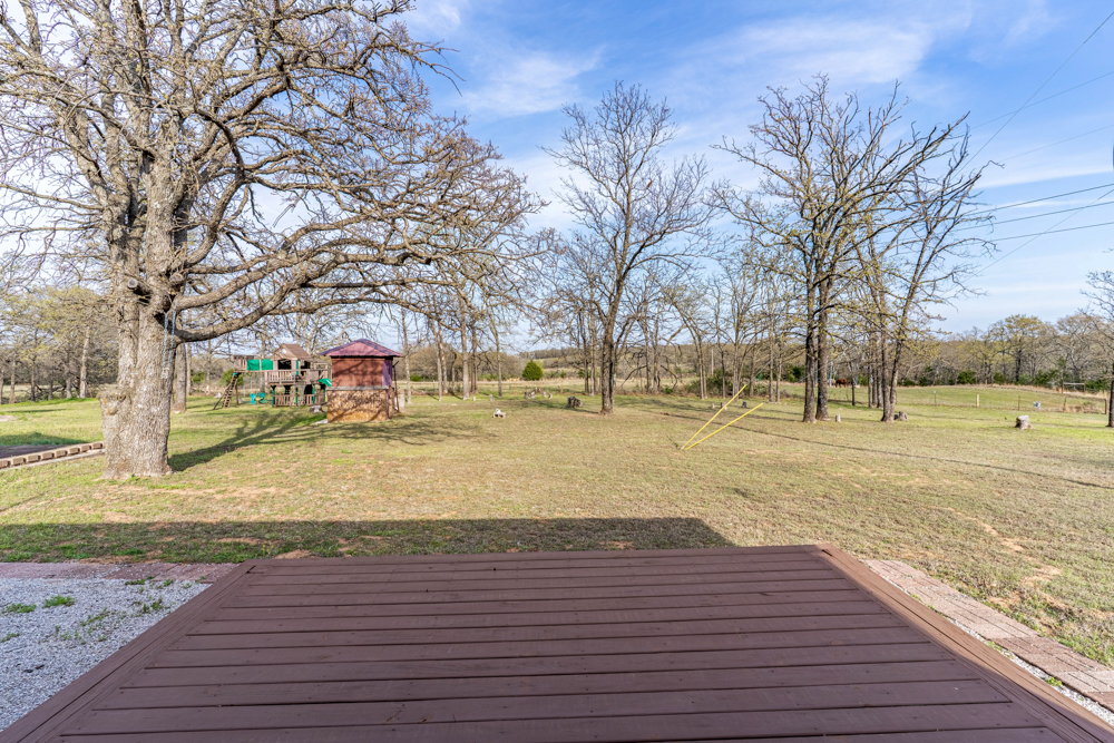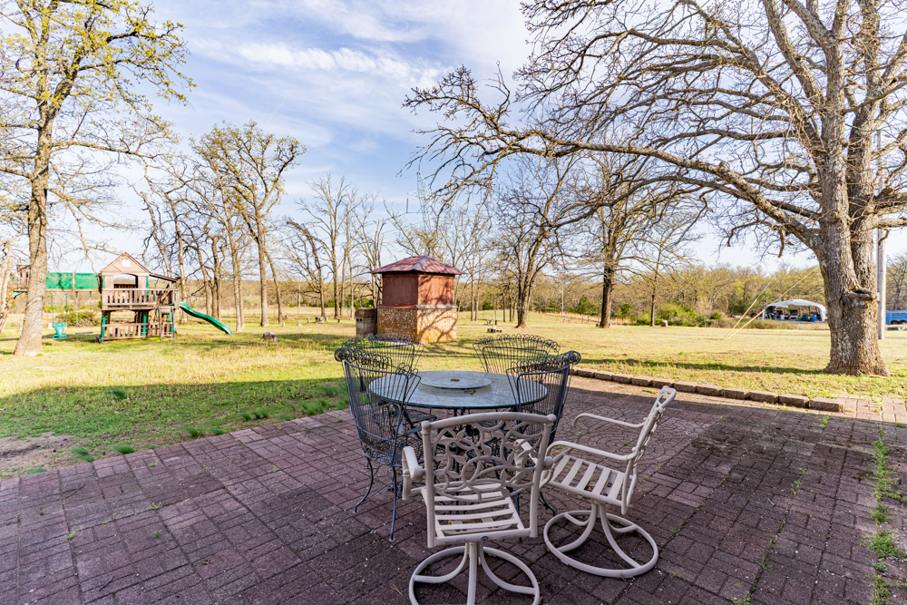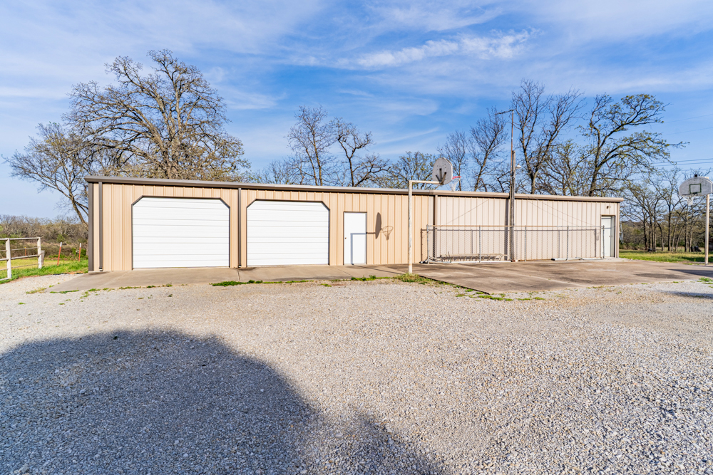 The exterior is designed for both convenience and versatility, featuring a drive-through porte-cochere, connecting breezeway, oversized attached garage, metal roof, multiple outdoor living spaces with two decks, and a 54’x76’ shop that includes a built-in storm shelter.