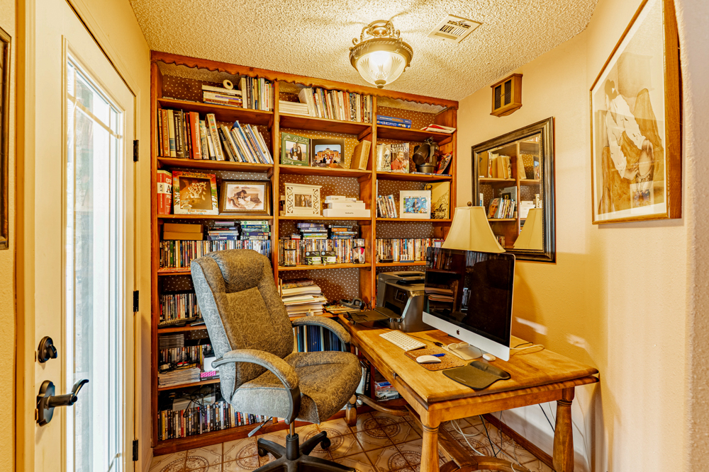 The floor plan offers a dedicated office or library, formal dining space, spacious living room, kitchen, large sunroom, laundry area, powder bath, two full bathrooms, and three well-sized bedrooms. The main living area stands out with its vaulted ceiling, custom built-ins, and a large window that frames beautiful sunset views.