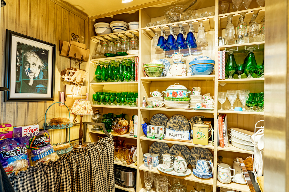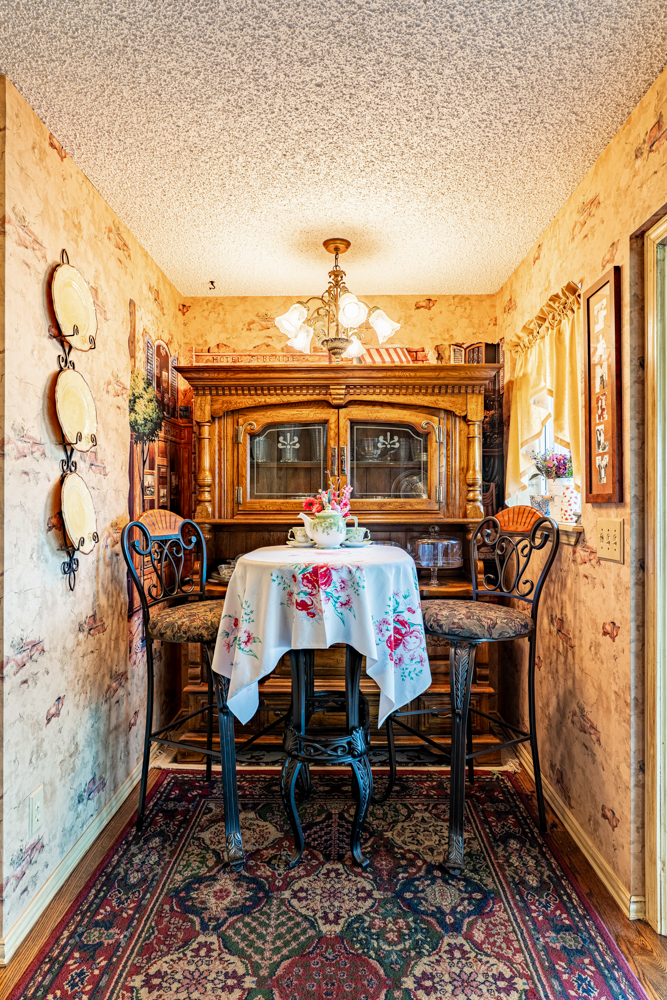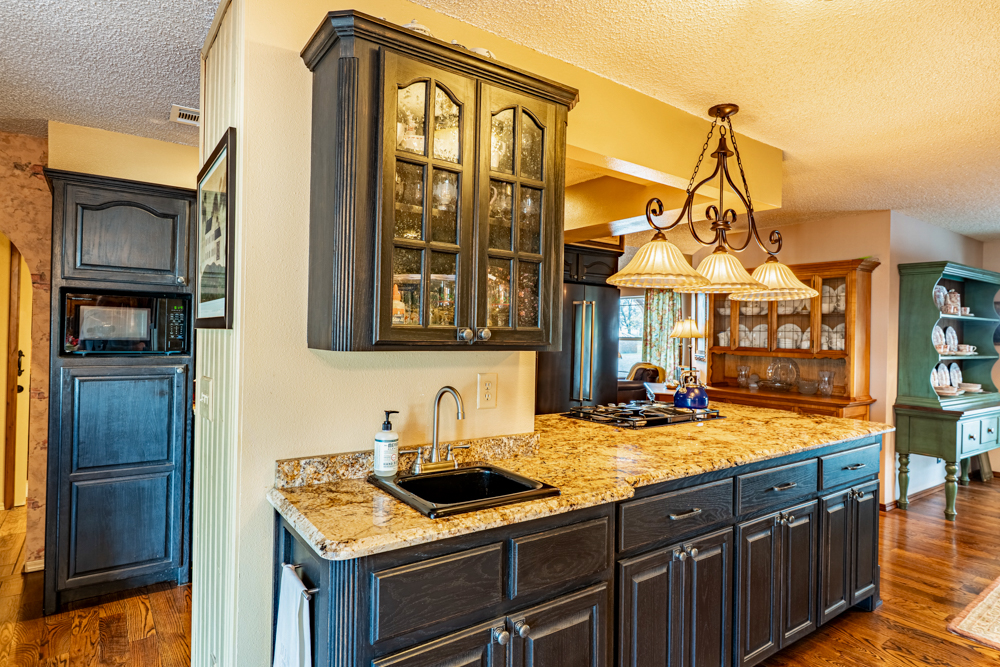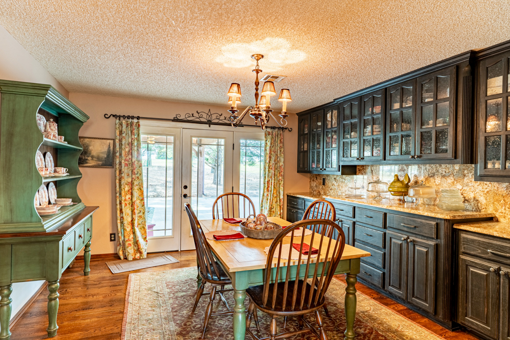 The dining room features custom cabinetry with decorative glass accents and generous storage. The kitchen continues with matching cabinetry and is fully outfitted for the home chef, complete with a gas cooktop, double convection ovens, 2 dishwashers, a built-in ice maker, an oversized island with granite countertops, a walk-in pantry, and a breakfast nook.