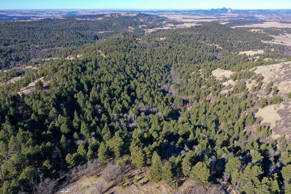 Set high upon a wide-open grassy plateau at roughly 5,200 feet in elevation, this remarkable 80 +/- acre holding commands unobstructed views of Devils Tower and the rugged silhouettes of the Missouri Buttes. From this vantage, the land rolls outward in every direction — big sky overhead, pine-dark ridges beyond, and the kind of silence that settles deep in your chest. Tucked up Lytle Creek along Bear Lodge Road, just 11 miles south of Hulett as the crow flies, the setting feels both secluded and sovereign — an elevated sanctuary in the shadow of Wyoming’s most storied monolith.