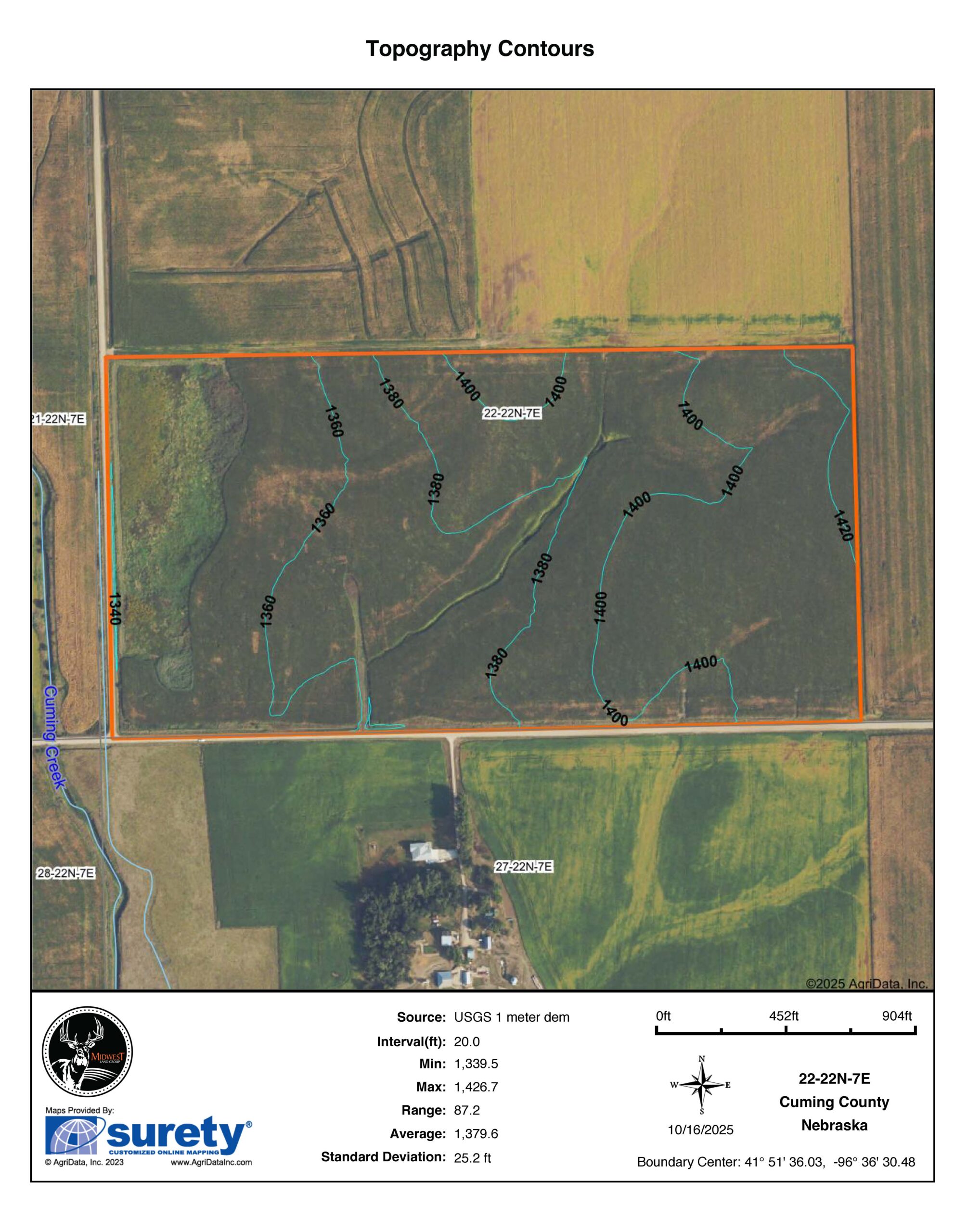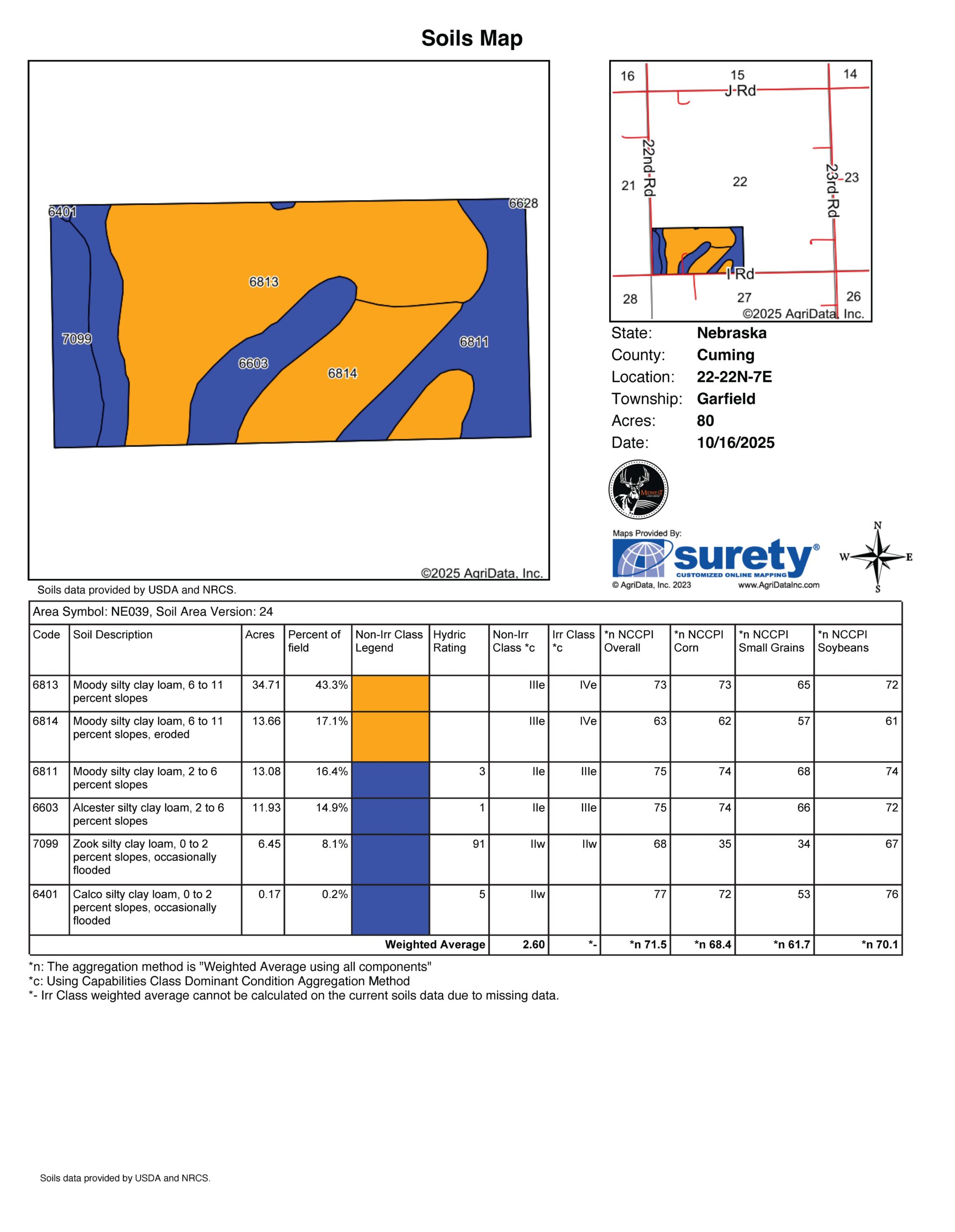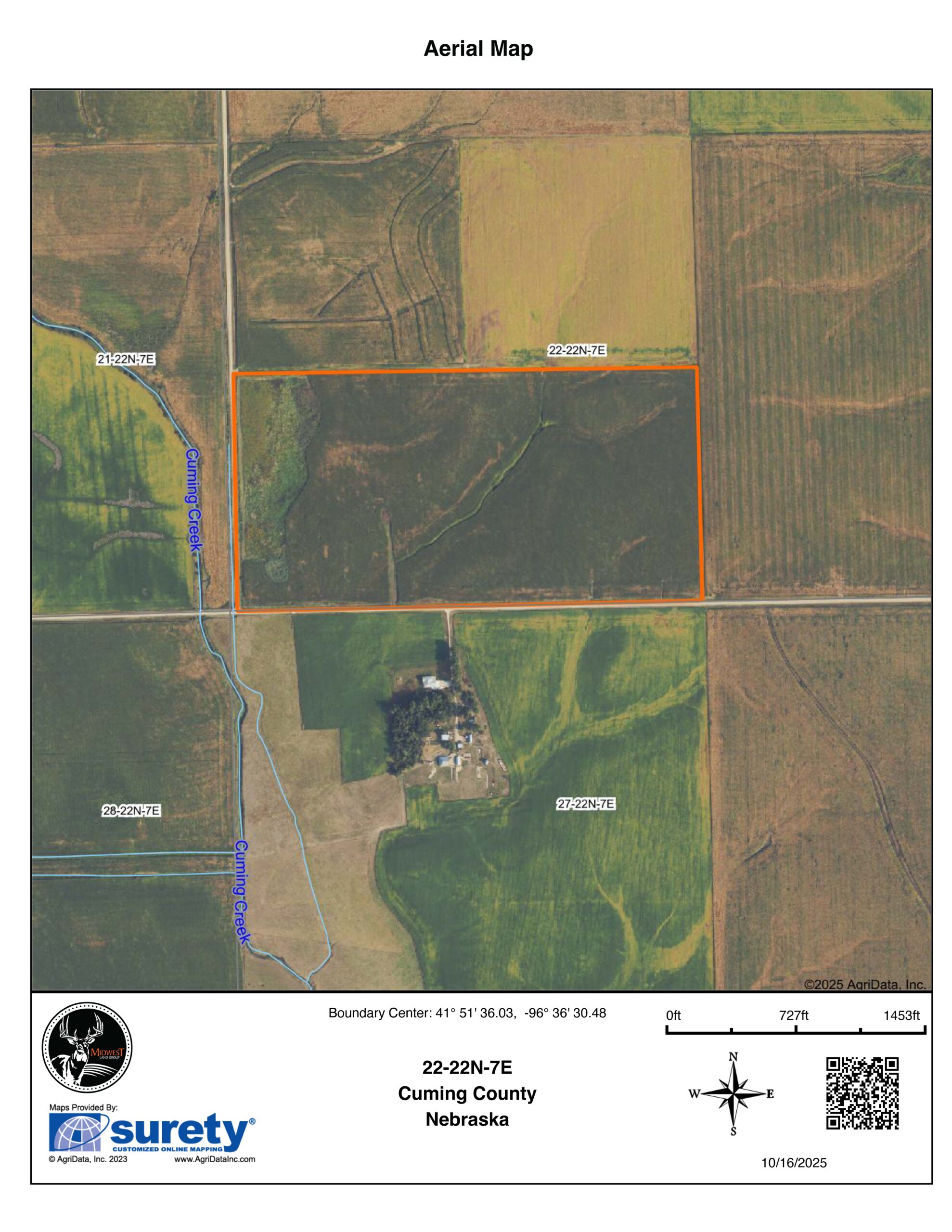 This beautiful Cuming County, Nebraska 80 would make a great addition to any producer or investor’s portfolio. The farm lies directly between West Point and Oakland, Nebraska and lies only two miles north of Highway 32 at the intersection of 22nd and I Road. Most of the farm is gently rolling with only a few well-maintained waterways. With mostly Moody, Alcester, and Zook class II and III soils, this farm has an overall NCCPI rating of 71.5. This farm has been extremely well managed by a longtime tenant for many years and is now open for the 2026 growing season. Roughly eight acres on the west side of the farm, along I Road, has grown into a tall, lush mix of native and wetland grasses creating phenomenal habitat for the healthy populations of pheasants and quail in the area. The waterways are also thick enough to hold birds for the upland hunter. This 80 is a top producer in an area with some of the best dryland acres in Eastern Nebraska.
