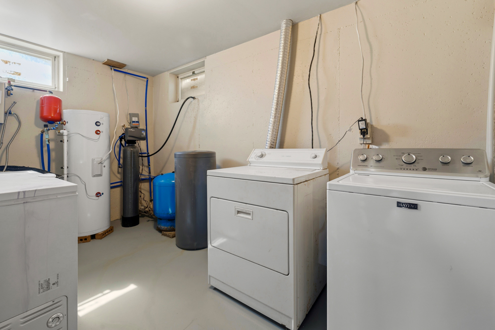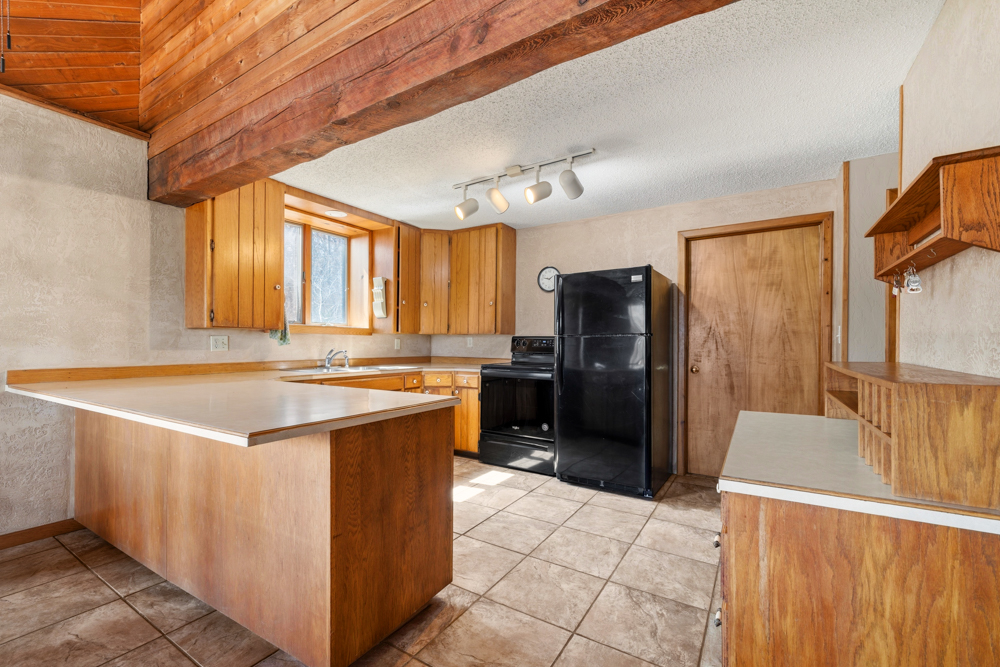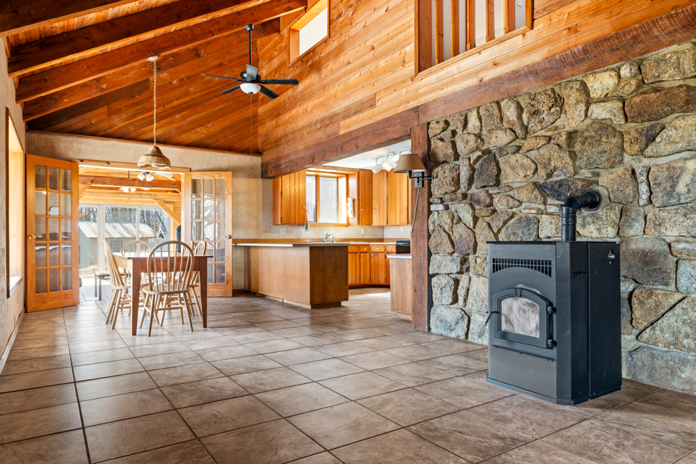 The layout includes 3 bedrooms and 1.5 bathrooms. The kitchen appliances stay, along with the washer, dryer, and deep freeze, making the home move-in ready. The living room features a pellet stove, adding warmth and rustic charm during cooler months.