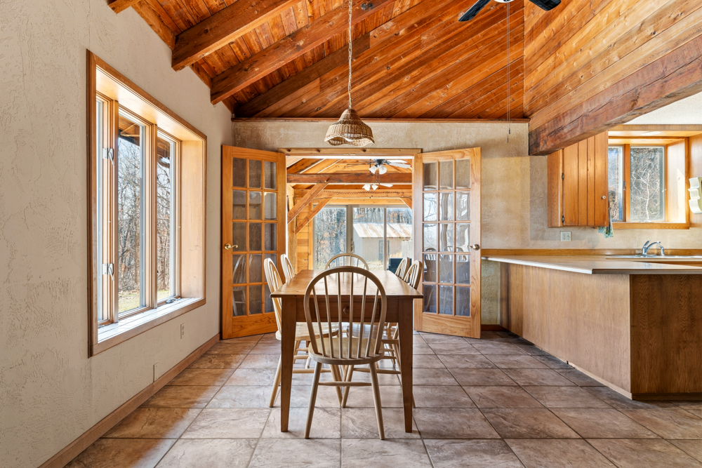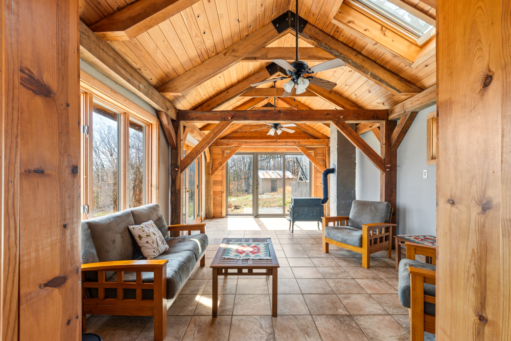- Sunroom with hand-cut pine logs