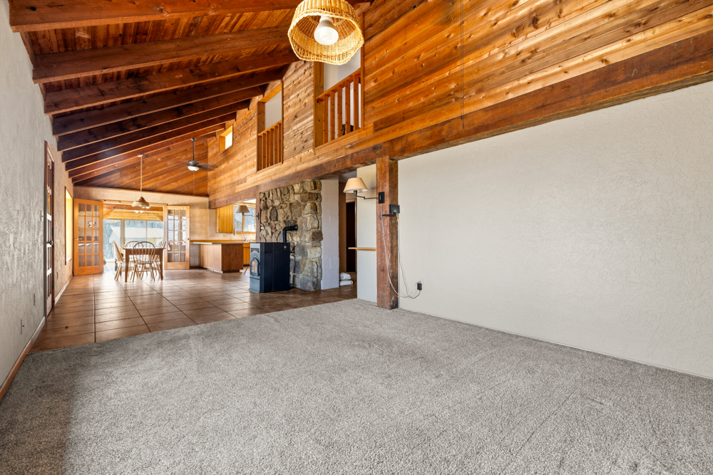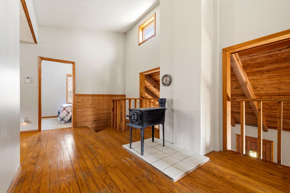 Inside, the home features warm cabin charm and unique character throughout. The beautiful sunroom is a true highlight, featuring hand-cut pine logs, abundant windows that fill the space with natural light, and a cozy wood stove, the perfect place to unwind in every season. The interior also offers tall ceilings, fresh paint, a spiral staircase, and inviting living spaces designed for comfort.