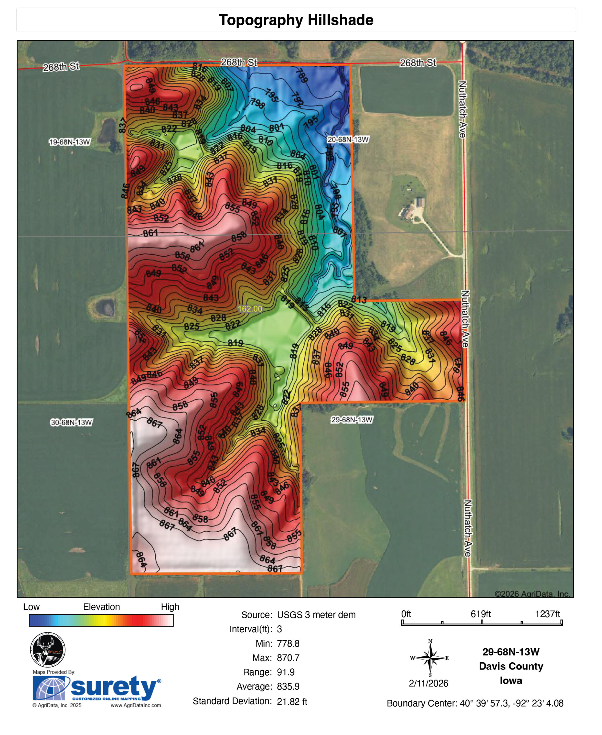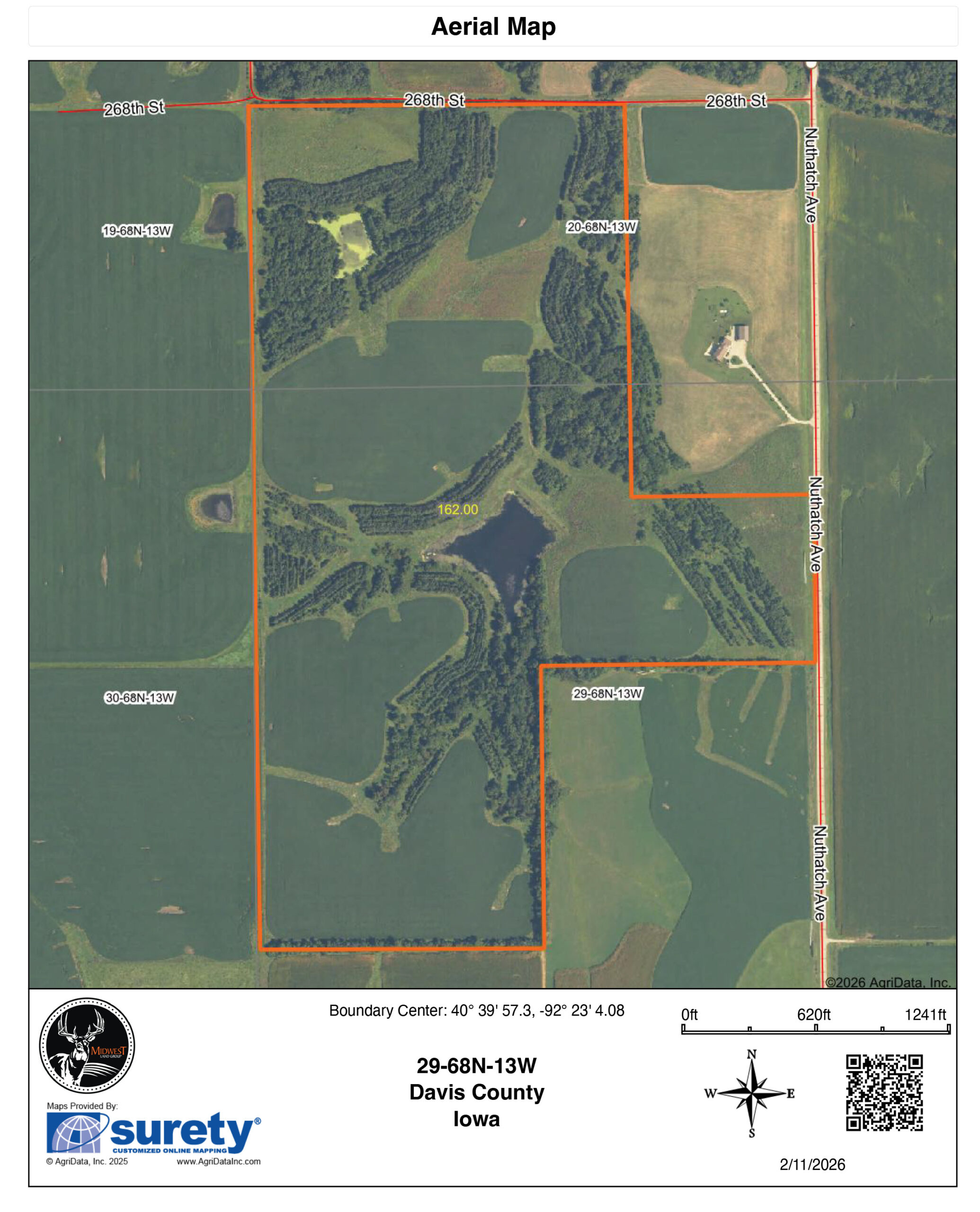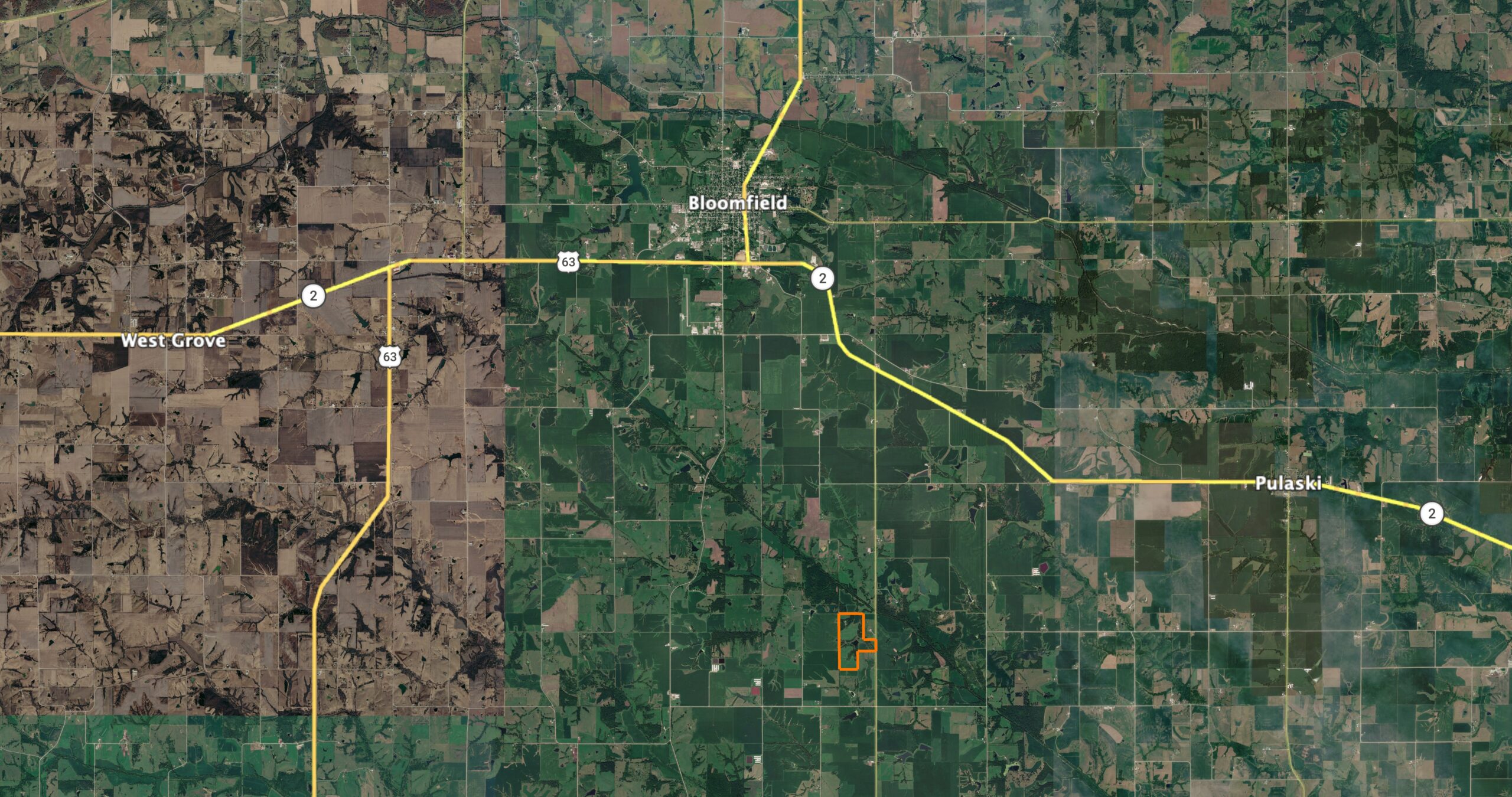 Welcome to an exceptional 162 +/- acre property in the heart of Davis County, Iowa—an area known for premier whitetail hunting, strong agricultural returns, and highly desirable rural living. Located just 10 minutes from Bloomfield and only 6 minutes from the Missouri border, this property blends accessibility with seclusion. With paved road frontage and utilities available, it provides an ideal foundation for future building sites while preserving the beauty and privacy of the surrounding landscape.The farm features a perfect balance of habitat and income. Mapping estimates approximately 67 +/- current tillable acres (according to Surety), and the current owner is open to cash-renting the cropland to the buyer for immediate return. An additional ~$8,000 in CRP income further strengthens the investment profile. The remaining acres showcase mature oak and cedar timber, rolling terrain, and outstanding deer signs – scrapes, rub lines, and heavy trails throughout. Two stocked ponds, one approximately 3.5 acres and the other over 1 acre, offer fishing, waterfowl potential, and relaxing views. Multiple access points enhance huntability and farming flexibility.