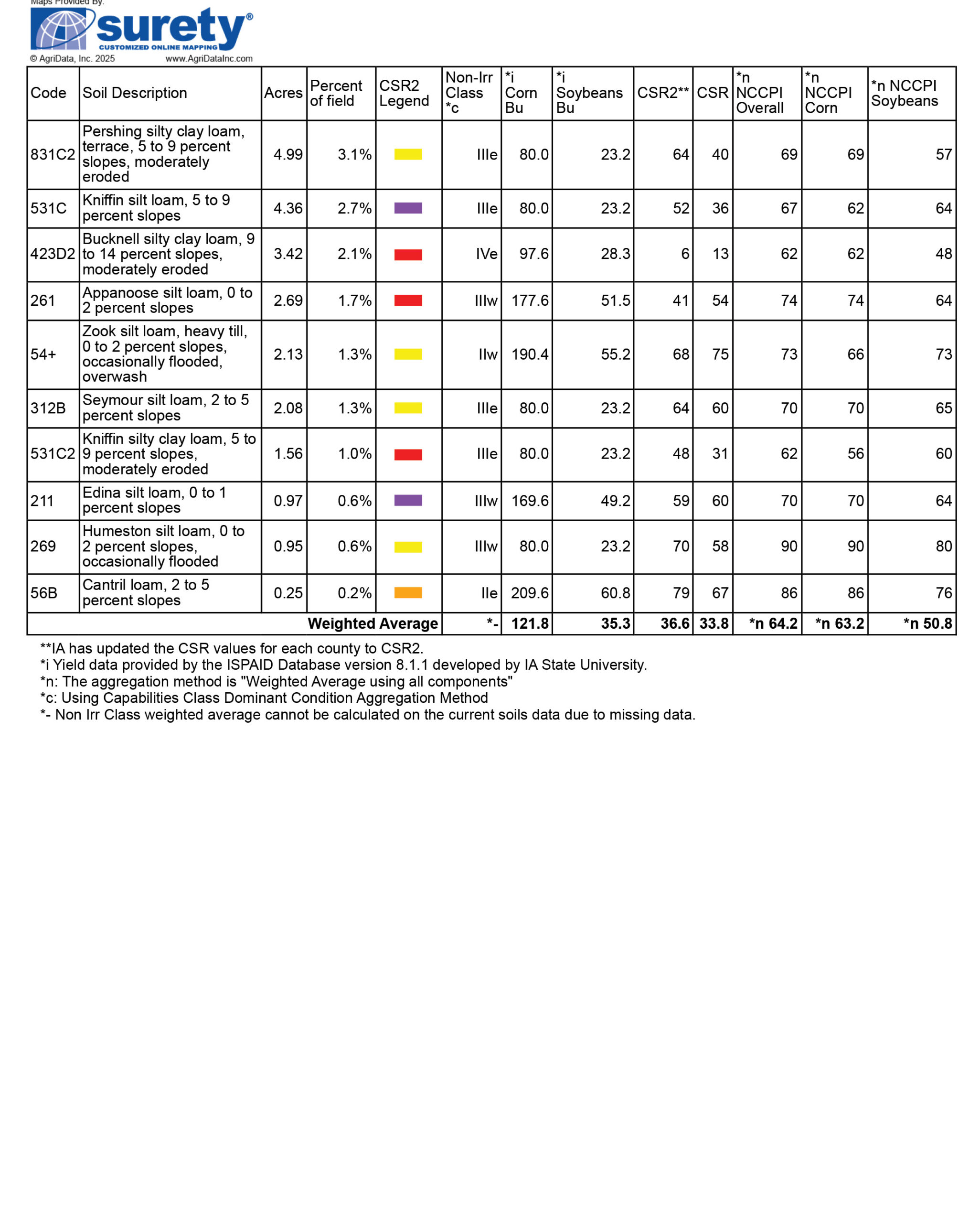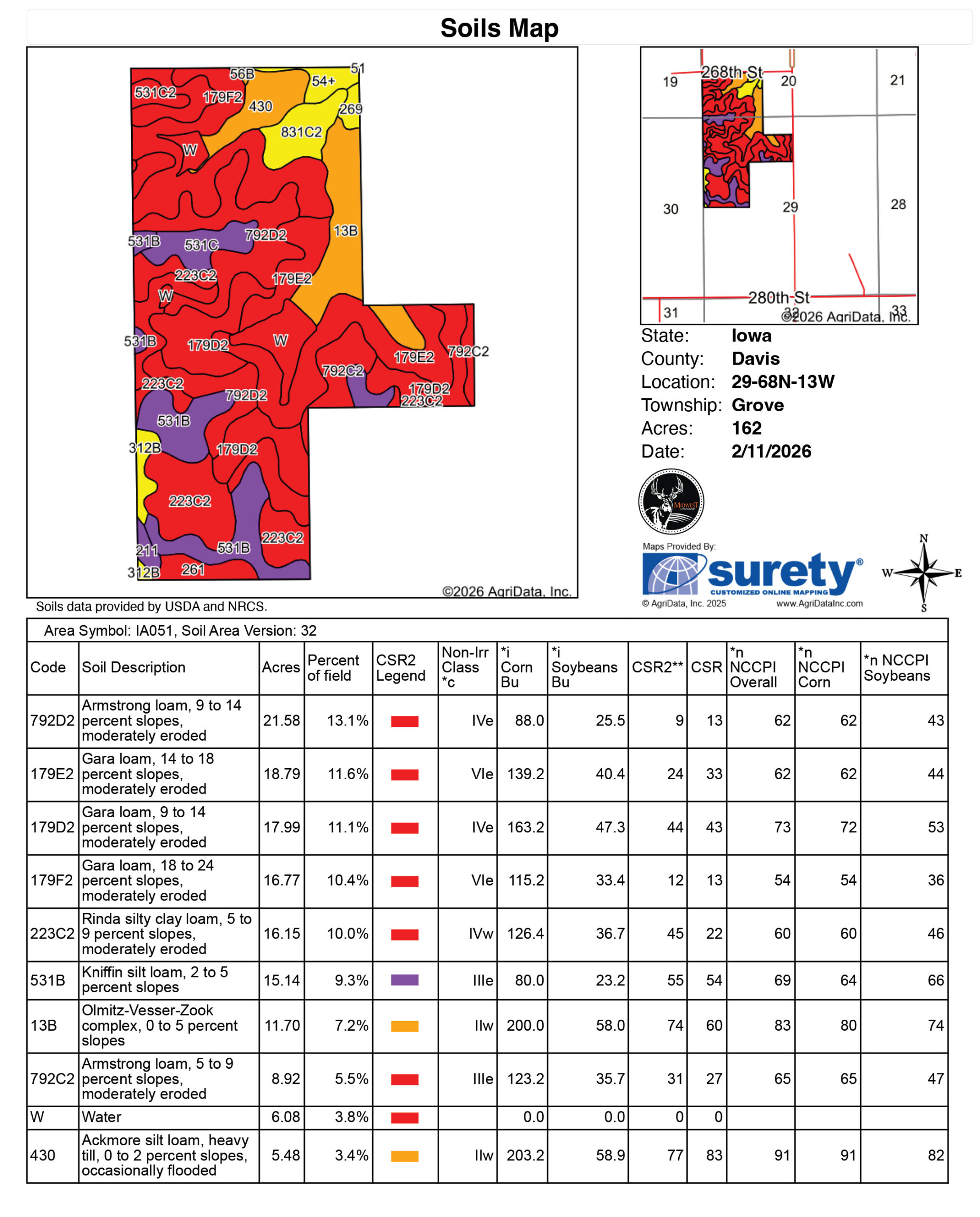- Approximately 67 +/- current tillable acres according to Surety (seller would consider cash rent to buyer)