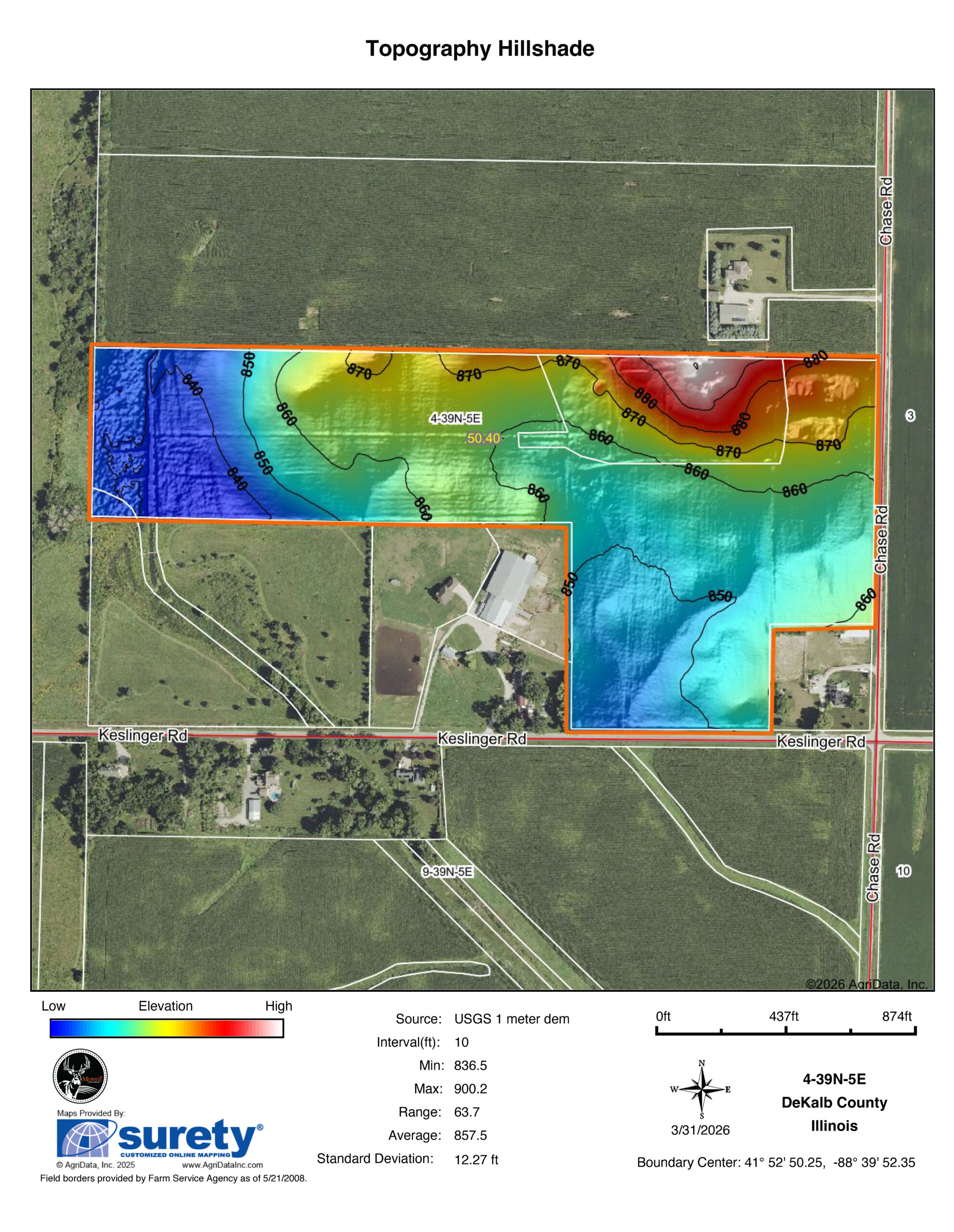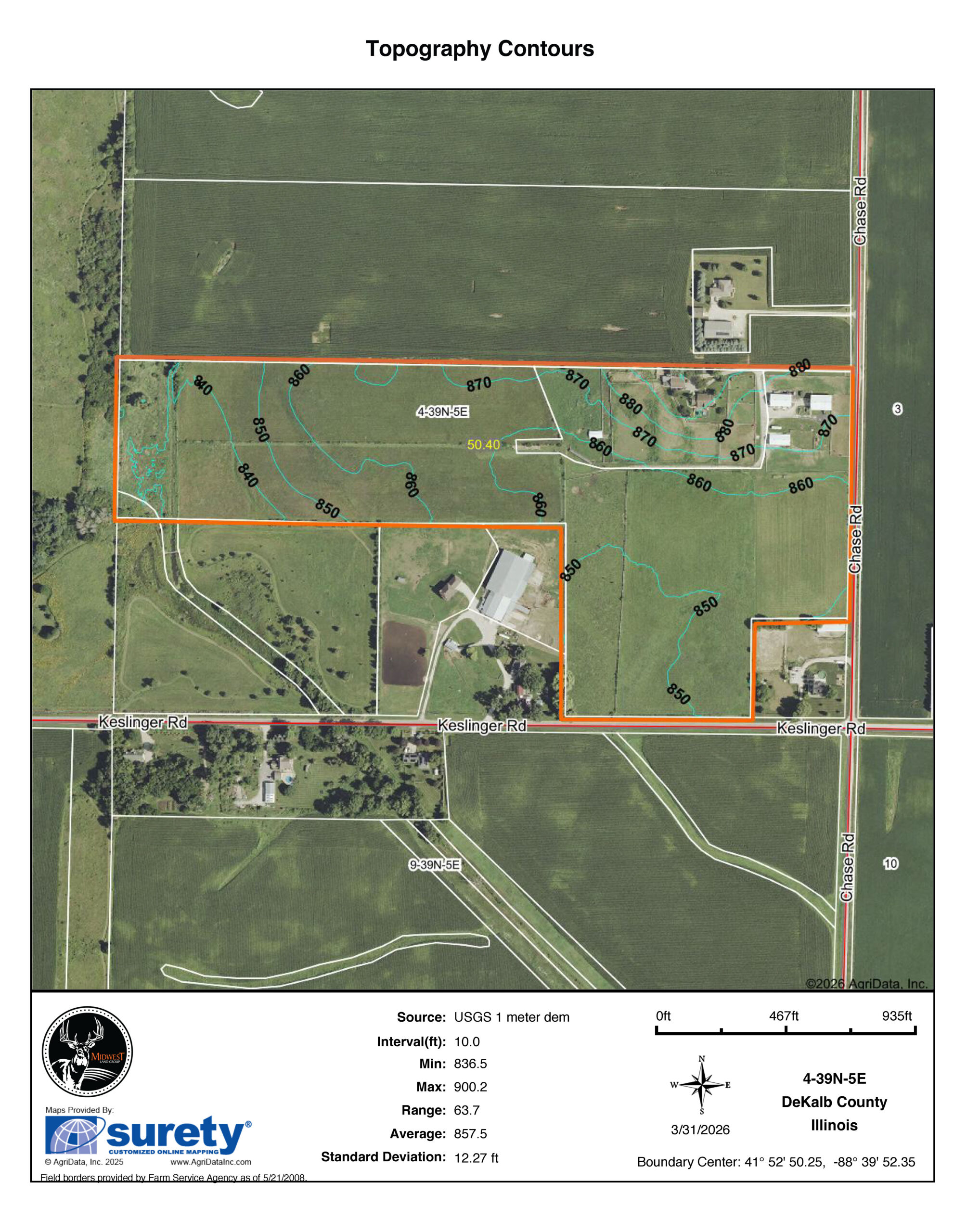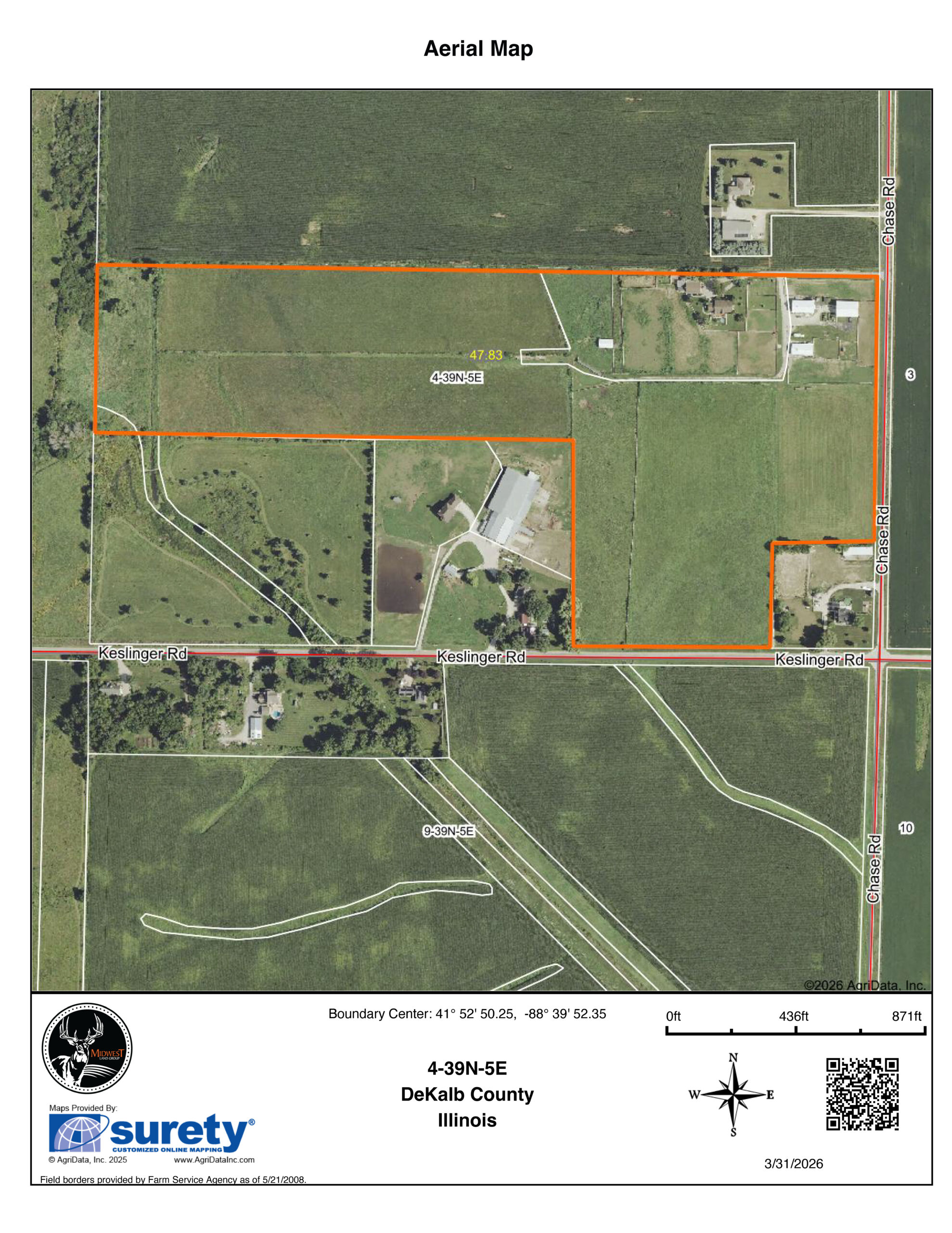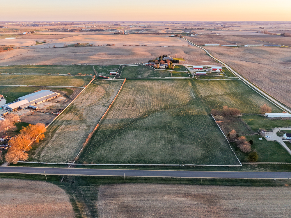The 50.04 +/- acres include easily accessible, gently rolling tillable (37 acres +/-) currently in hay and pasture ground (11 acres +/-) with a strong average Productivity Index (PI) of 133.3—prime DeKalb County soil known for productivity.
