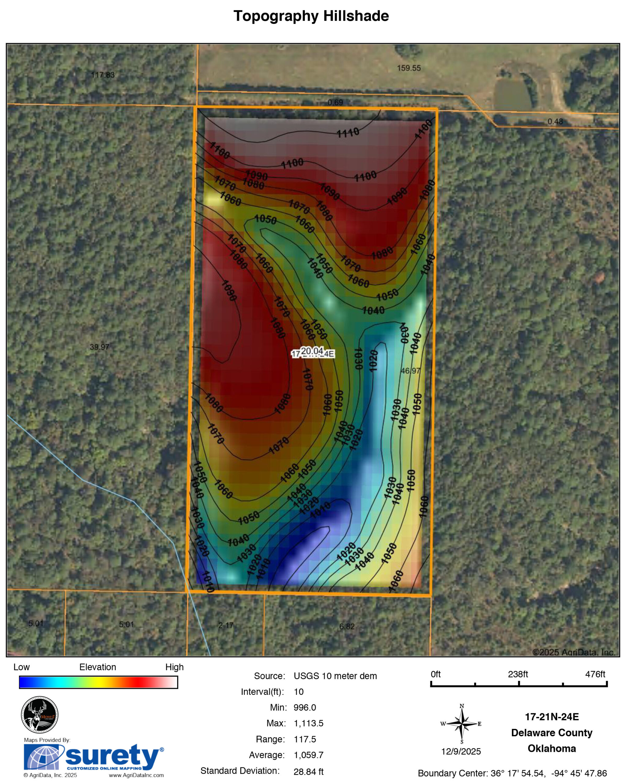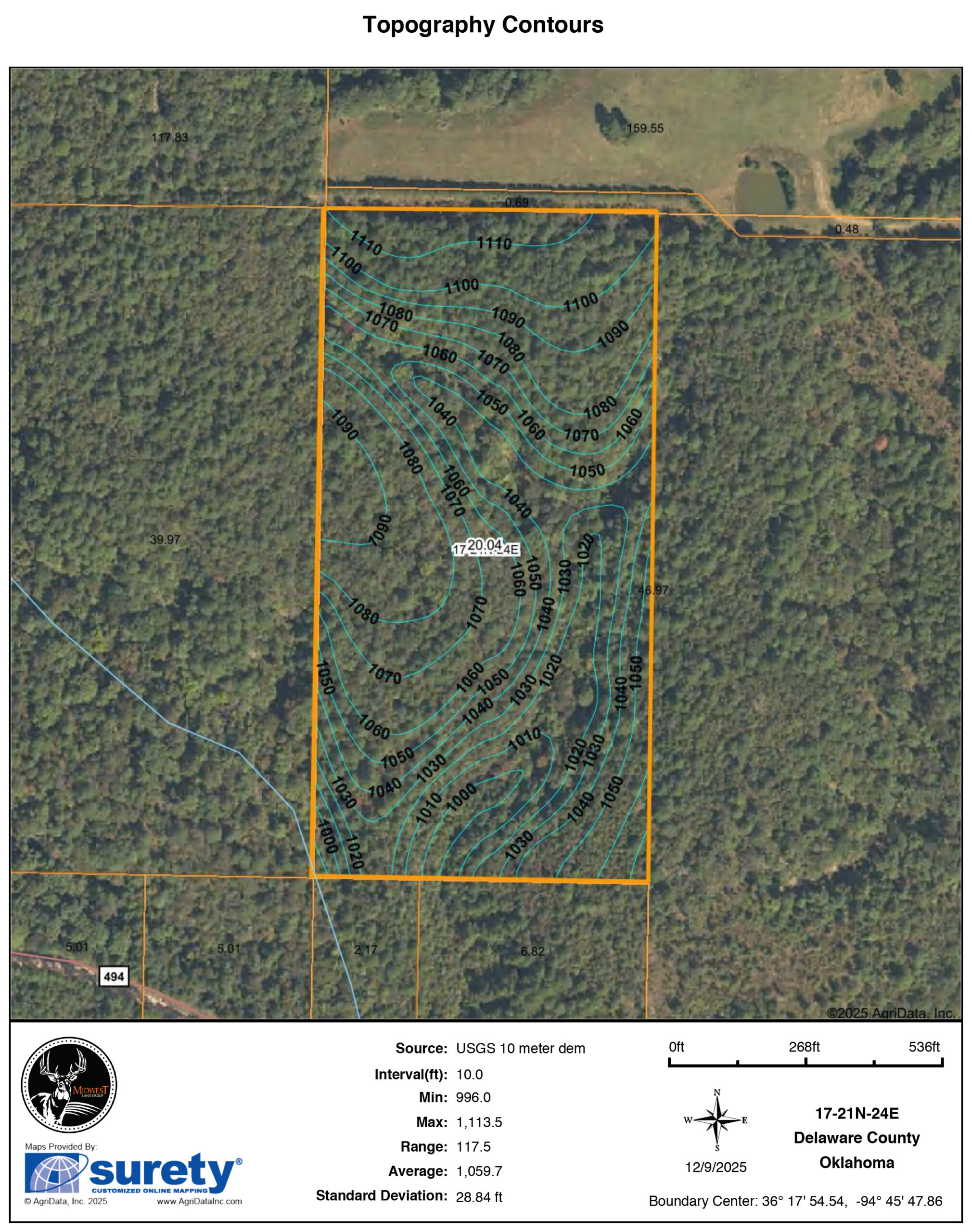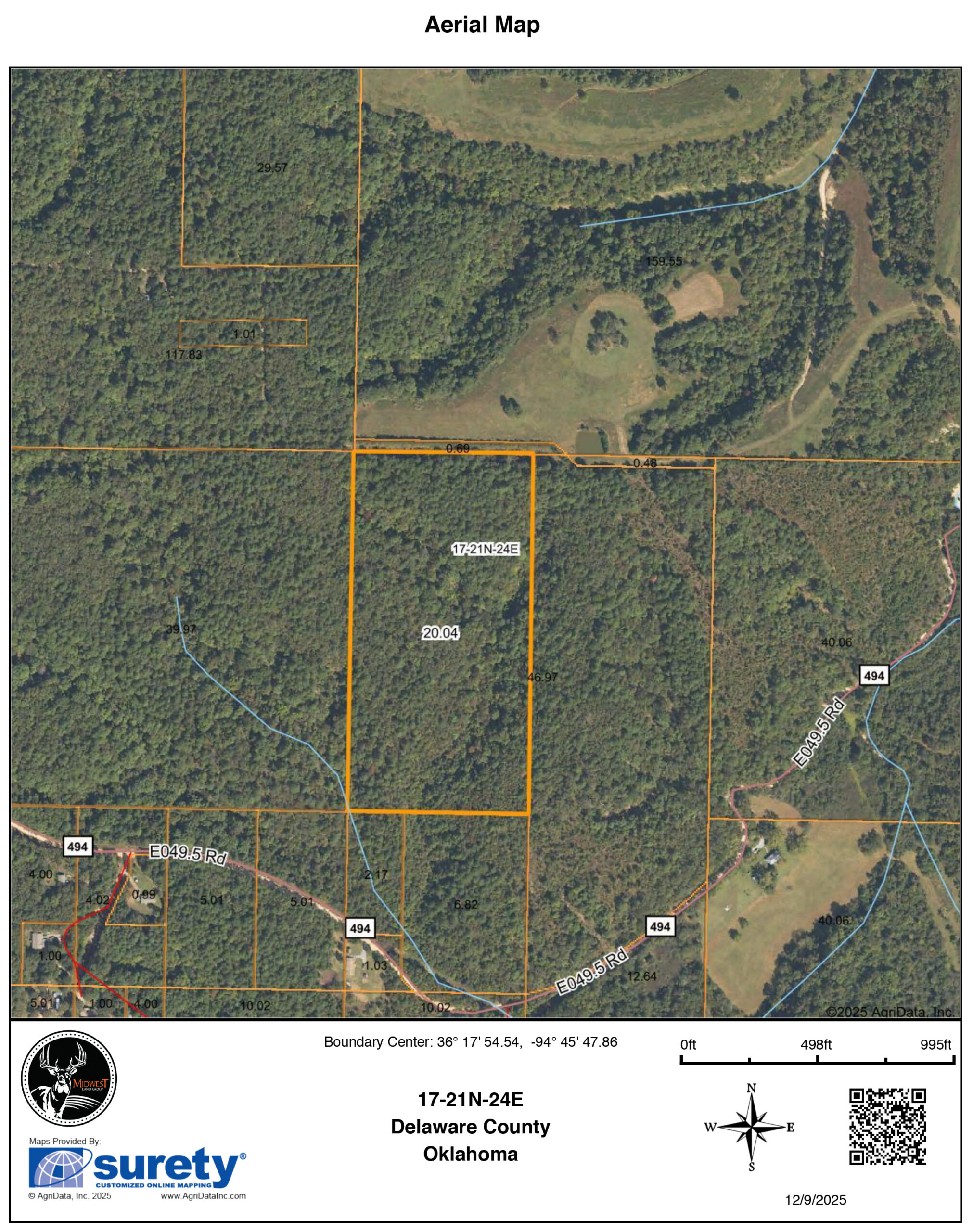 This secluded Delaware County tract consists of 20 +/- acres and will provide the new owners with several possibilities and opportunities in a smaller parcel. Electric is available within close proximity to the south along County Road 49.5 for someone looking to build. The seclusion and privacy will provide incredible hunting, due to the fact that adjacent to the property to the north is the 500-acre Salt Fork Hunting Club, and the amount of wildlife traffic that calls this small tract of land home is impressive. There is approximately 120 feet of elevation change. The mature hardwoods to the impressive pines that encapsulate the property are sure to provide a gorgeous future build site and tremendous hunting and recreation opportunities. The property is located within close proximity to Lake Eucha, Grand Lake, and Spavinaw Lake. Jay, Grove, and Siloam Springs, Arkansas, are all a short drive from the property. If you are looking for a future secluded and private build site, hunting and recreation opportunities, please call Kevin Williams at (918) 559-8960 to schedule your personal tour of this Delaware County property.Property Features