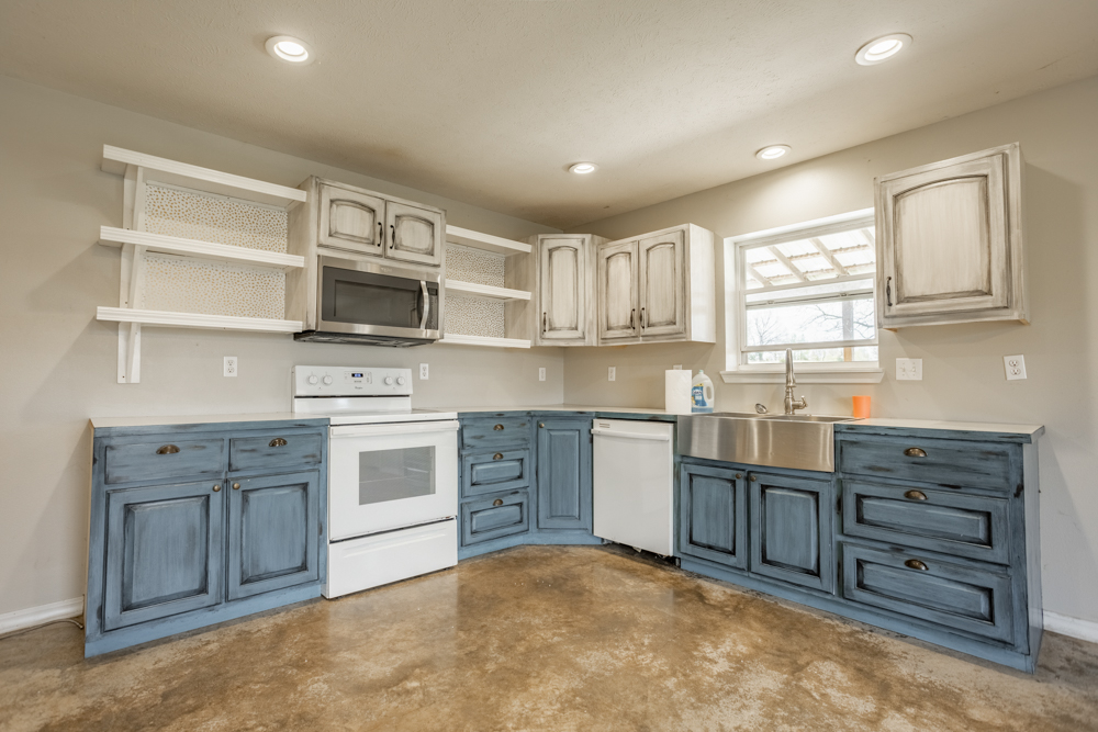• Living space includes a kitchen, a living area, one bedroom, and one bathroom