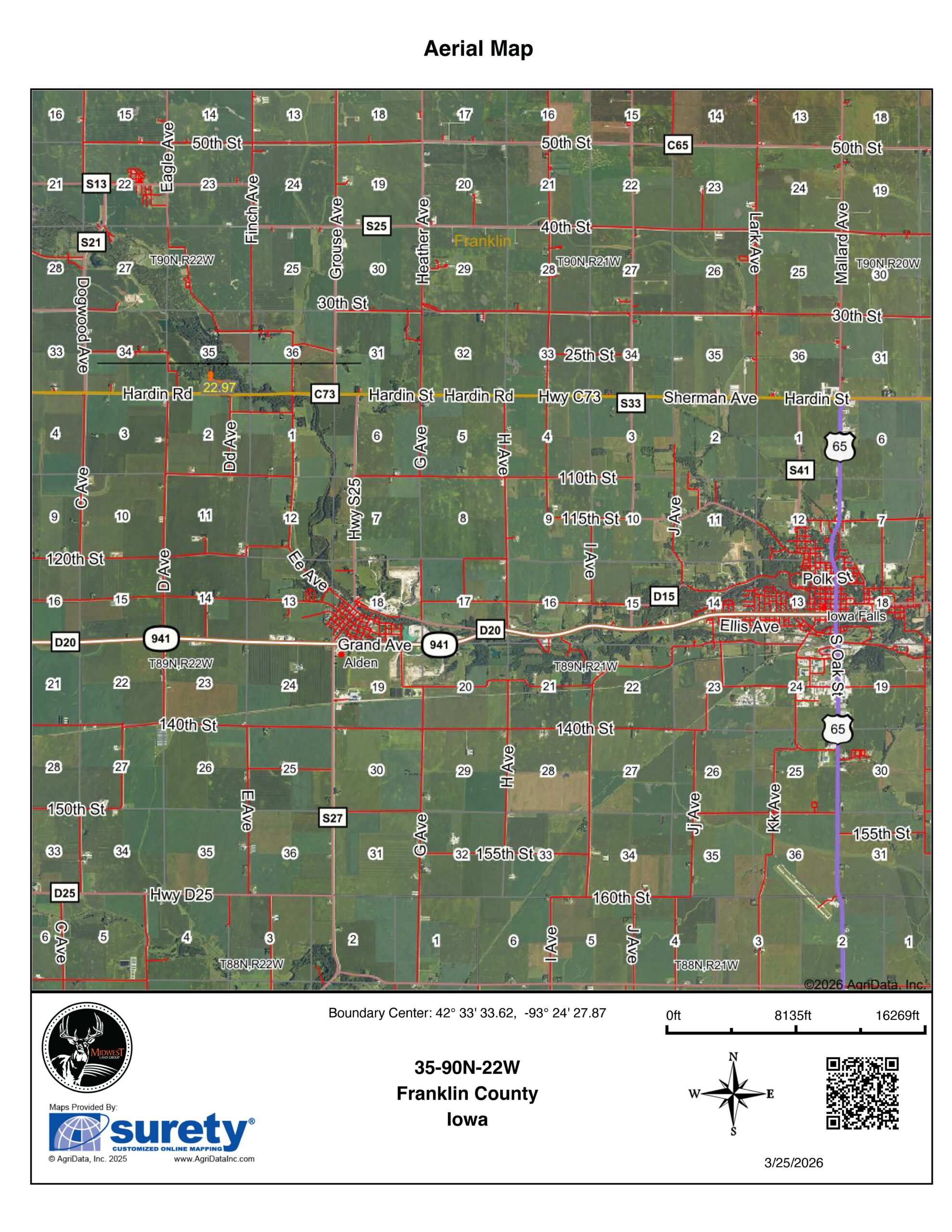 Conveniently located just 3.5 miles from Alden, 9 miles from Iowa Falls, 50 minutes from Clear Lake, and a little over an hour from Des Moines, this property combines peaceful country living with accessible amenities. Whether you’re looking to build, invest, or create a recreational getaway, this beautiful tract offers the possibilities you are looking for in a highly sought-after region of Iowa.
