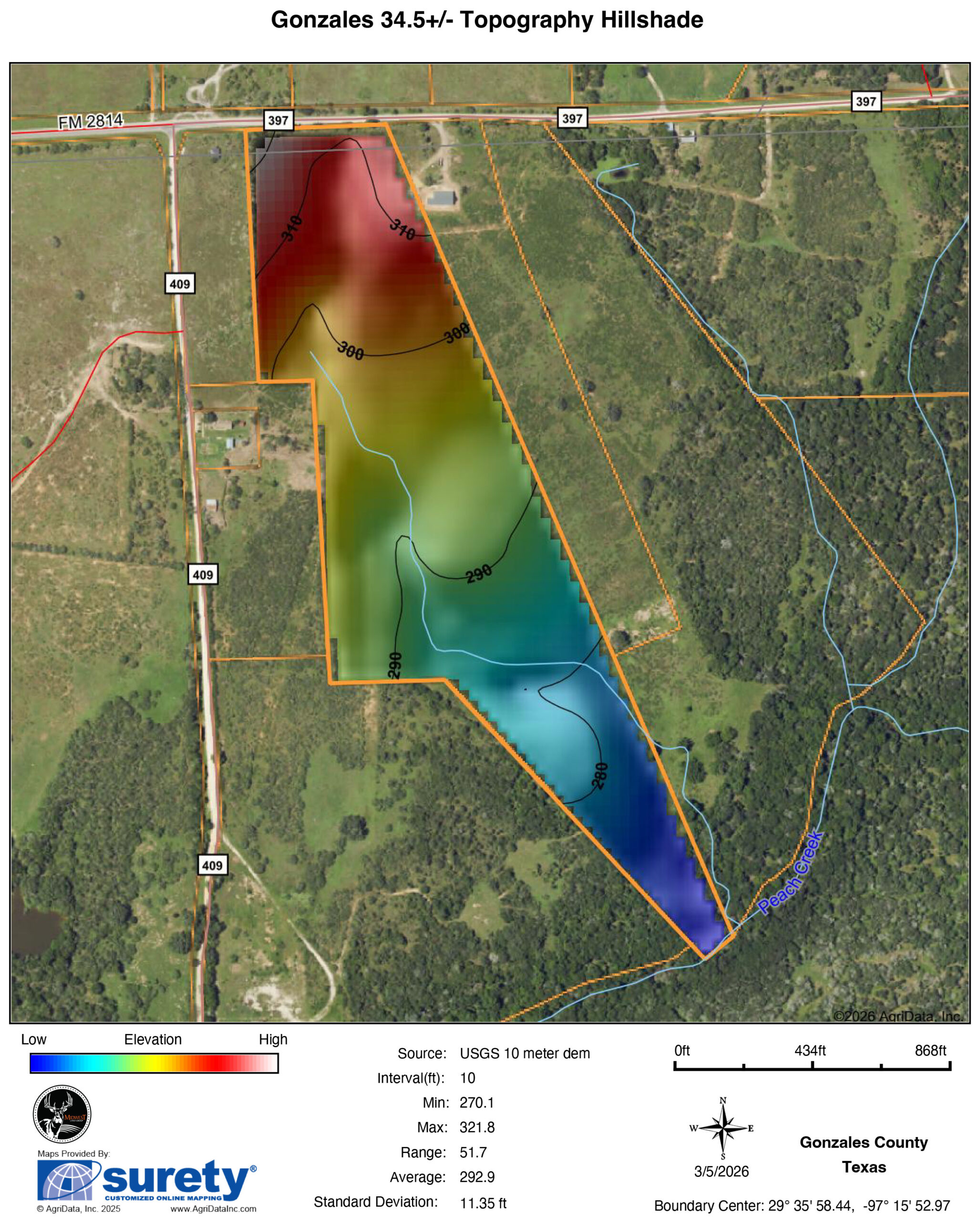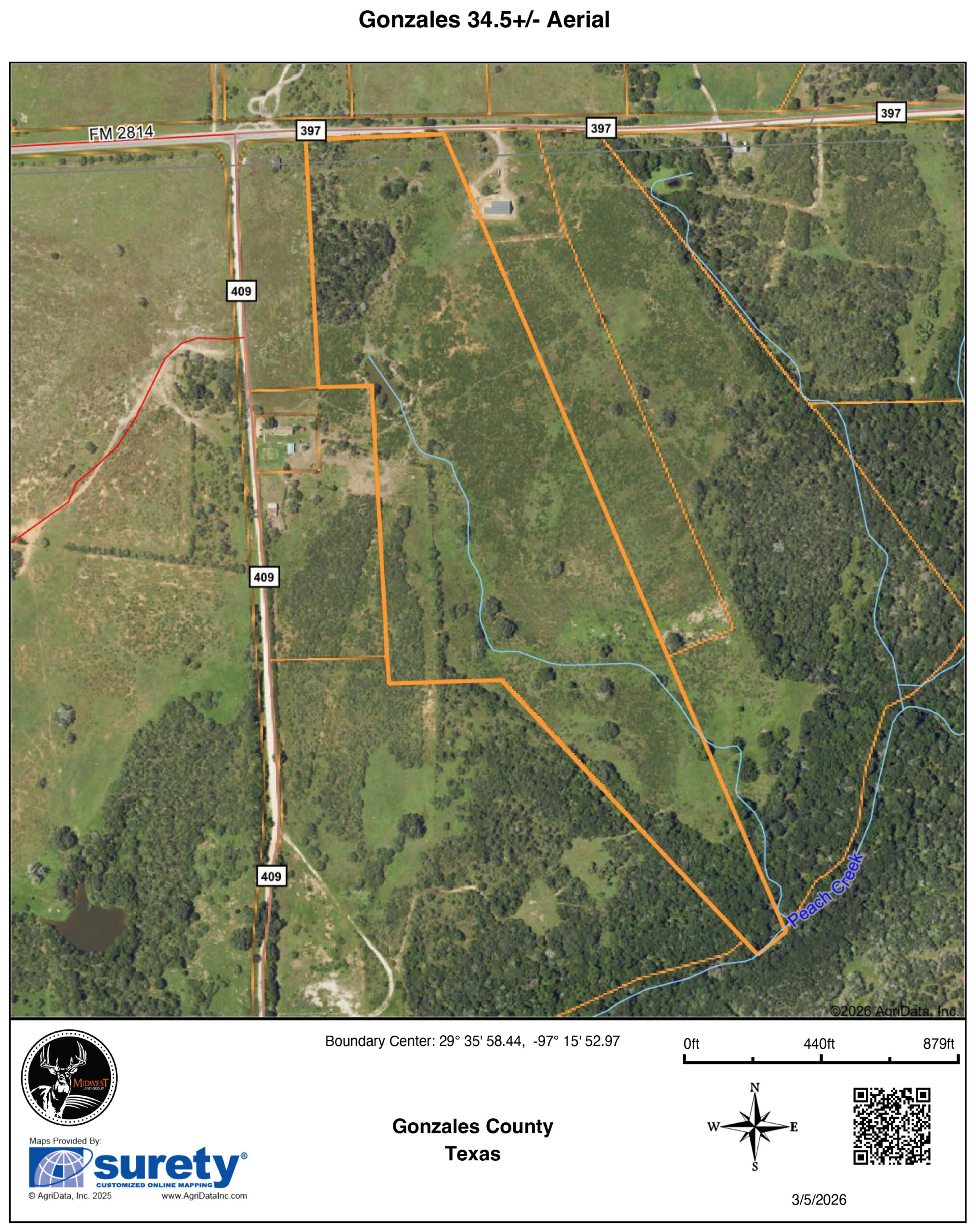 Set in the rolling countryside of Gonzales County, Texas, this beautiful 34.5 +/- acre tract offers the perfect blend of privacy, natural character, and convenient access to nearby cities. The property is centrally located, just 90 minutes from Austin and San Antonio and about two hours from Houston, making it ideal for a full-time residence or a relaxing weekend retreat. With county road access on a quiet road and only 6 miles from I-10, you can enjoy peaceful country living without sacrificing accessibility. Electricity is available, making it even easier to bring your vision to life.The land features a gentle slope with more than 50 feet of elevation change, creating scenic views and several excellent potential homesites. A wet-weather creek winds through the back corner of the property, while a stock tank provides an additional water source that can attract wildlife. The landscape consists of brushy pasture dotted with mature oak and mesquite patches, offering a balance of open space and natural cover.