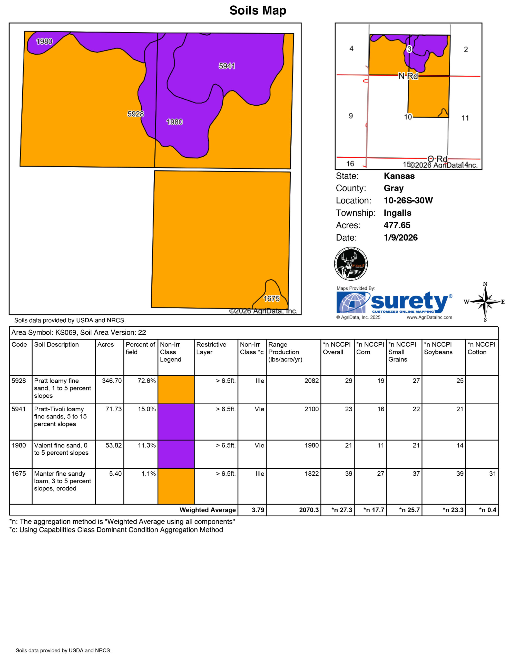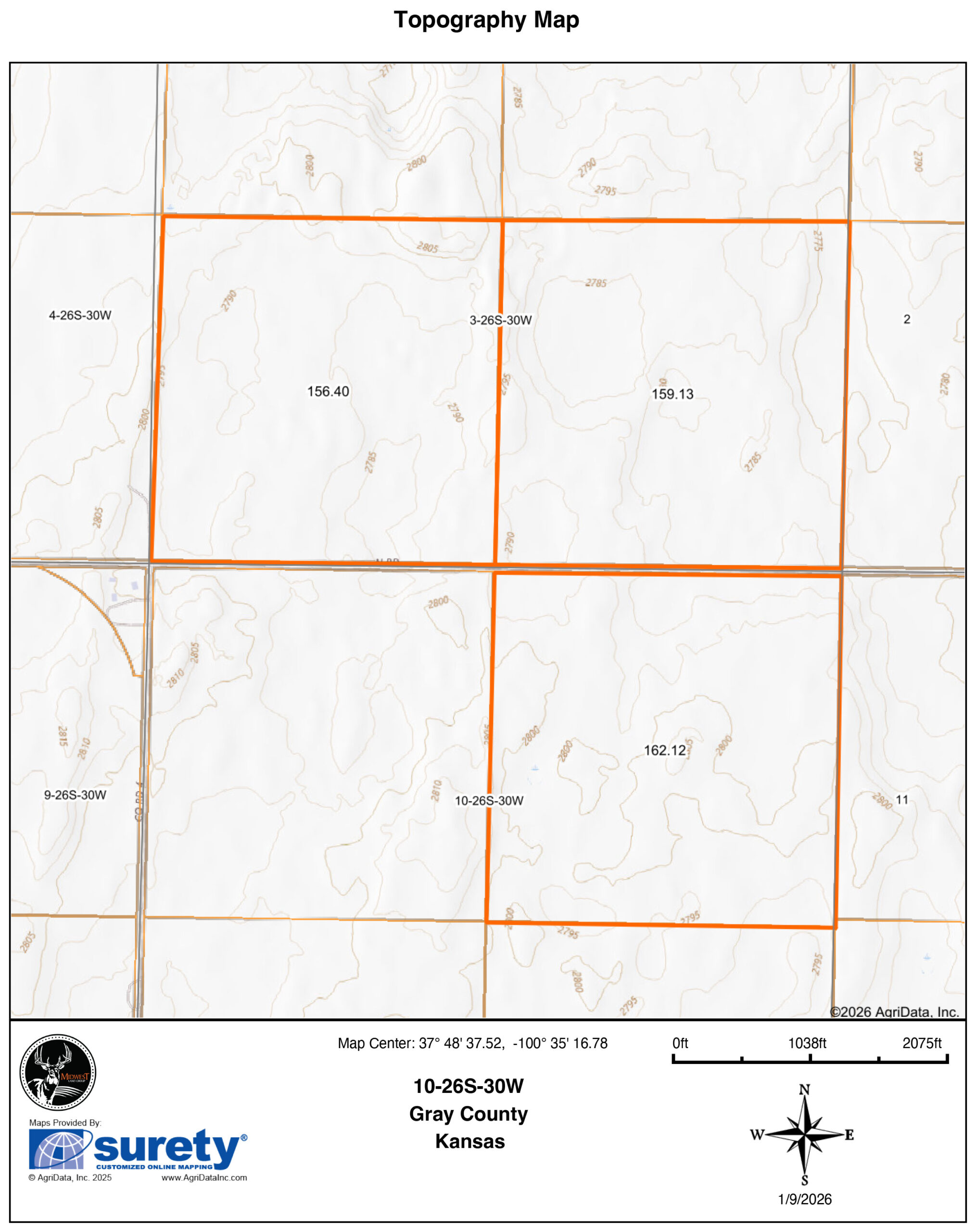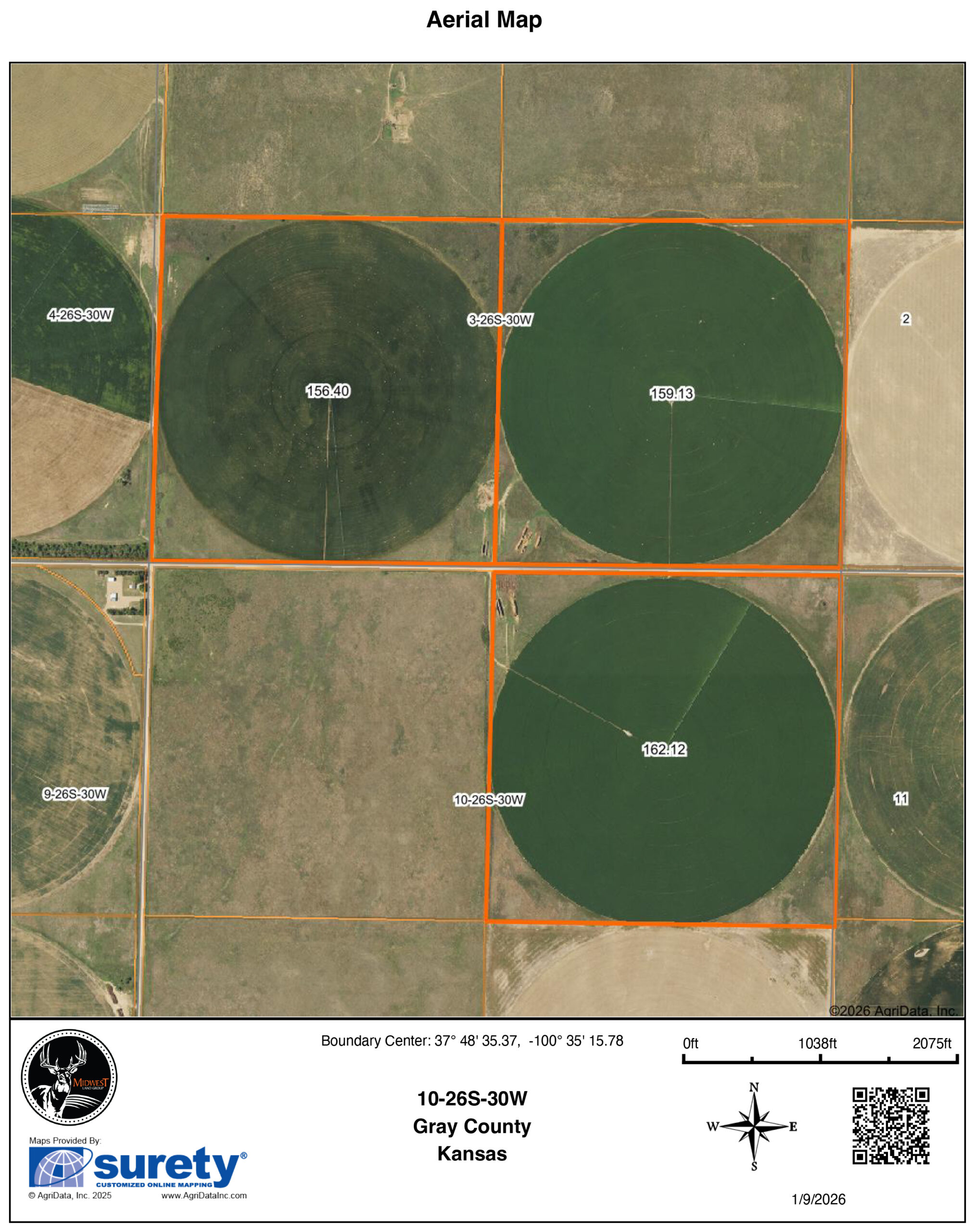 This productive irrigated farm consists of three contiguous quarters of 477 acres located in western Gray County, Kansas, just four miles south of Charleston. The property includes the south half of Section 3, Township 26 South, Range 31 West, and extends south across N Road into the northeast quarter of Section 10. The contiguity of these three quarters creates an efficient, large-scale farming operation in a highly desirable agricultural area.The sale includes 100 percent of the seller’s owned mineral rights, immediate possession of the current crops, including the planted wheat, and all irrigation equipment. The farm has been meticulously maintained by the current owner and reflects exceptional pride of ownership throughout.