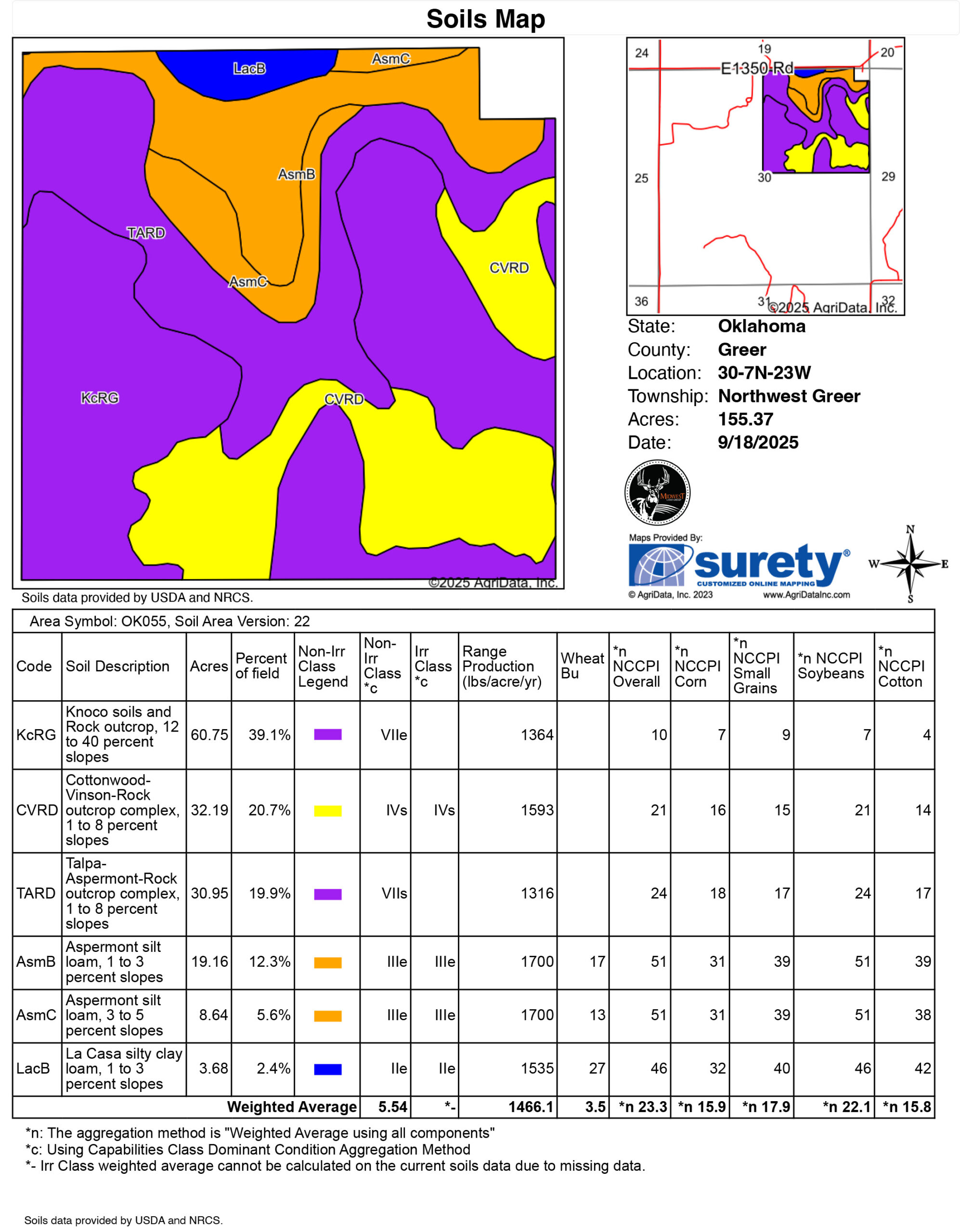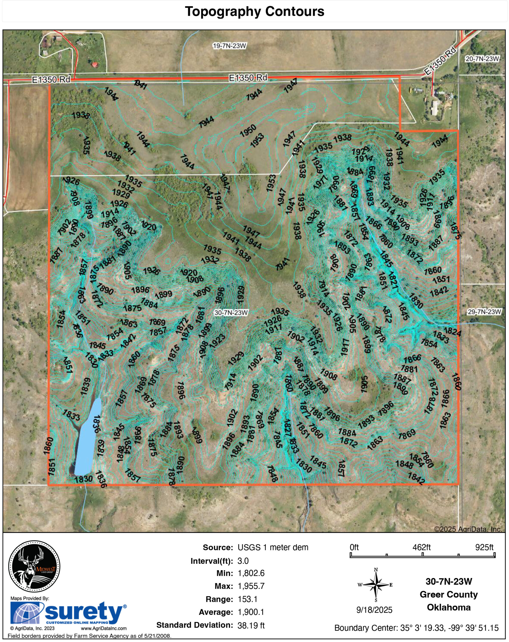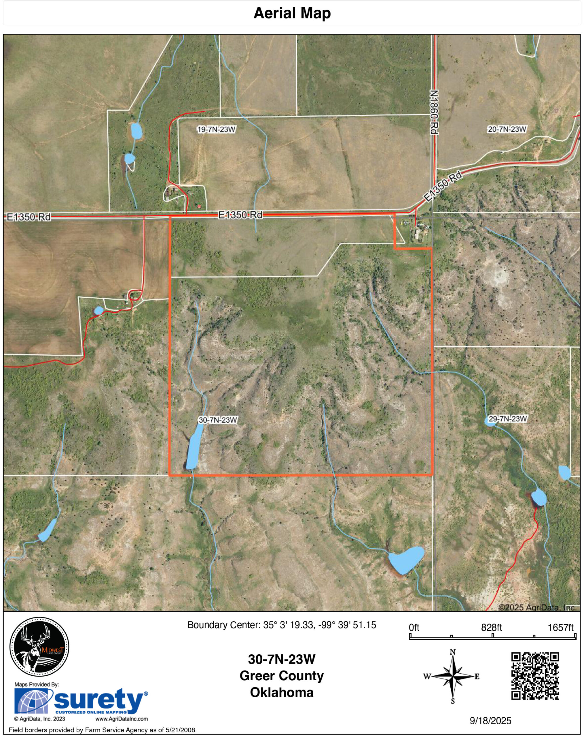 Discover this outstanding 155 +/- acre property located just west of Willow in scenic Greer County, Oklahoma. This diverse tract offers over 150 feet of elevation change with breathtaking southern views extending to the distant Wichita Mountains. The property features convenient blacktop road frontage along its northern boundary, with electricity and rural water readily available at the road, as well as a newly installed gate for easy access. A one-acre pond nestled in the southwest corner of the property adds to its appeal and provides an excellent water source for wildlife.The land boasts exceptional habitat diversity, with over 30 acres of prime Class II and III soils perfect for establishing food plots to enhance wildlife management. Native tree species include cottonwood, willow, hackberry, elm, mesquite, and redberry juniper, creating varied cover and food sources throughout the property. Two major drainages run north to south along the eastern and western boundaries, forming natural travel corridors that lead to expansive mesquite flats and adjacent agricultural fields. A seasonal spring flows through the western drainage down to the pond, providing an additional natural water source. The topography transitions beautifully from open grass pastures and small mesquite flats at the higher elevations down to dramatic gypsum hills that drop into the large drainage systems.