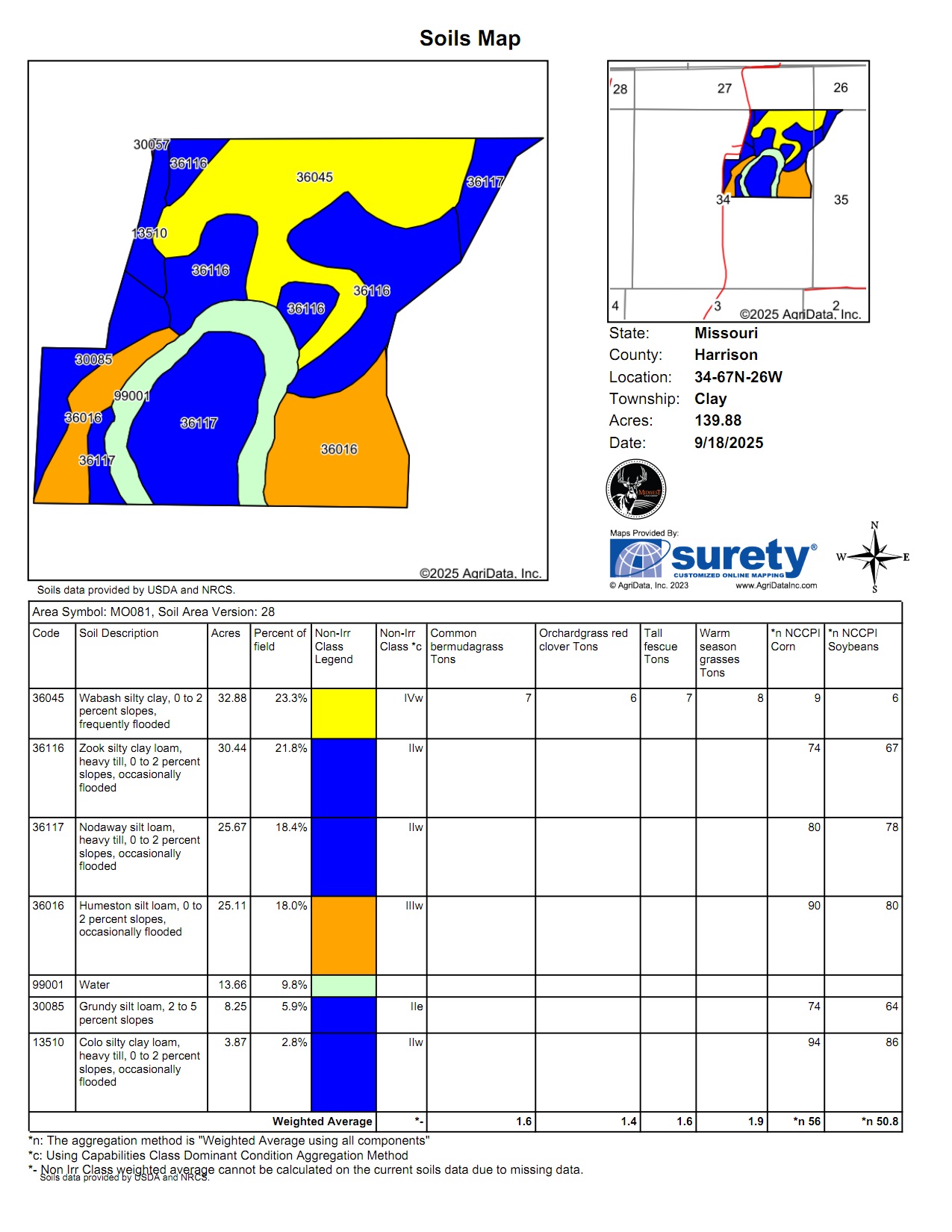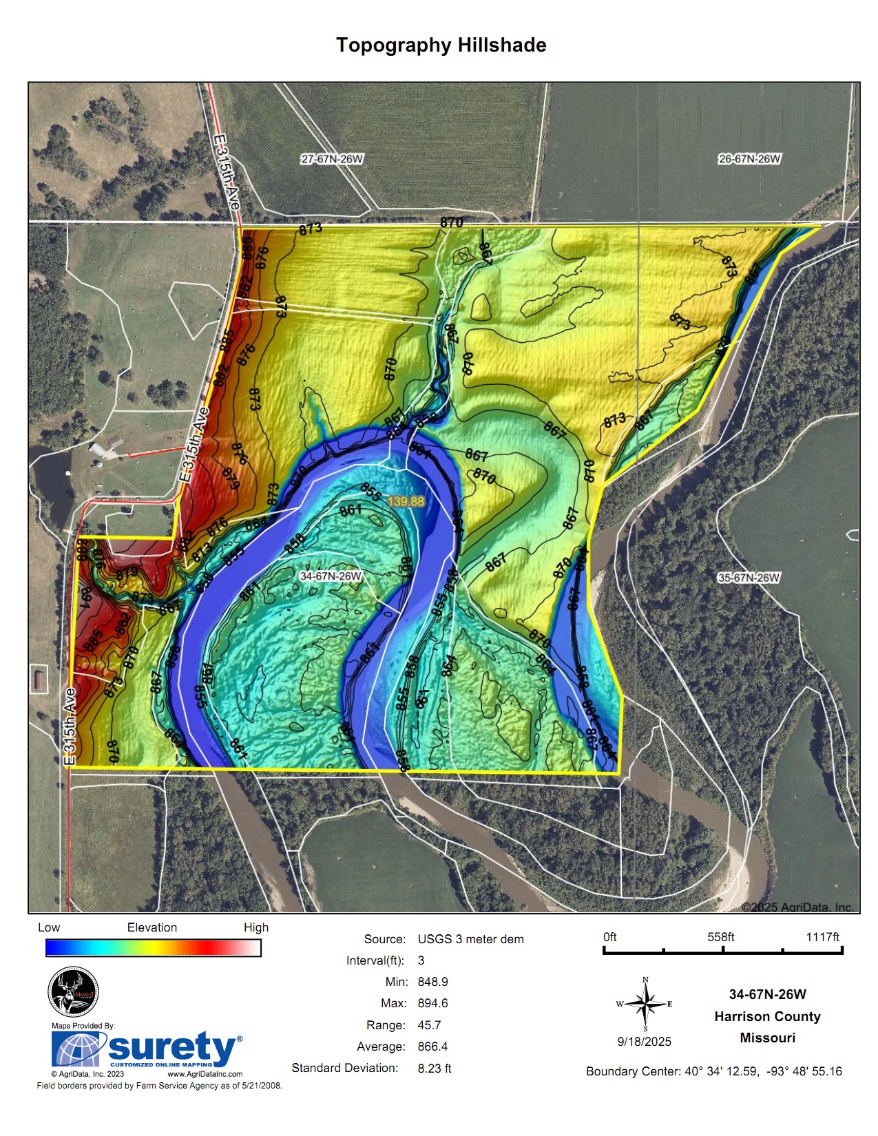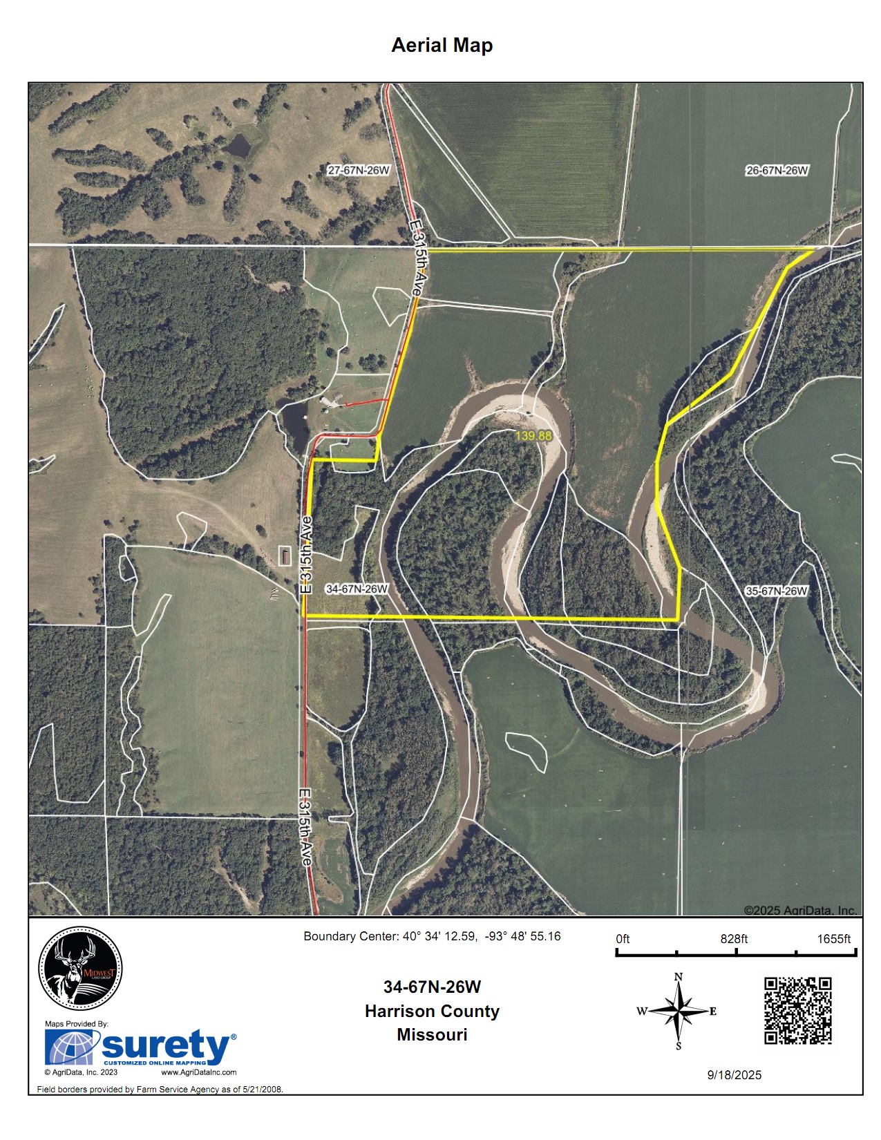 Midwest Land Group is proud to present this amazing 130 +/- acre combination farm located just 1/4 mile south of the Iowa line in Harrison County. The farm features 65 +/- acres of productive bottom ground that you could add to your current operation or will provide significant income for an investor or hunter. The Thompson River borders the east side of the farm and then meanders back into the property in the center, providing nearly a mile and a quarter of riverfrontage. The farm also features 5.1 acres enrolled in CRP on the southwest corner, providing added cover and an additional $600 income annually. The farm currently has open tenancy for 2026.When it comes to hunting, this one is a showstopper. With its proximity to Iowa, the food, cover, and water availability, the stage is set. With three separate blocks of timber on the south end of the farm and the CRP, ample bedding and cover for multiple bucks are present. With predominantly large landowners surrounding the farm and its seclusion, this property is a rare gem in a proven giant-producing neighborhood of northern Missouri. For more information or to schedule your private tour of this incredible farm, give Land Agent Brad Prater a call today.