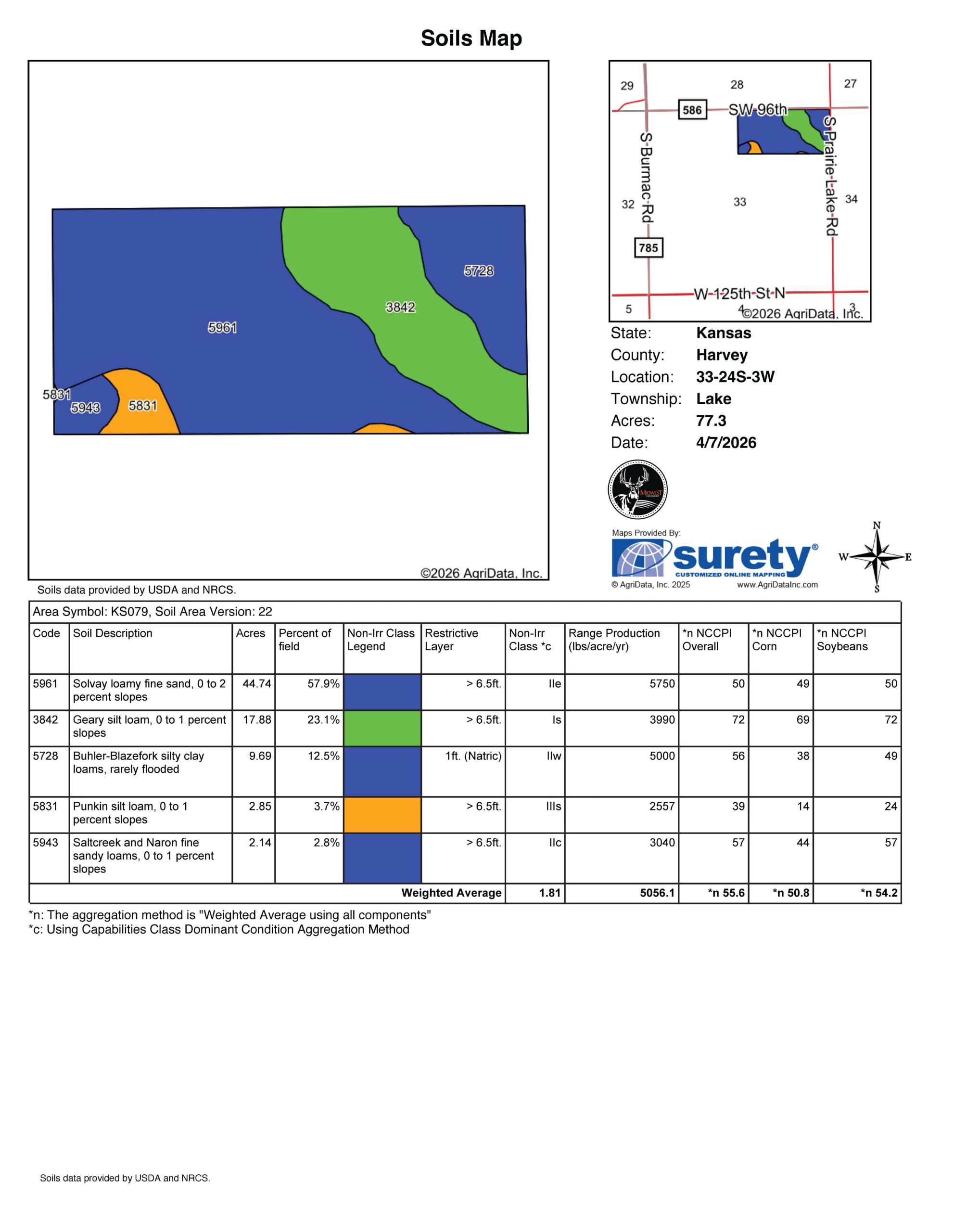 The farm is predominantly flat with a short waterway in place to improve drainage and usability. The soil profile is strong, highlighted by Class 2 Solvay loamy fine sand (57.85%) and Class 1 Geary silt loam (22.9%), along with additional productive soils. The overall NCCPI average for this farm comes in at 55.93, making this a strong producer.