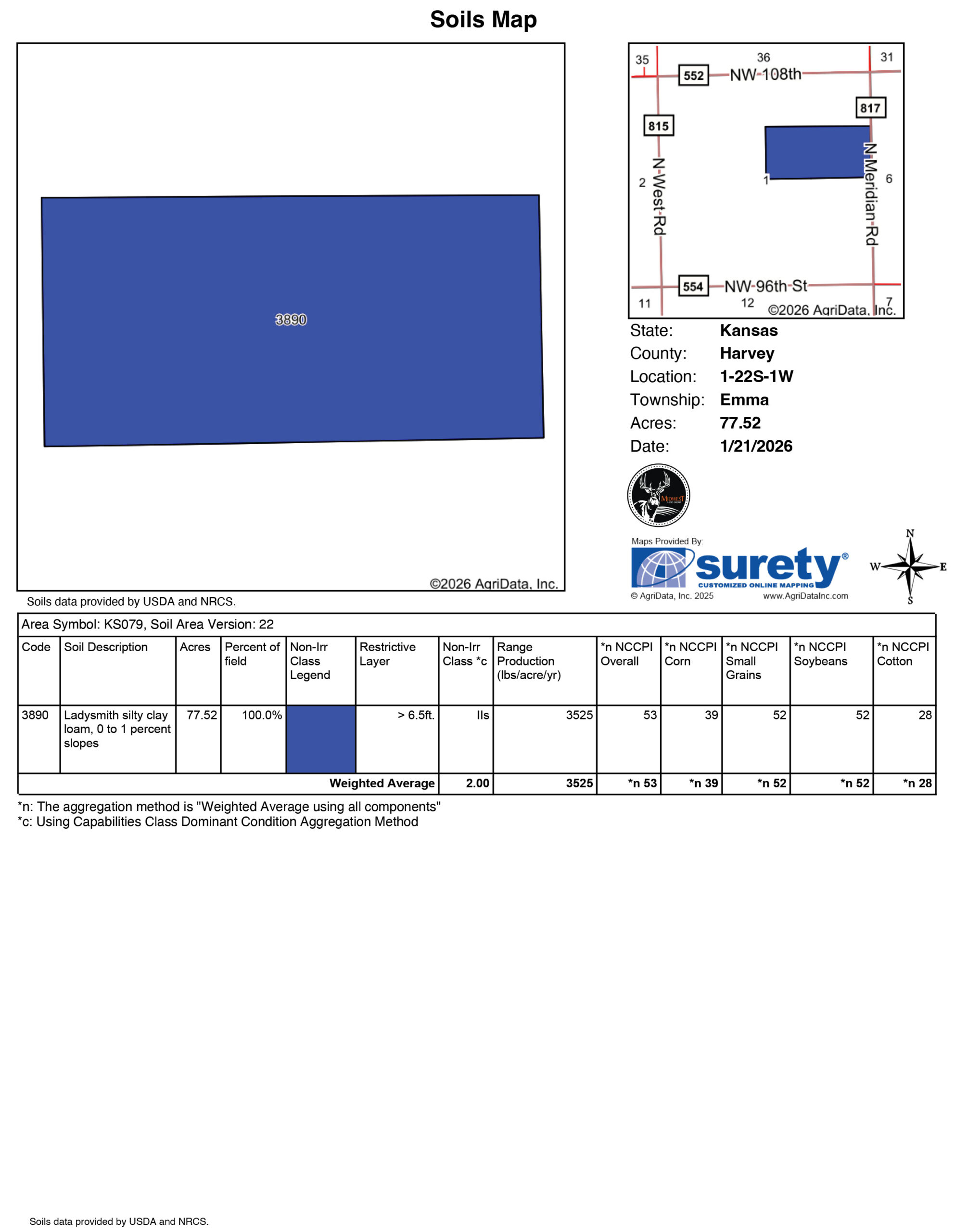 This beautiful, flat, Class 2, 80 +/-acres of tillable farm ground is the perfect addition to your farming operation! Comprised of 100% Class 2 Ladysmith silty clay loam soil, the NCCPI averages and annual production capabilities are strong. With a spring crop in the works, you could plan to take over after the fall harvest. Having an experienced tenant in place, one should also consider this property as a solid investment for their portfolio.Conveniently located on the well-maintained North Meridian Road, just 3 miles east and 1.5 miles north of Hesston, this would make an ideal location for anyone wanting to build in the country and stay close to town. A clean slate to lay out your dream homestead!