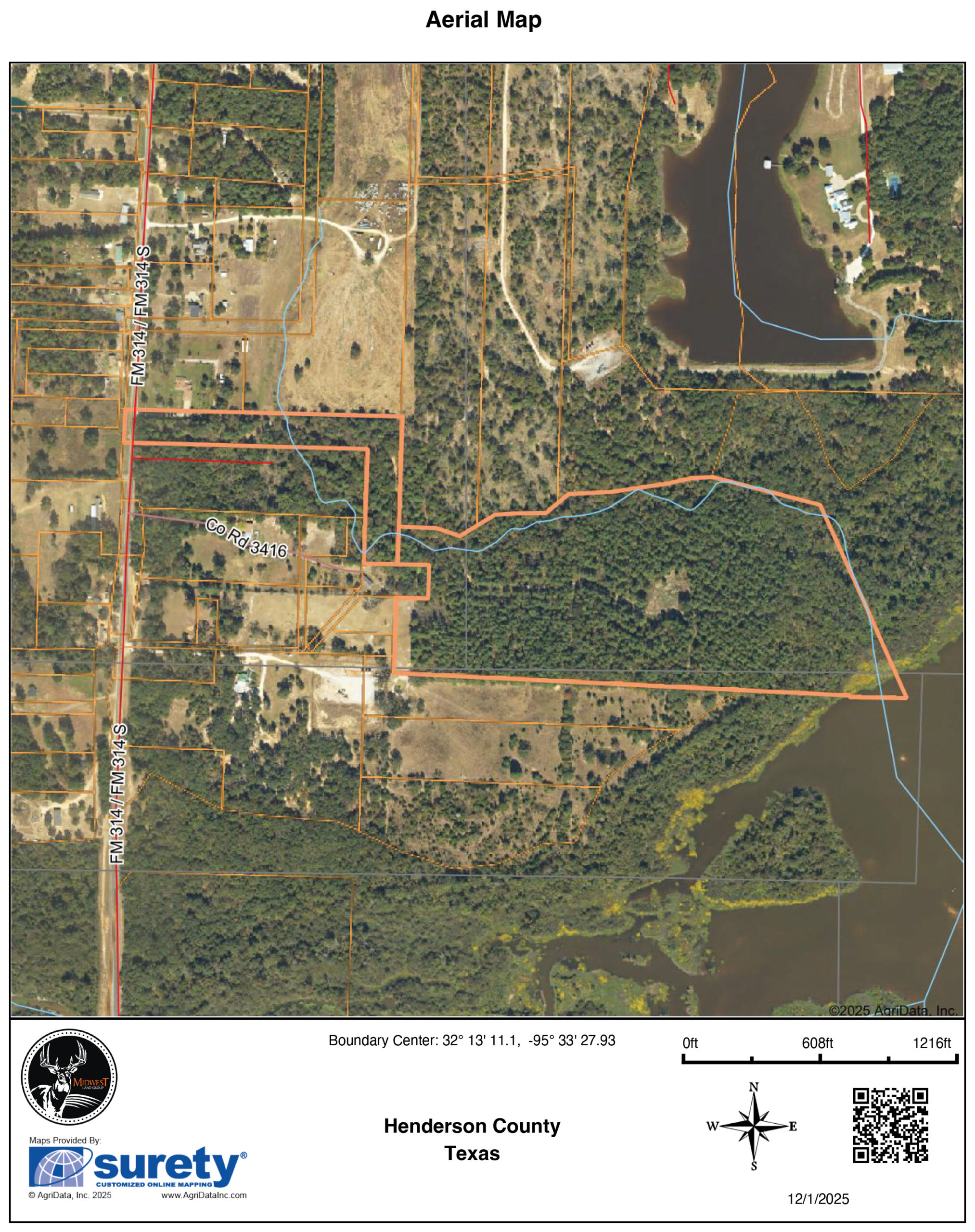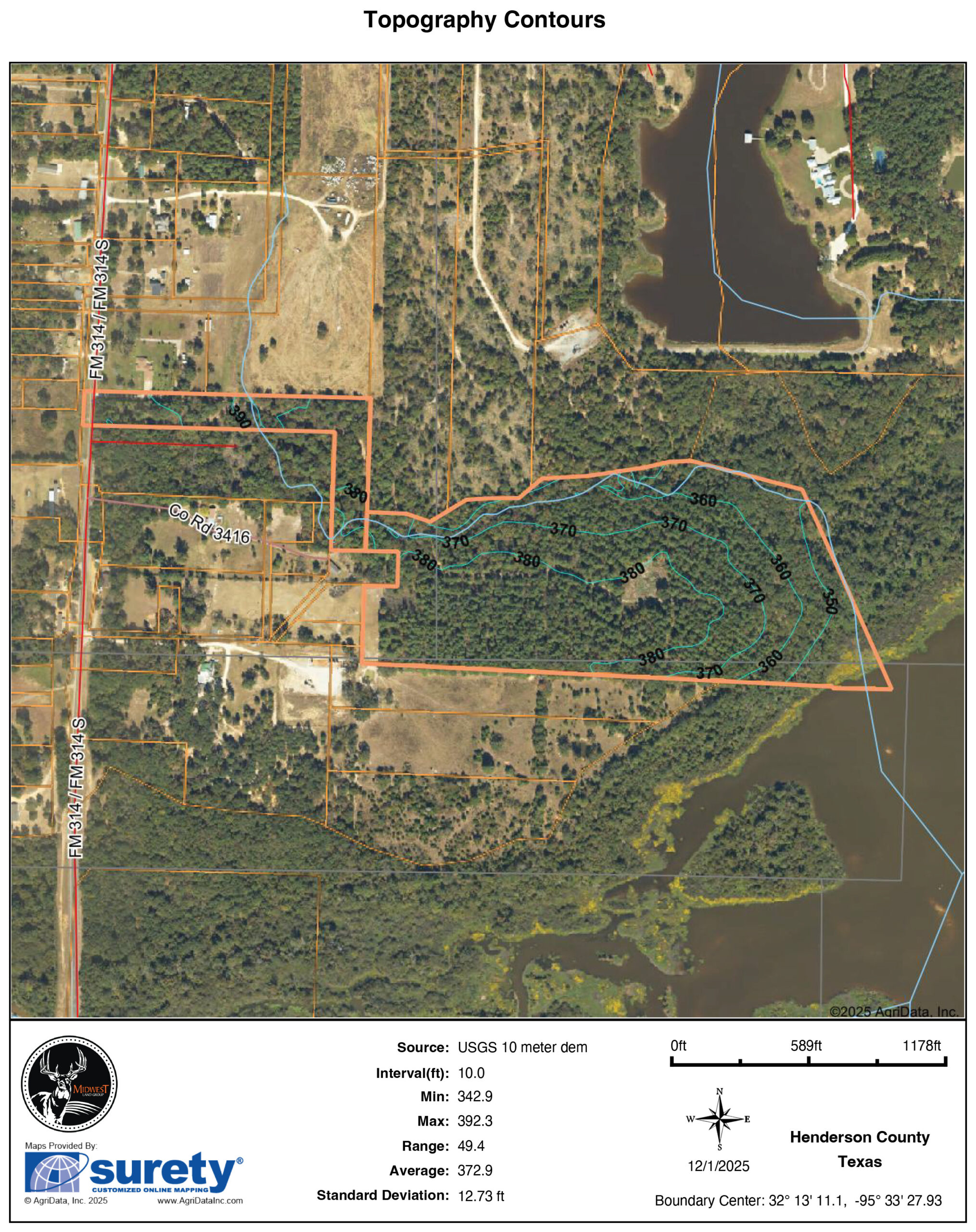 37.44 acres of lakefront property on Lake Palestine in the Flat Creek area; an increasingly rare opportunity to own acreage directly on the water.This timber exempt property features approximately 50 feet of elevation change, giving it character and versatility with elevated build sites and natural slopes leading down to the shoreline. According to the Upper Neches River Municipal Water Authority, the boundary at the lake generally follows the 355-foot elevation contour. Dock or boathouse construction is allowed in accordance with their permitting and guidelines.